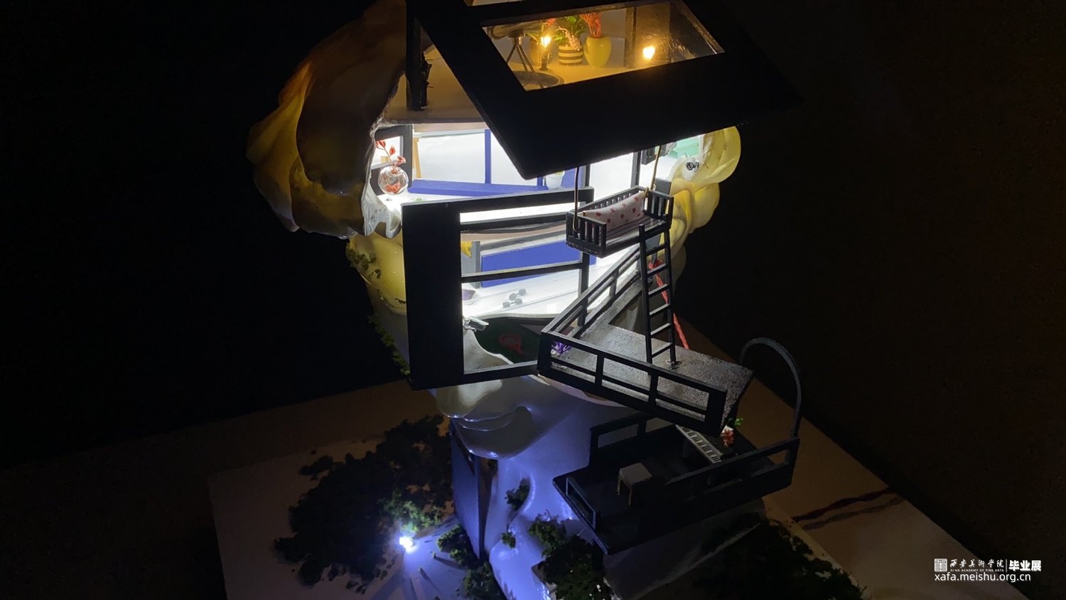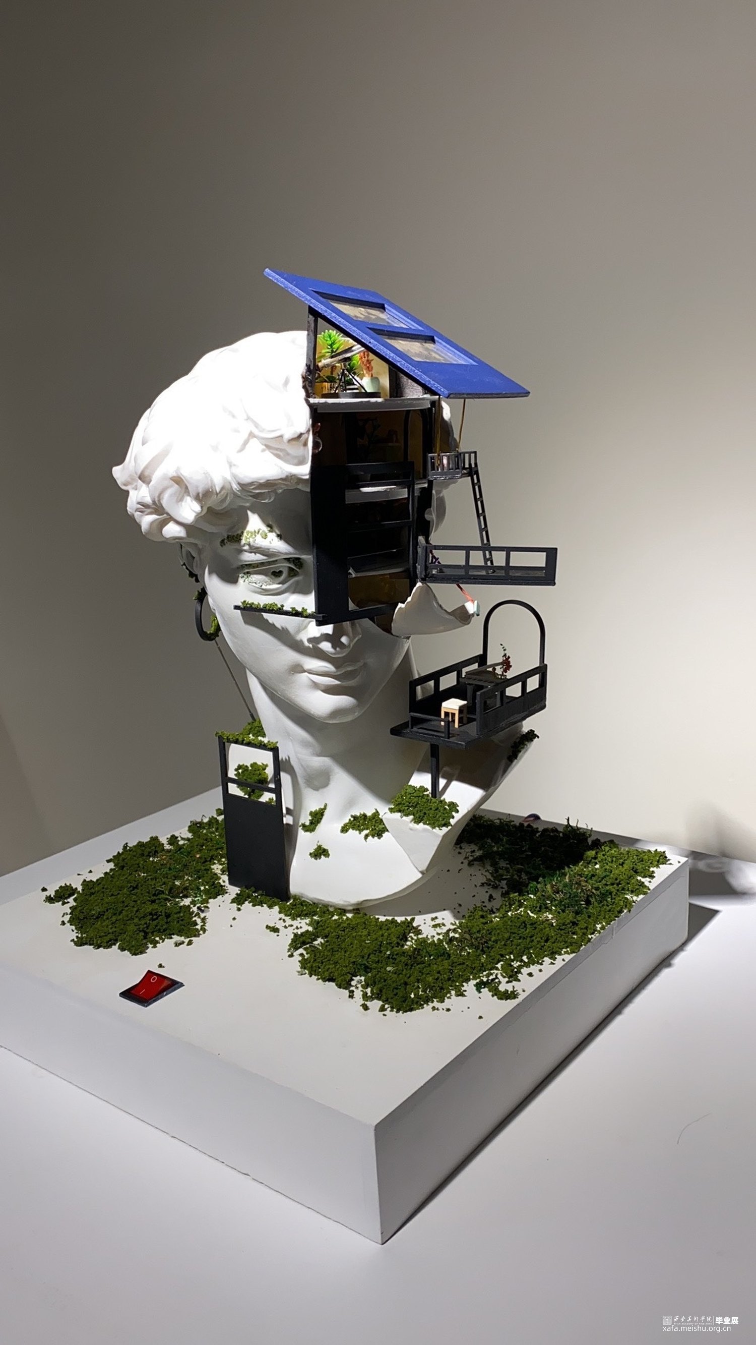 这些基于自然和哲学思考下的物质与精神的隐秘关系。而源自希腊古老文明的历史元素以大卫模型为载体,更多的是被用来表达我更为复杂的精神和文化内核,我将以它为起点,探讨有关空间、时间、与距离的问题,唤起的观众内心深处最原始的情感与精神共情,它的缩小性让大卫石膏像消失在周围环境中。观众在作品面前从不是被动地站着,可以伸手启动开关,在交互中意识到自己的视觉、声音、感知被缩小和扭曲时与作品互动。观众的肉身经历与心理经历被成比例缩小并体验着作品,进而将体验的过程内化入心理,重新思索自身与周遭环境的时间与空间关系。在以往的认知被挑战的同时,展开精神领域的深入探索。模型内部的建筑在这里被隐喻为自我。我本可以在一套房子内部装修完成这件作品,但如果这么做就太直白、太具象了,反而不够真诚,这将更多指向叙事,而不足以关乎精神性的潜能。
