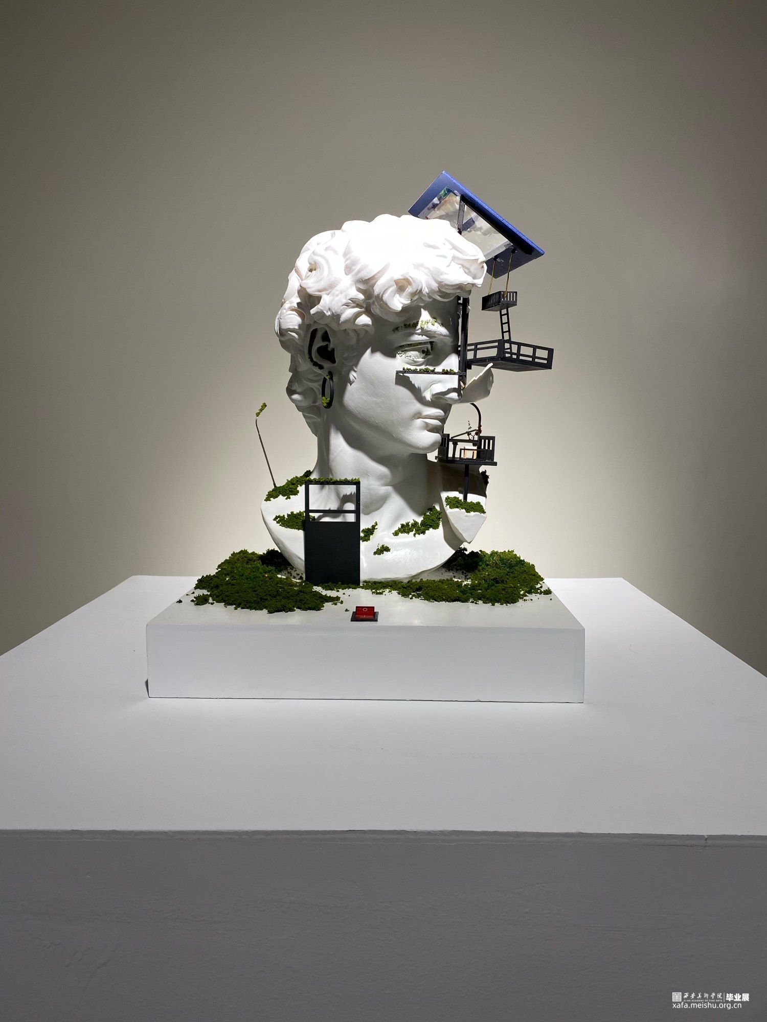 作品以大卫石膏像为主体,建筑从大卫头躯里螺旋升起,被头顶的结界产生的精神力牵引着形成一股至美至痛的“气息”,似如大河上下滔滔,连绵不绝。并无多少悬念的表意让观众在窥视