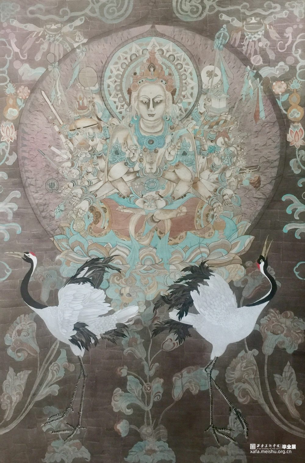 “莲台鹤舞”旨在让公众关注敦煌艺术的保护,尊重文化艺术的传承。作品以灰色为基础色调,营造在洞窟观赏莫高窟壁画的氛围,画面以千手观音为背景,观音手持各色法器,神色淡然安详,悲天悯人,莲花坐下白鹤相依相伴,双双依偎,拟自我对敦煌美学的仰望与敬佩,运用色彩、明暗的对比,使画面富有活力和生机。绘画形式需要自己去琢磨,寻找自己的绘画语言特征,保持自己的纯洁性和自觉性,探