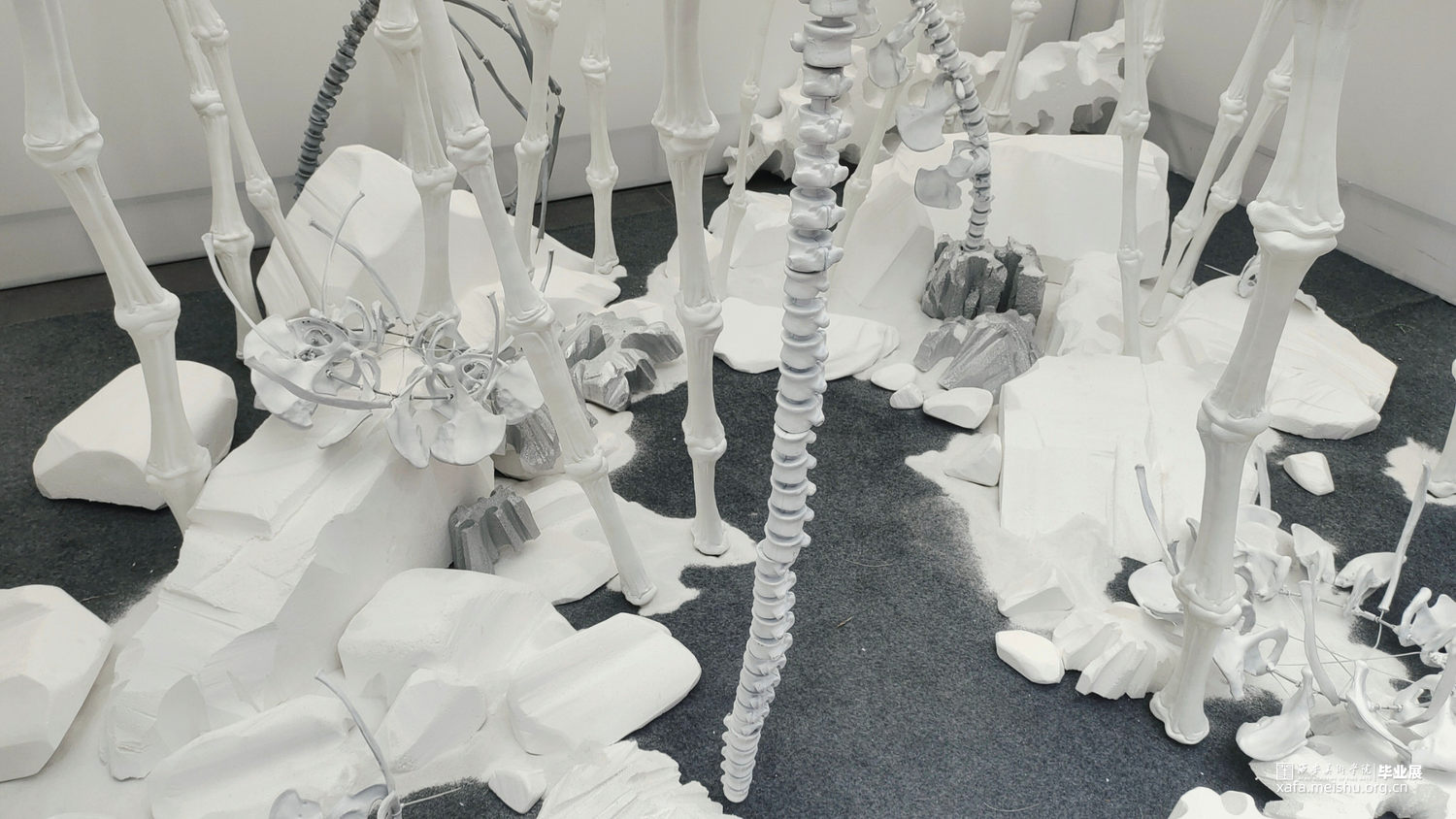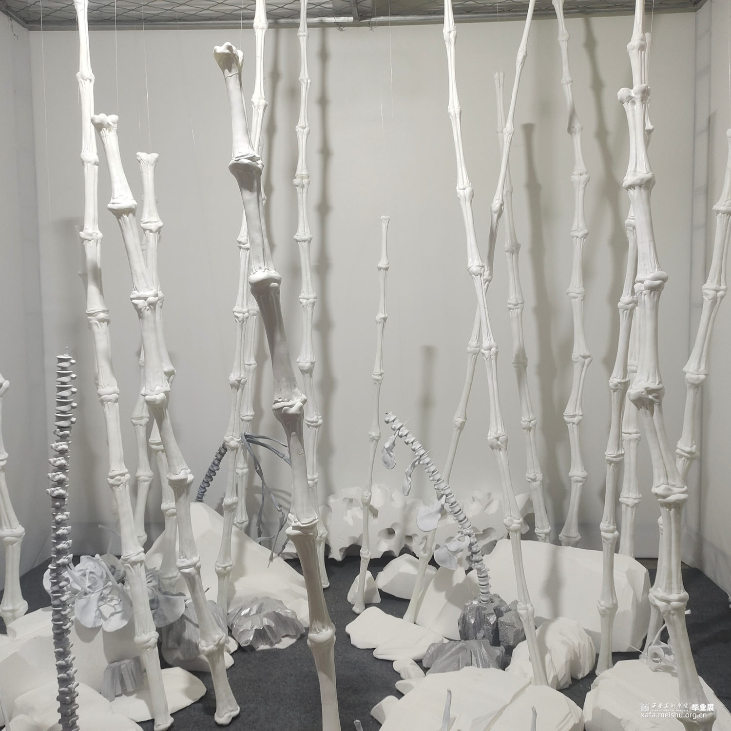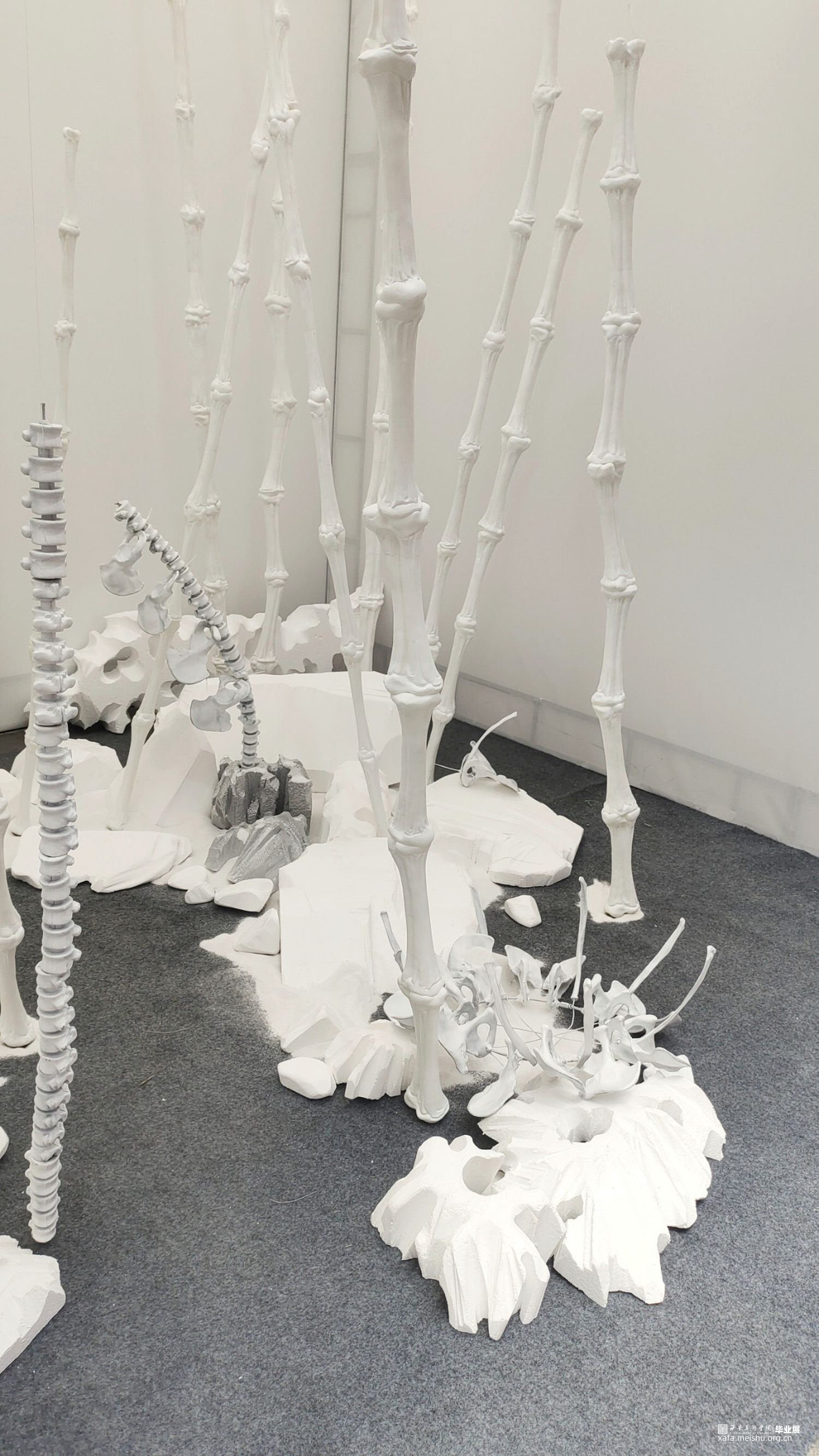 骨指事物内部起支撑作用的架子,其古字形像骨架相互支撑或骨头相互拼接的样子。骨也是支撑肉体的骨干,首尾相接构成一体,同时象征着人的心,魂和气质,它支撑起我们的身体,可以让我们灵活的行走与生活。当骨头脱离了人体,以另外一种姿态存在,它可以呈现出属于人的特征同时更加丰富的形态,让它们自由的生长,不再赋予其功能与进化的意义,这种精神气质也可以映射到人的生活中,更直观地表达人的情绪与情感。在形式上参考了竹子和花卉的构成,万物共生,让其贴地或向上生长。竹子有着极强生命力以及不断向上延伸的姿态,竹骨部分使用zbrush和3D打印,一共塑造了六种形态的竹骨,让其呈现更加自由的生长方式,通过拼接,让骨头呈现更加丰富的形态。