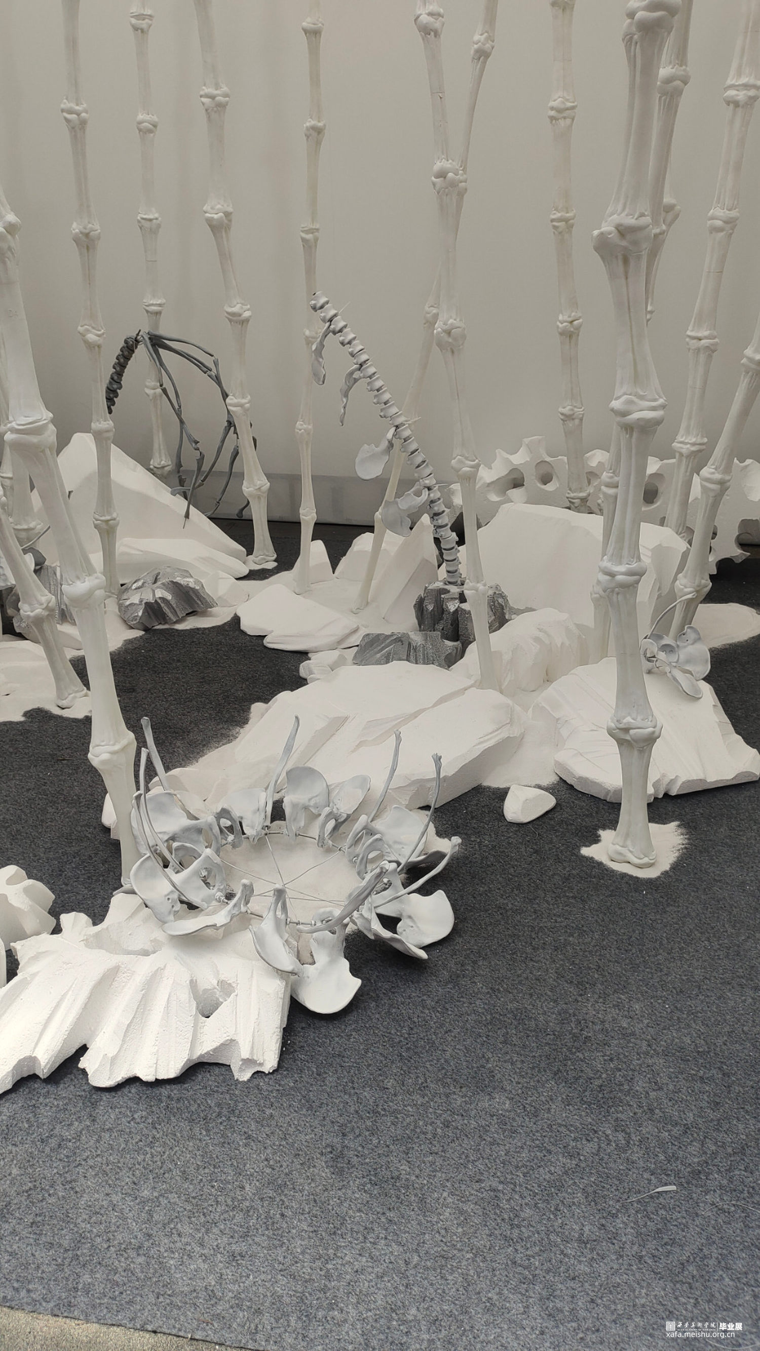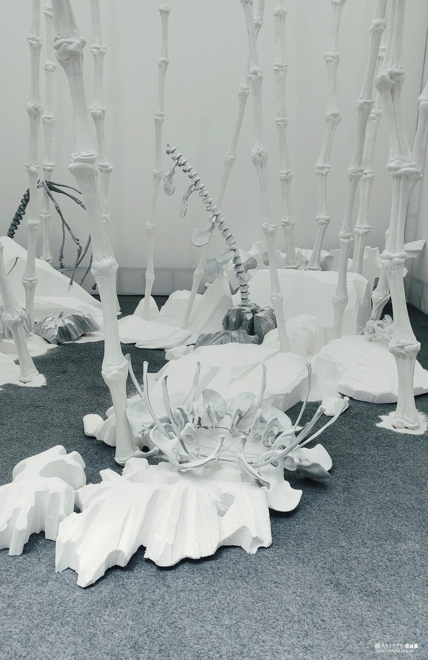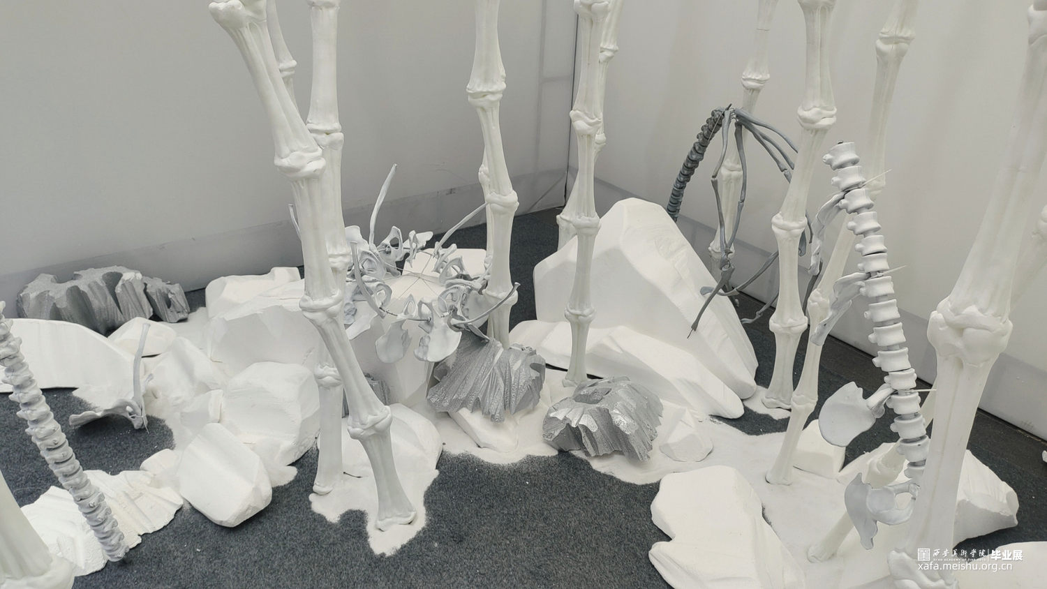 骨指事物内部起支撑作用的架子,其古字形像骨架相互支撑或骨头相互拼接的样子。骨也是支撑肉体的骨干,首尾相接构成一体,同时象征着人的心,魂和气质,它支撑起我们的身体,可以让我们灵活的行走与生活。当骨头脱离了人体,以另外一种姿态存在,它可以呈现出属于人的特征同时更加丰富的形态,让它们自由的生长,不再赋予其功能与进化的意义,这种精神气质也可以映射到人的生活中,更直观地表达人的情绪与情感。在形式上参考了竹子和花卉的构成,万物共生,让其贴地或向上生长。竹子有着极强生命力以及不断向上延伸的姿态,竹骨部分使用zbrush和3D打印,一共塑造了六种形态的竹骨,让其呈现更加自由的生长方式,通过拼接,让骨头呈现更加丰富的形态。