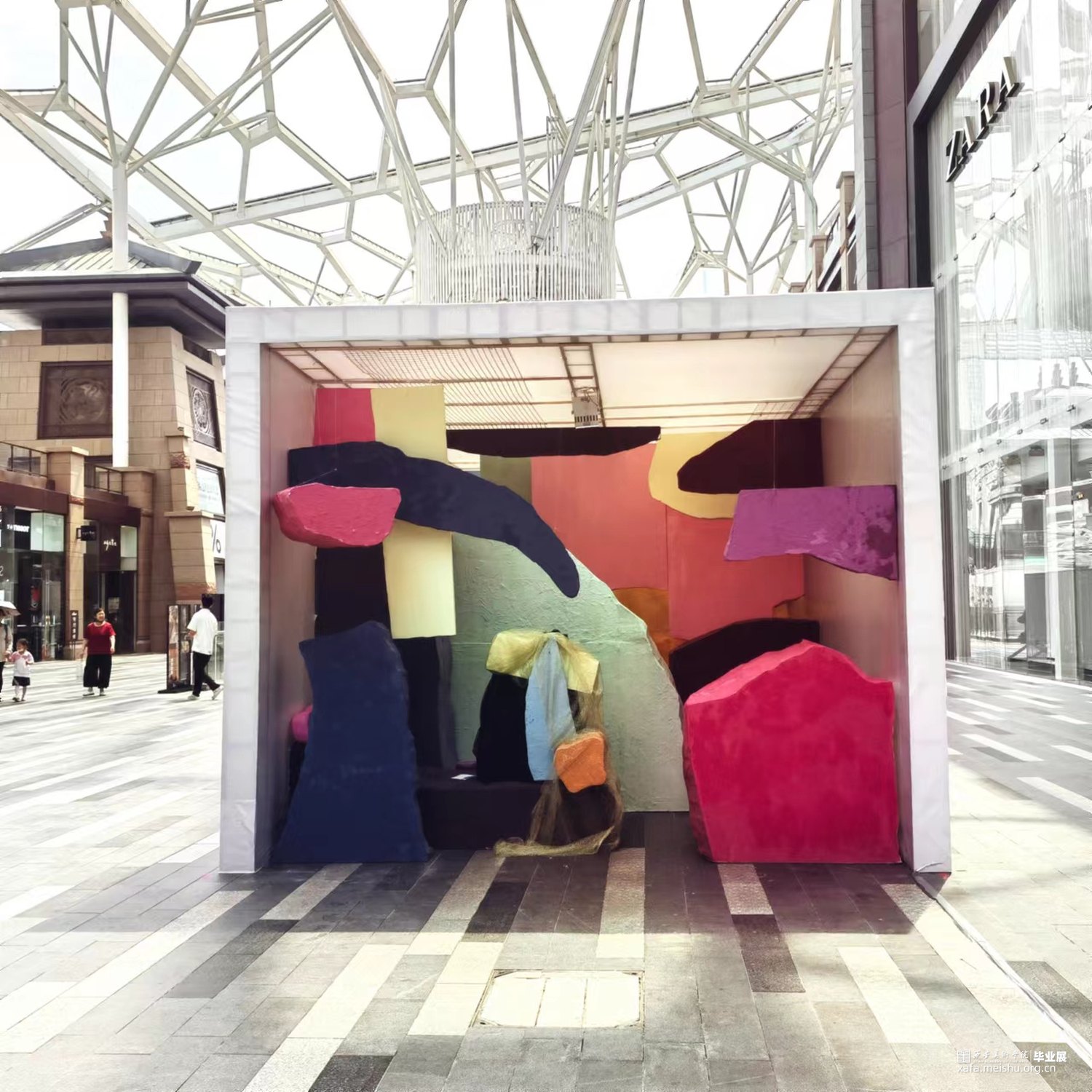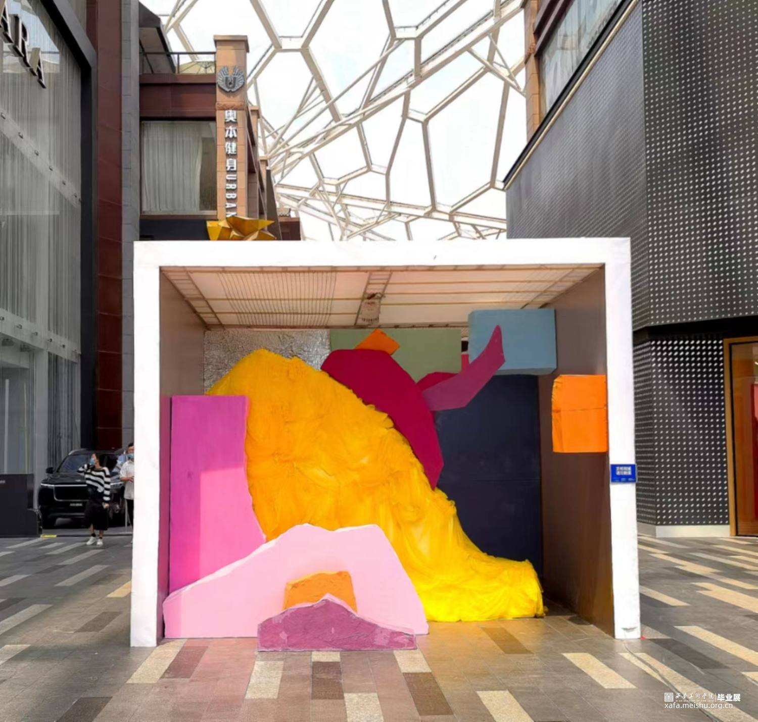 作品将两幅抽象画分成不同的图层与体块,以立体空间的形式展现,形成一个通道,两个方向各一幅抽象画,观众可以穿过、可以让观众身临其中并有所参与。作品意在创造观众与画作的联系,当观众走入作品的时候有一定的参与感,可以穿过画作走向另一个方向,开启观众观看画作的新视角。