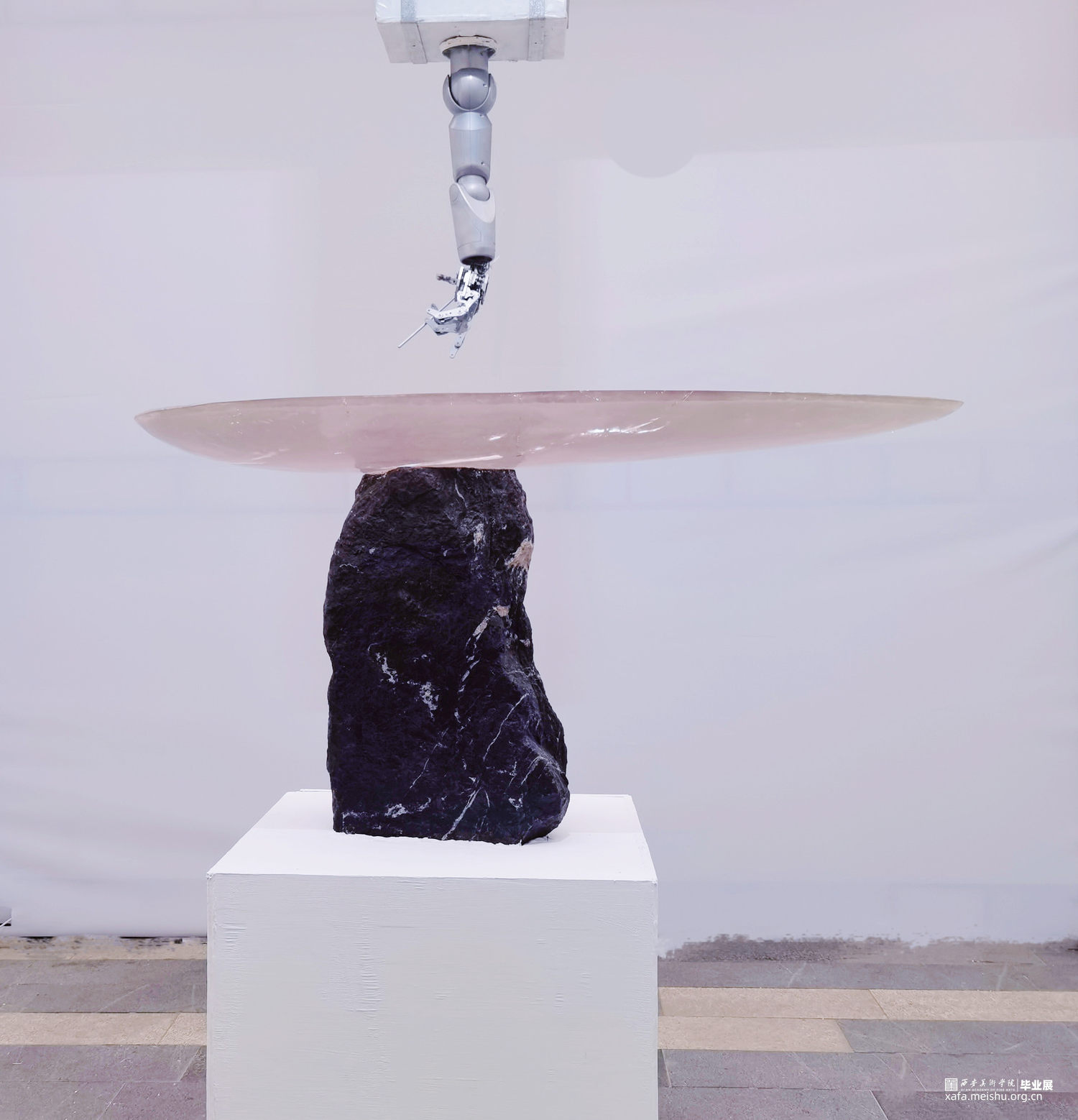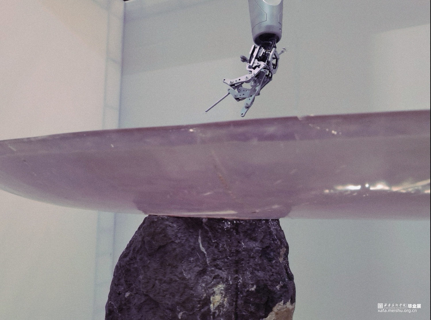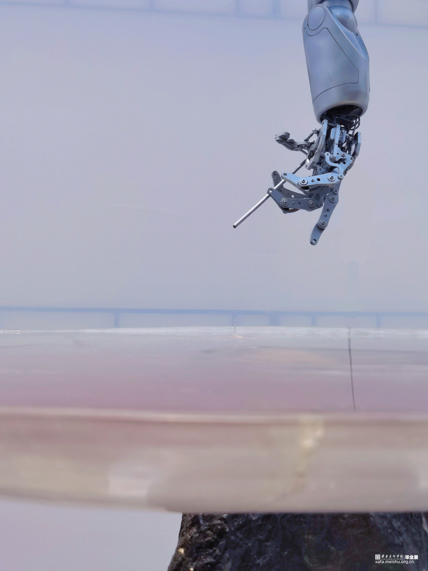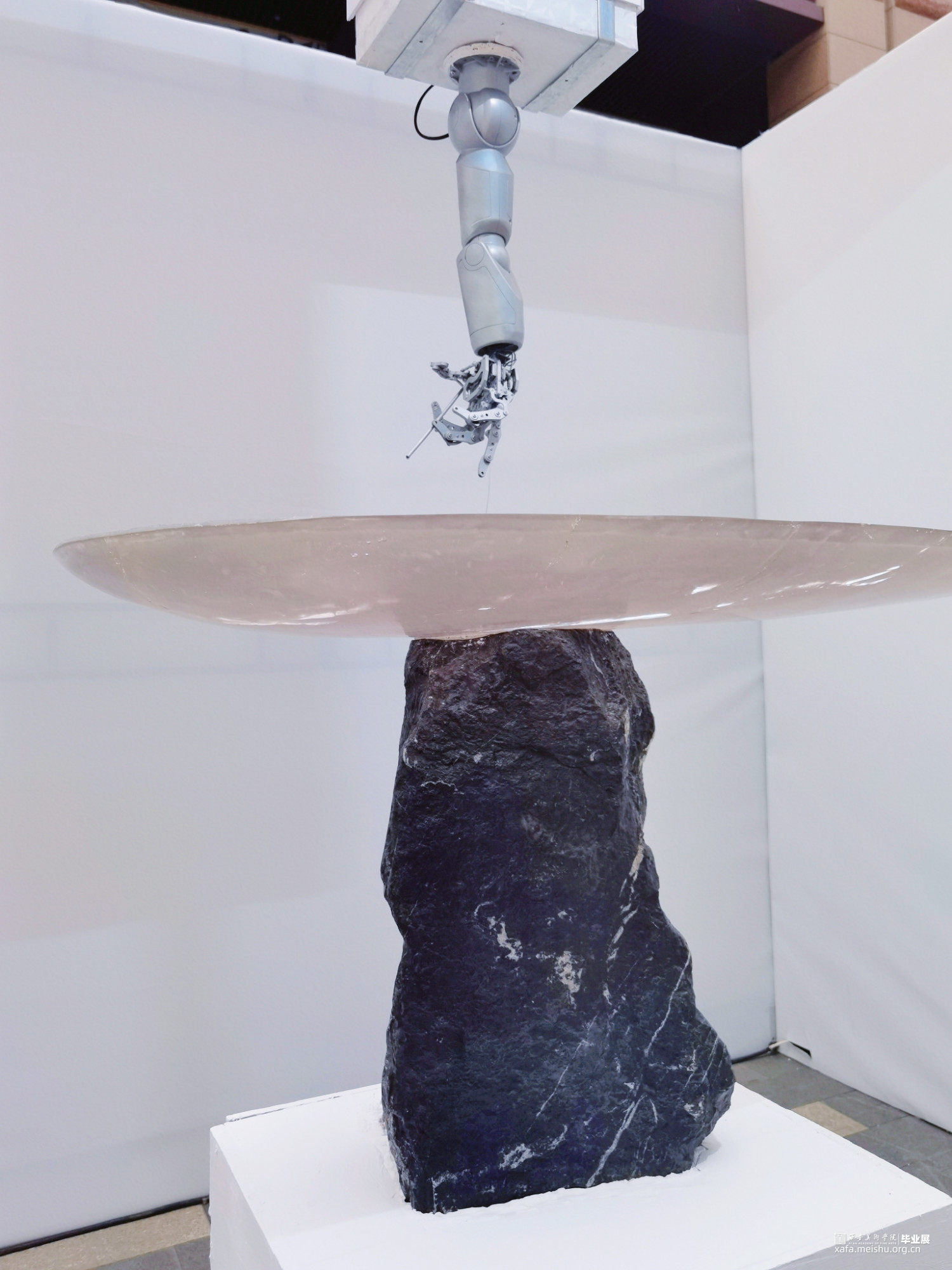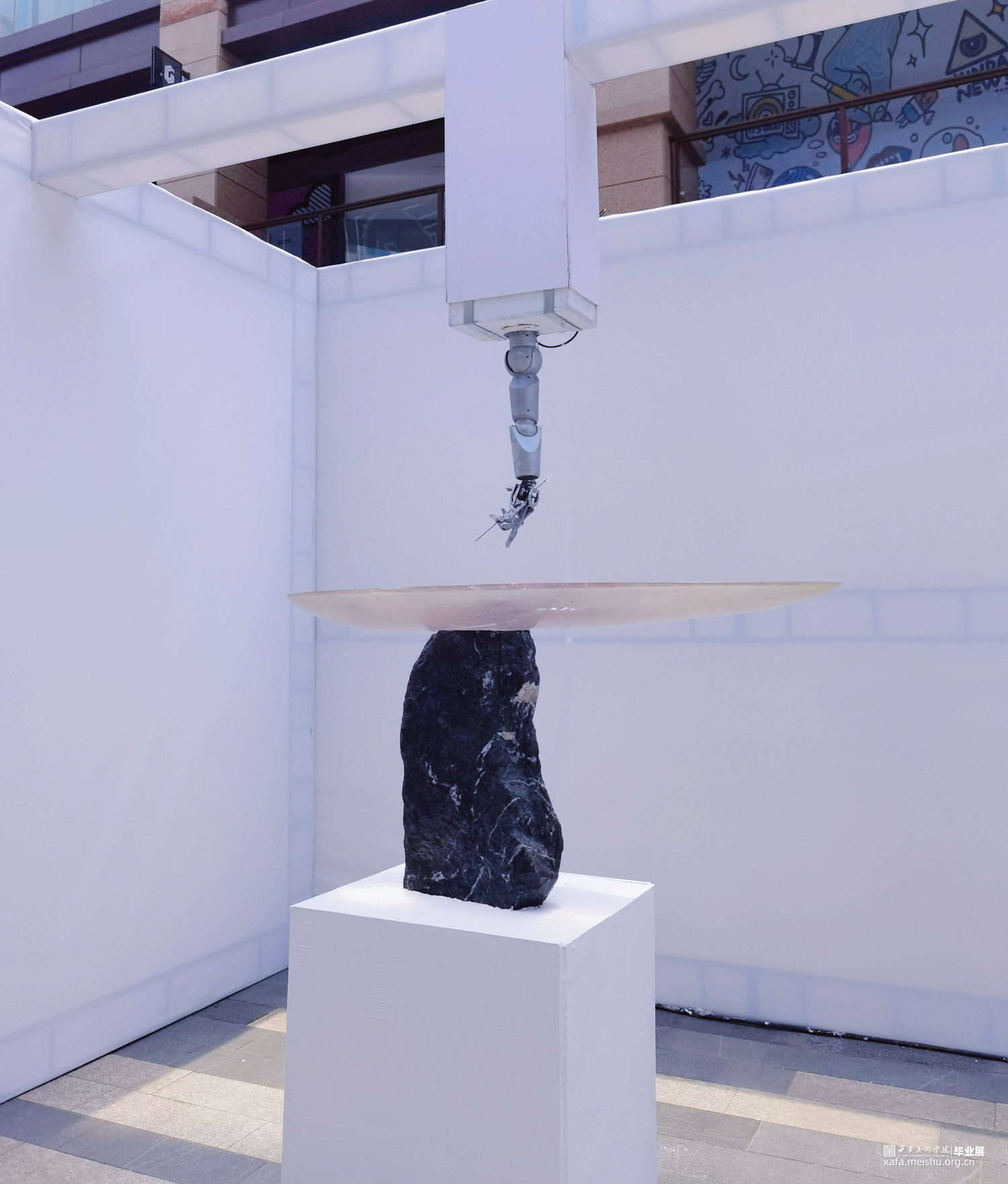 蜉蝣从出水到死去,仅有短短的一天,因此,便有了“浮生一日,蜉蝣一世”的说法。我的作品经过计算也是如此,一天之内水则达到满而不溢的状态,用了抽象并且禅意的方式去表达一种无力感。同时采用非中心支点的承重方式,材质使用坚硬的石头与冰纹的树脂形成反差,给观者一种危机感官体验。机械手臂象征着未来,好像想要拯救这一危机的局面,但也无能为力,就像蜉蝣想要抗争自己一天的宿命一般。最短仅一天而已,然而在它这短短的生命中,却绽放了最绚烂的光彩。作品在最后也想表达任何生命都值得被尊重。