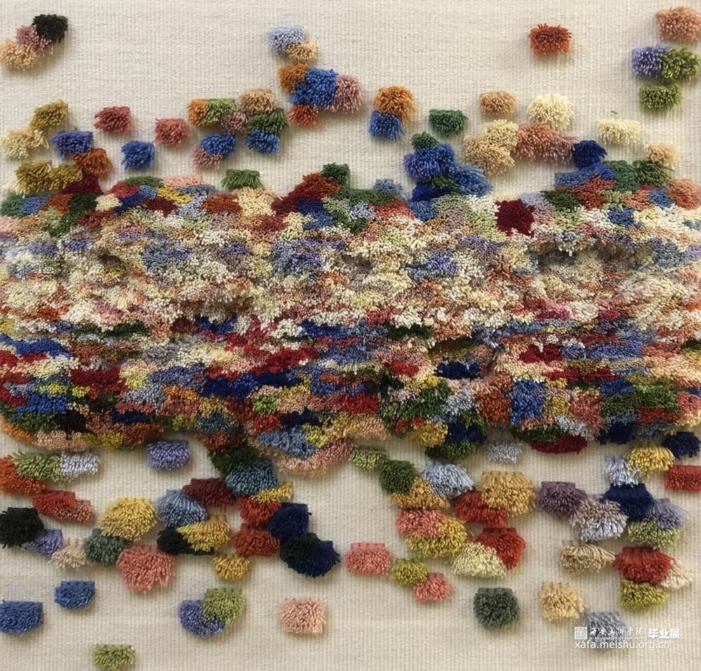灵感来源于银河系图案,那种特色的朦胧幻景的视觉感受,营造出一种富有生命的气息。充分运用了栽绒编织的技艺,以羊毛线显示了厚重的表现力,自由表达的微妙的色彩变化和朦胧的诗意,给观者带来都市喧嚣中的片刻宁静,创造了画面的语言:看似无实则有,看似有实则无,给人想象的空间。