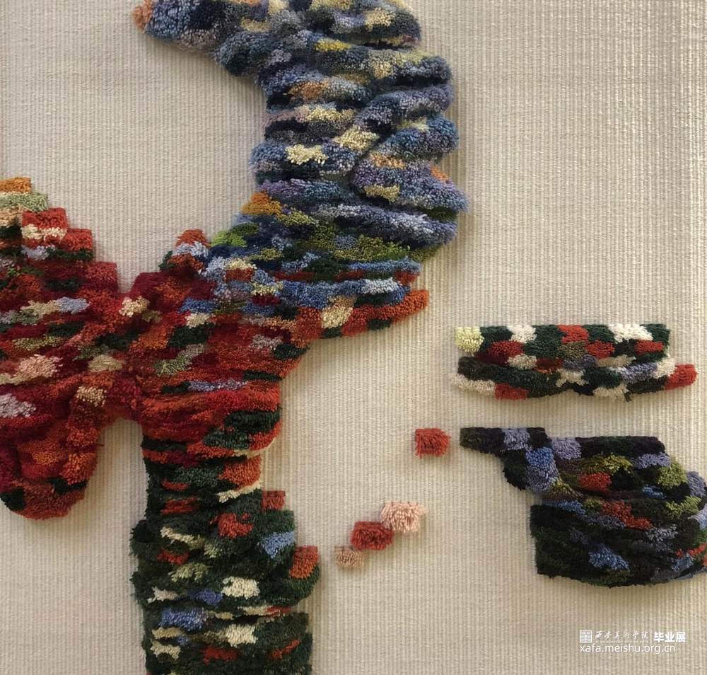自从看了天文知识,对生命的孕育、生命的起源有了一个全新的认识,生命既是一个具象的定义,又是一个充满虚幻的抽象概念。在长期的思考过程中,尝试用纤维艺术的表现形式来象征我对世界的向往,柔软的纤维和细腻的编织是最贴切主题的表现形式。红色形似耳朵形态,红色之外代表想象的世界,意为耳朵被遮住,但思维没有停止,头脑仍充满想象,向往美好的星系和充满自由的星球。