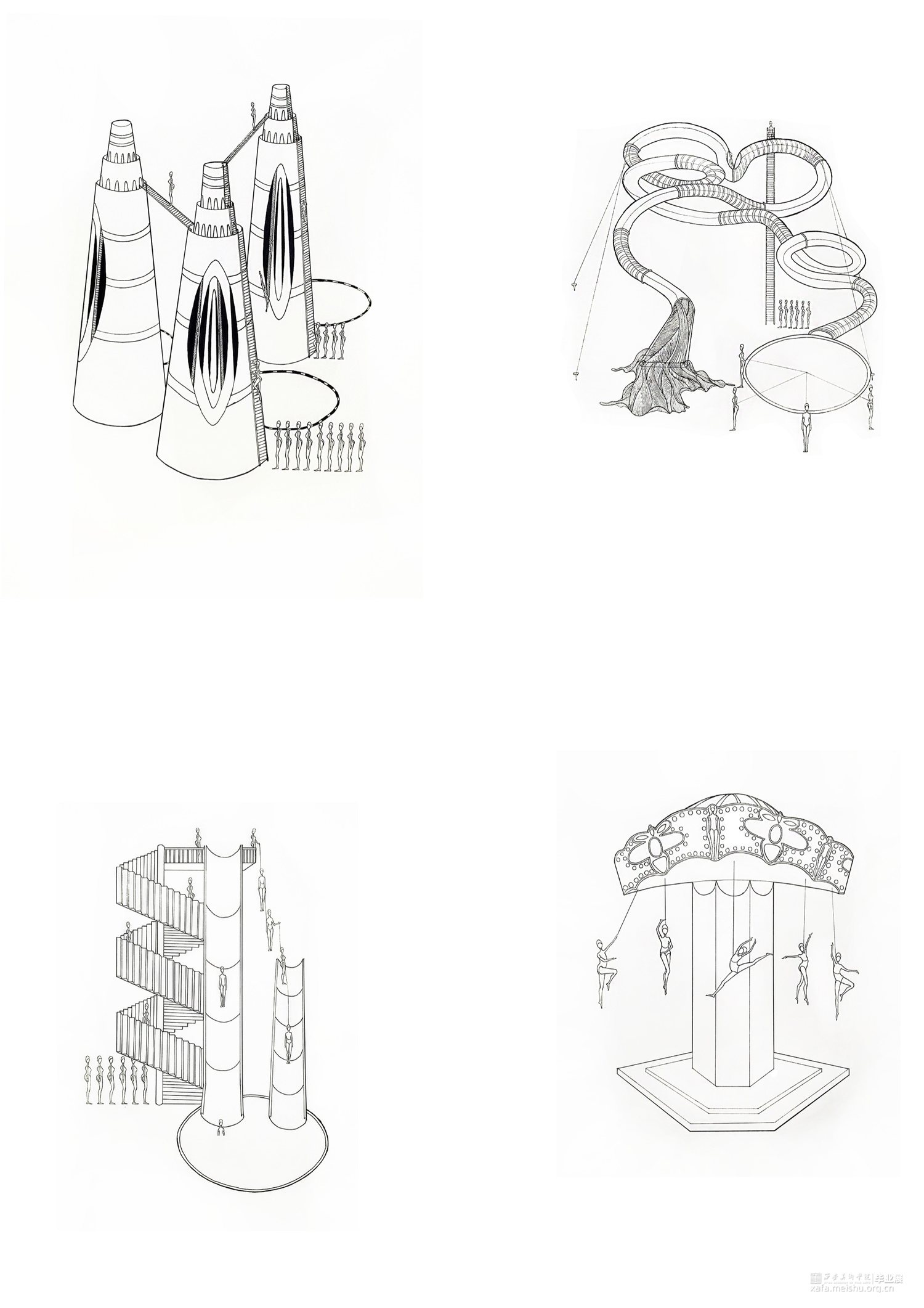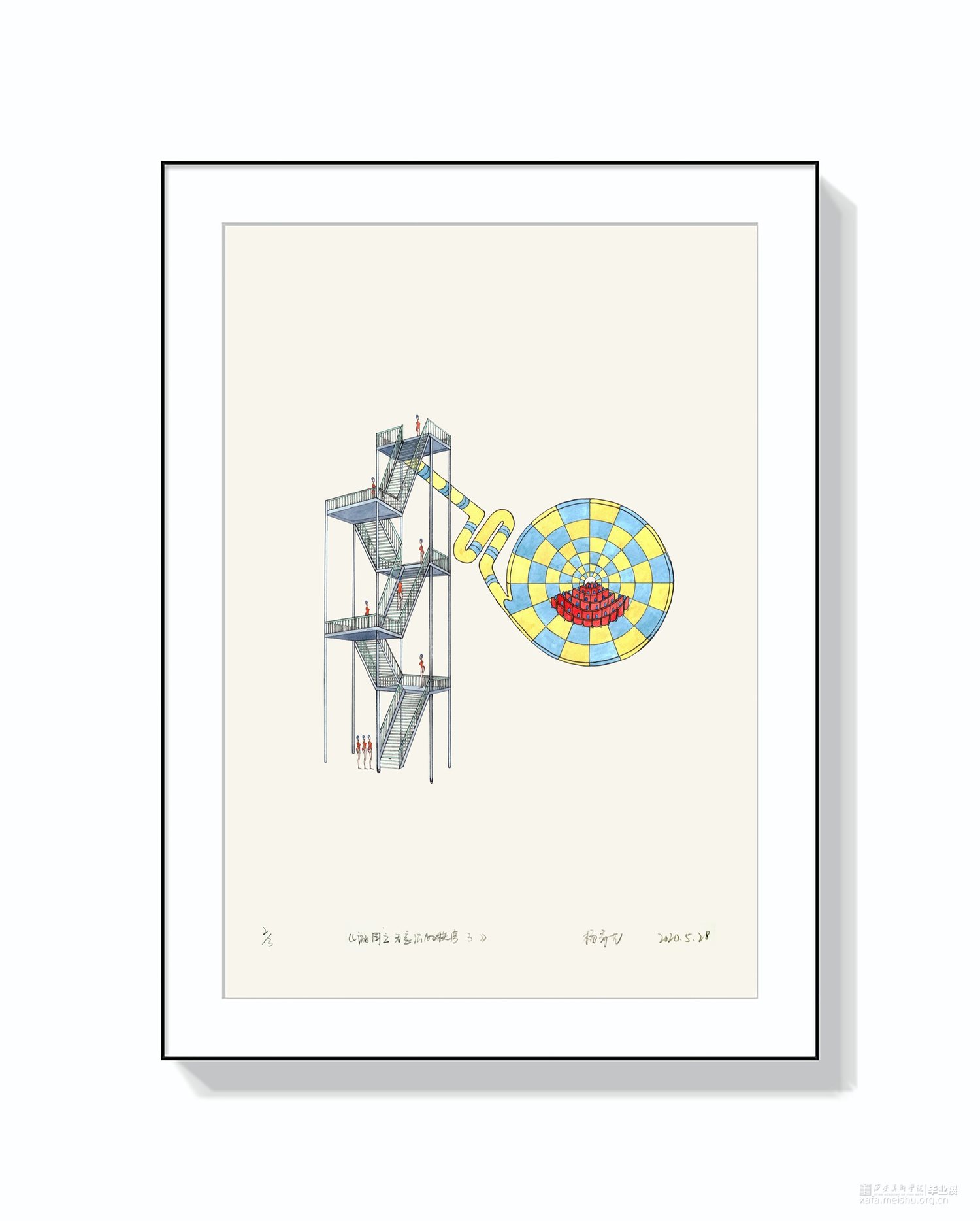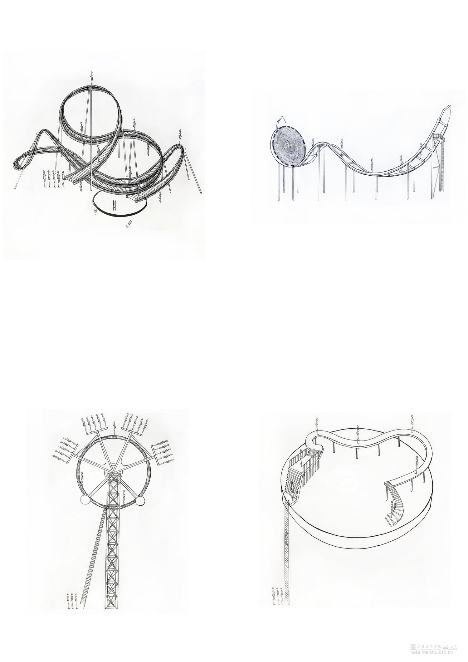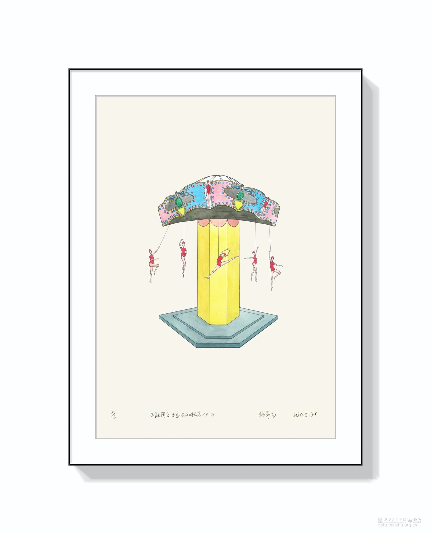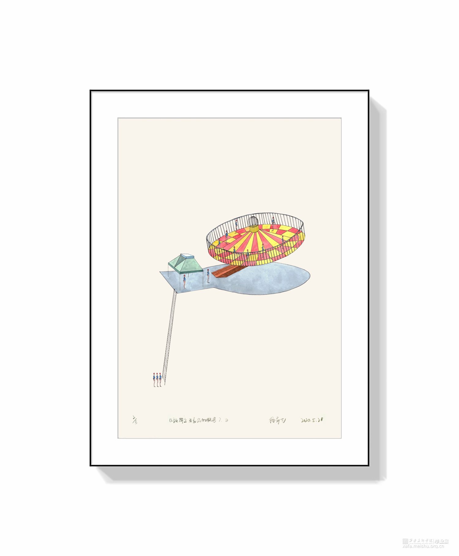 我的作品充满了超现实主义气息。画面元素利用了生活中被我改写后的游乐设施,再结合了机械的人物。因为游乐园作为一个象征着欢乐的环境,但是在其中的人物却僵硬,没有五官,没有面部表情,从而人物与环境就产生了对比感,画面由此变成了一个光怪陆离的场景,最终营造出了荒诞、怪异的环境氛围。