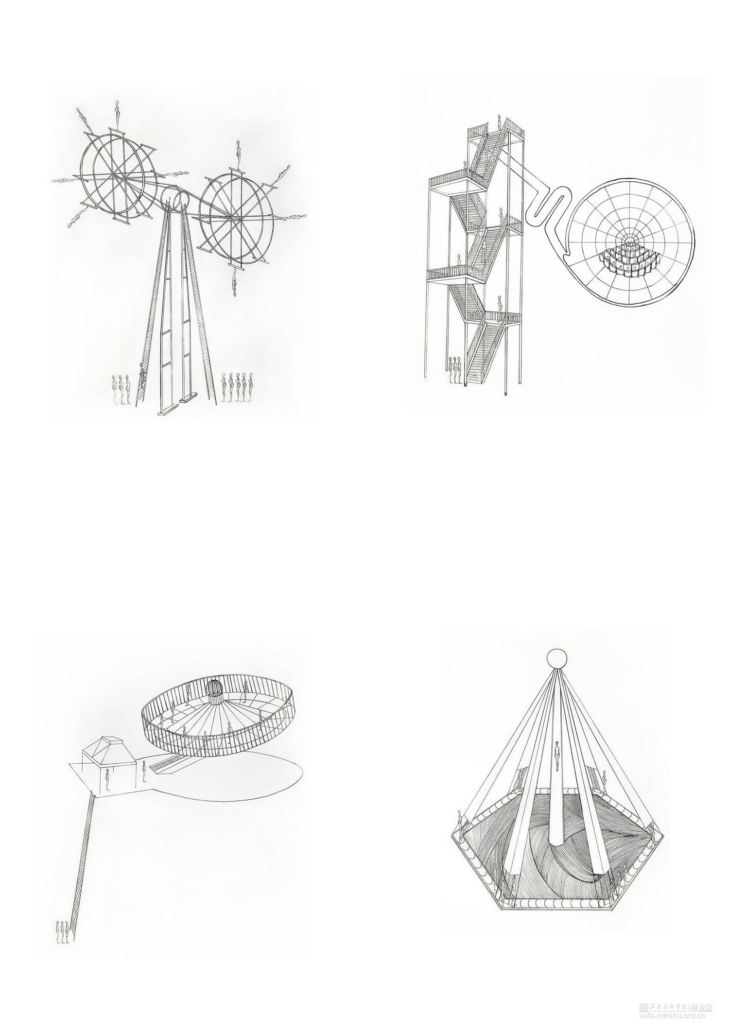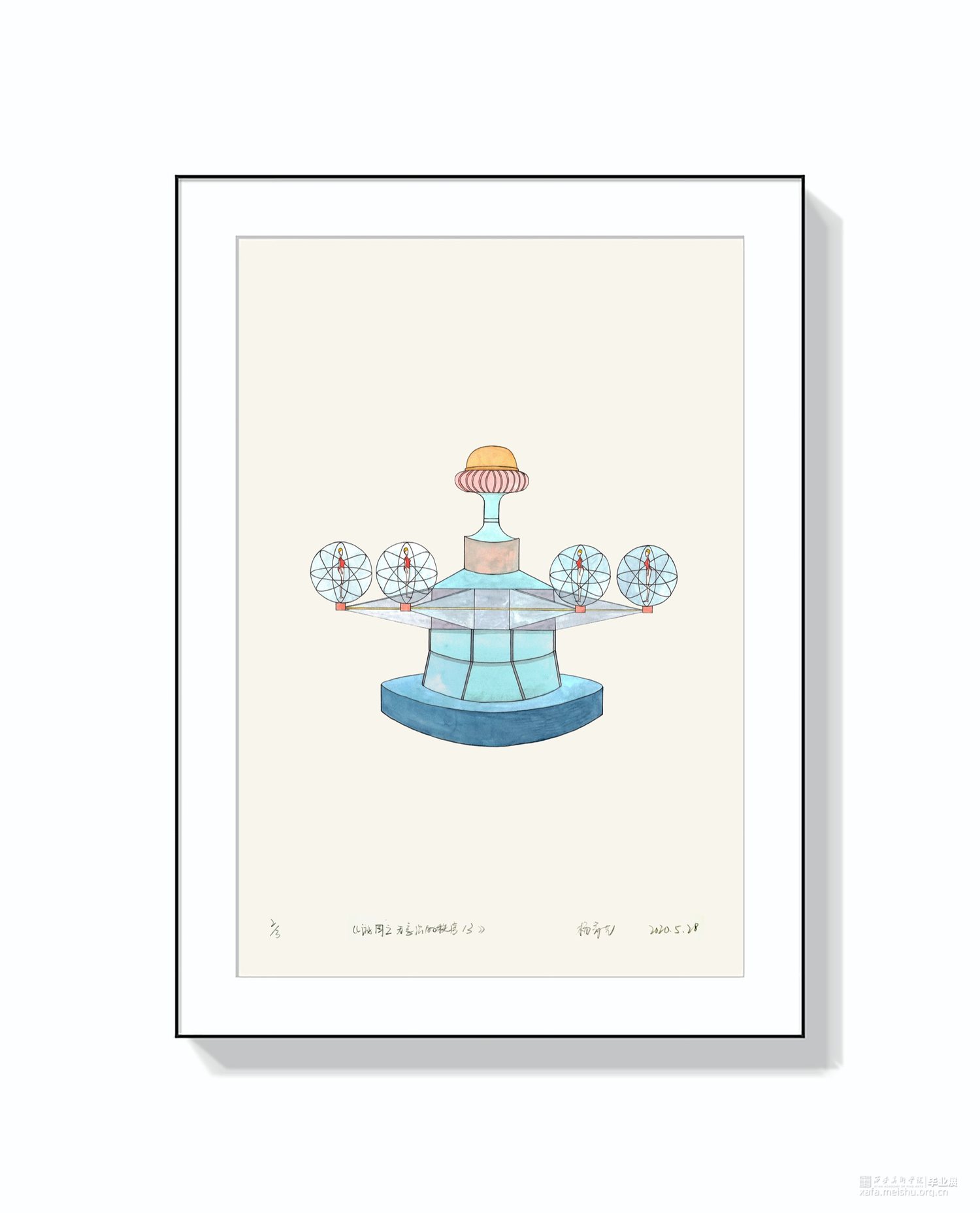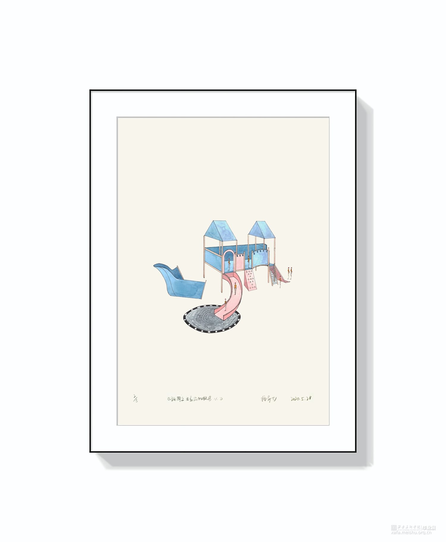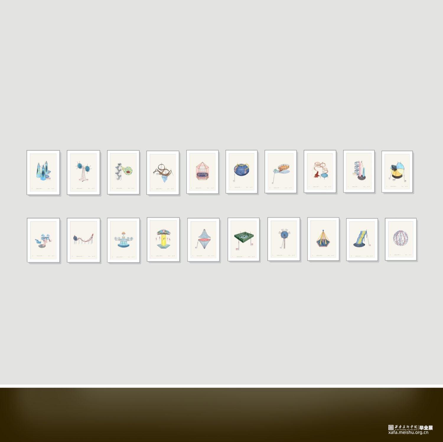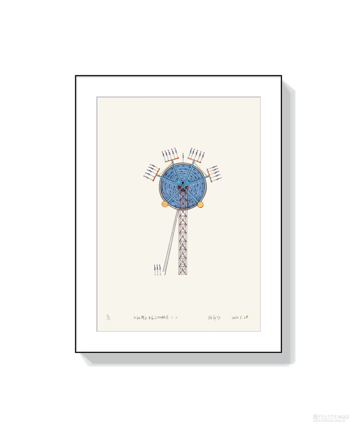 我的作品充满了超现实主义气息。画面元素利用了生活中被我改写后的游乐设施,再结合了机械的人物。因为游乐园作为一个象征着欢乐的环境,但是在其中的人物却僵硬,没有五官,没有面部表情,从而人物与环境就产生了对比感,画面由此变成了一个光怪陆离的场景,最终营造出了荒诞、怪异的环境氛围。