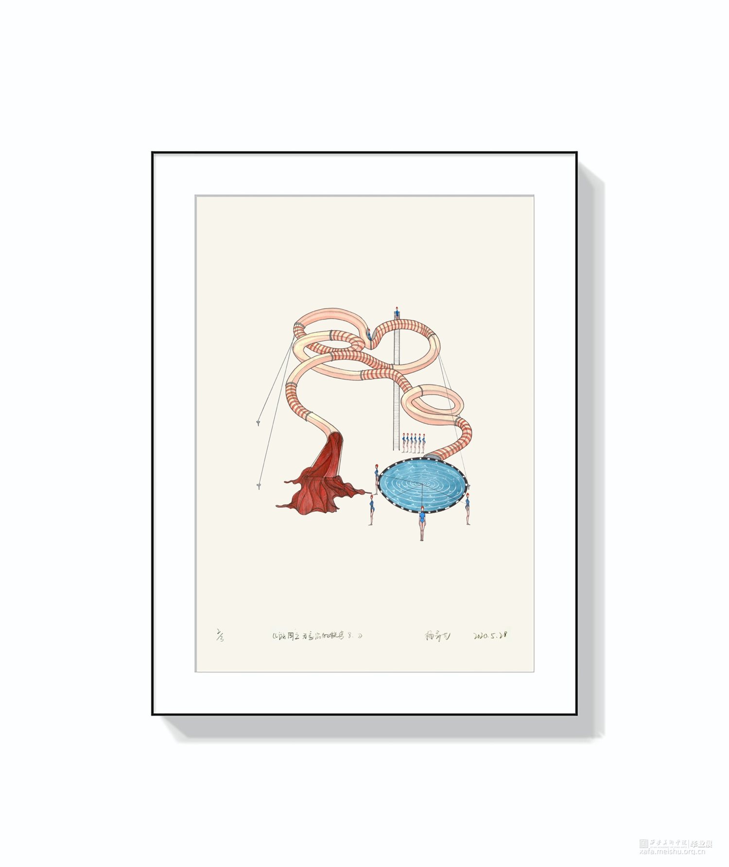 画面运用梯子、绳线和水池穿插于画面之中,引导和控制了画面人物的行动。并且这些元素重复运用了在系列作品之中,从而产生一个上下规律游走的怪圈。同时也是为了设定里面的人物行进轨道,最后用来引导观者视觉点的游走。