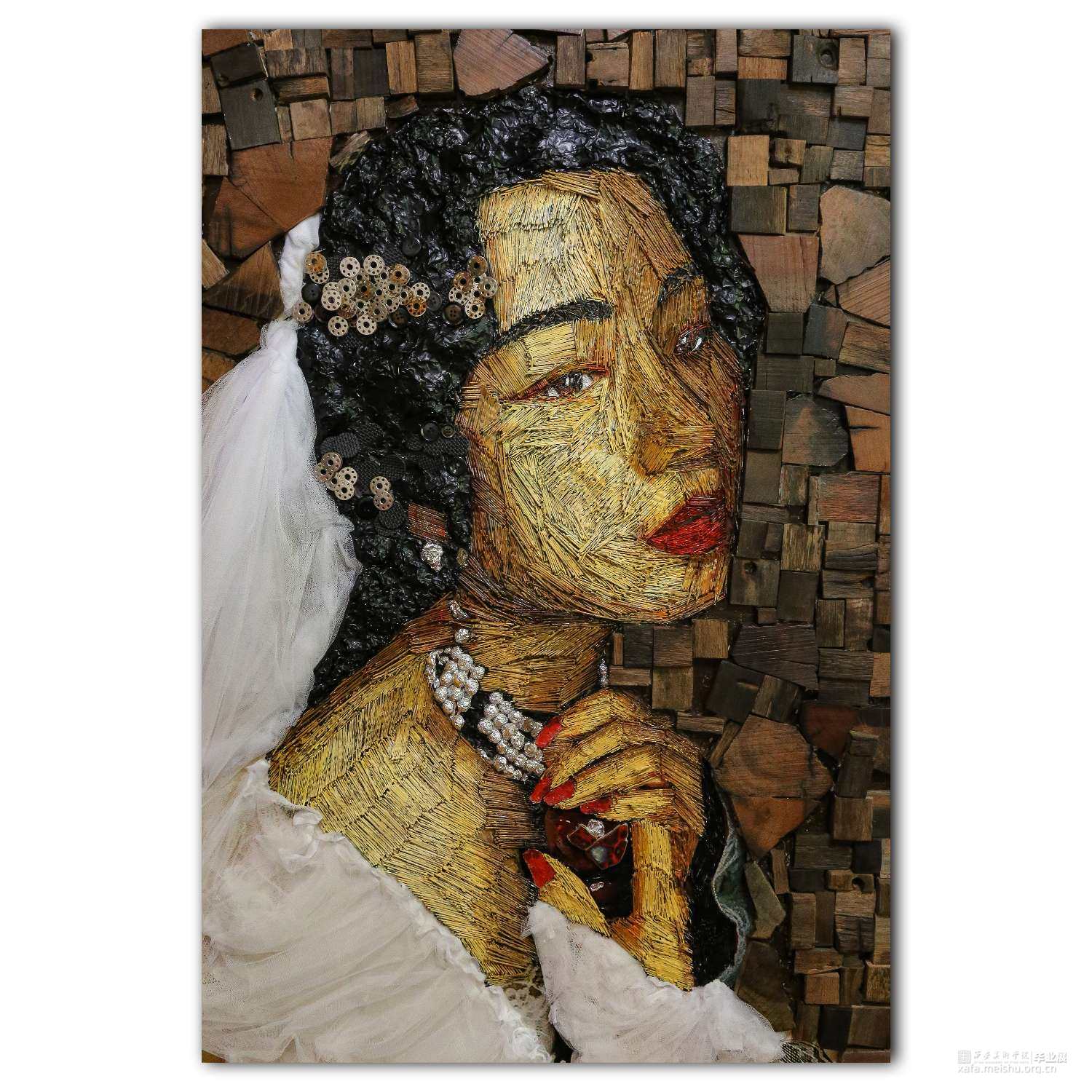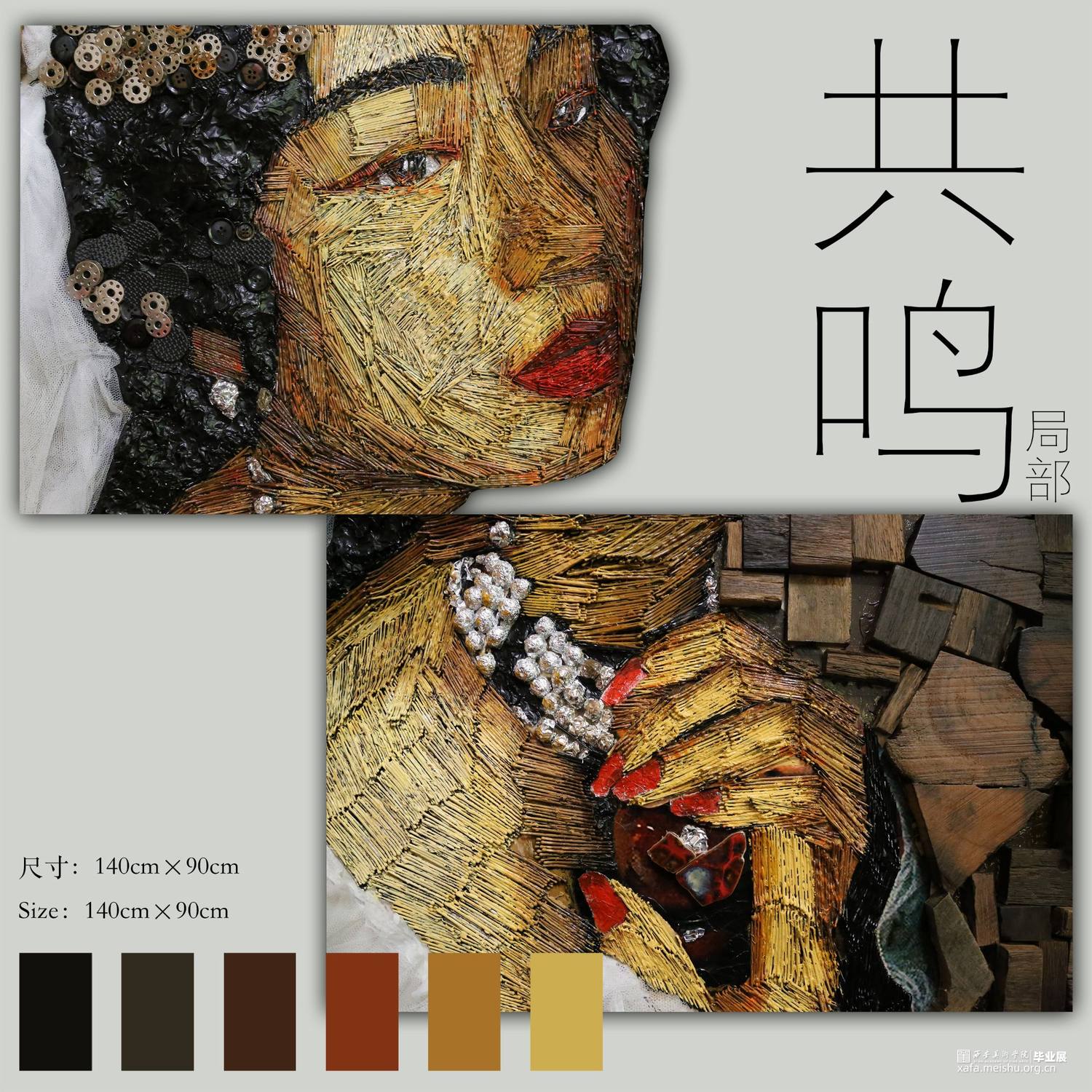 综合材料镶嵌作品《共鸣》,从画面中少女的手势姿态和眼神表情就能看出:她渴望被理解,被“懂”,渴望有共鸣。良好的沟通才能产生共鸣,作者希望通过本作品来表达成年人对生活及情感的一种人生态度,希望作品能引起观者的共鸣和思考。