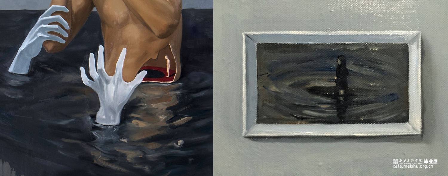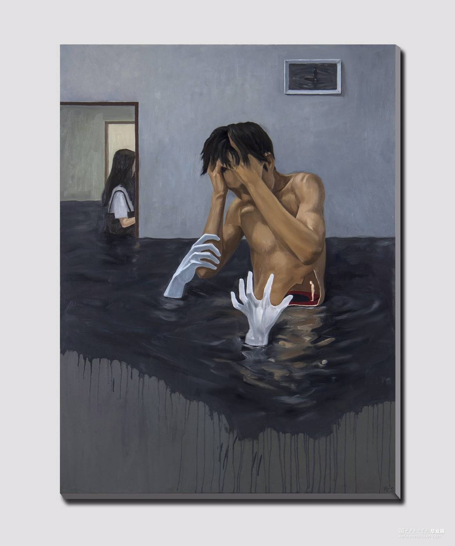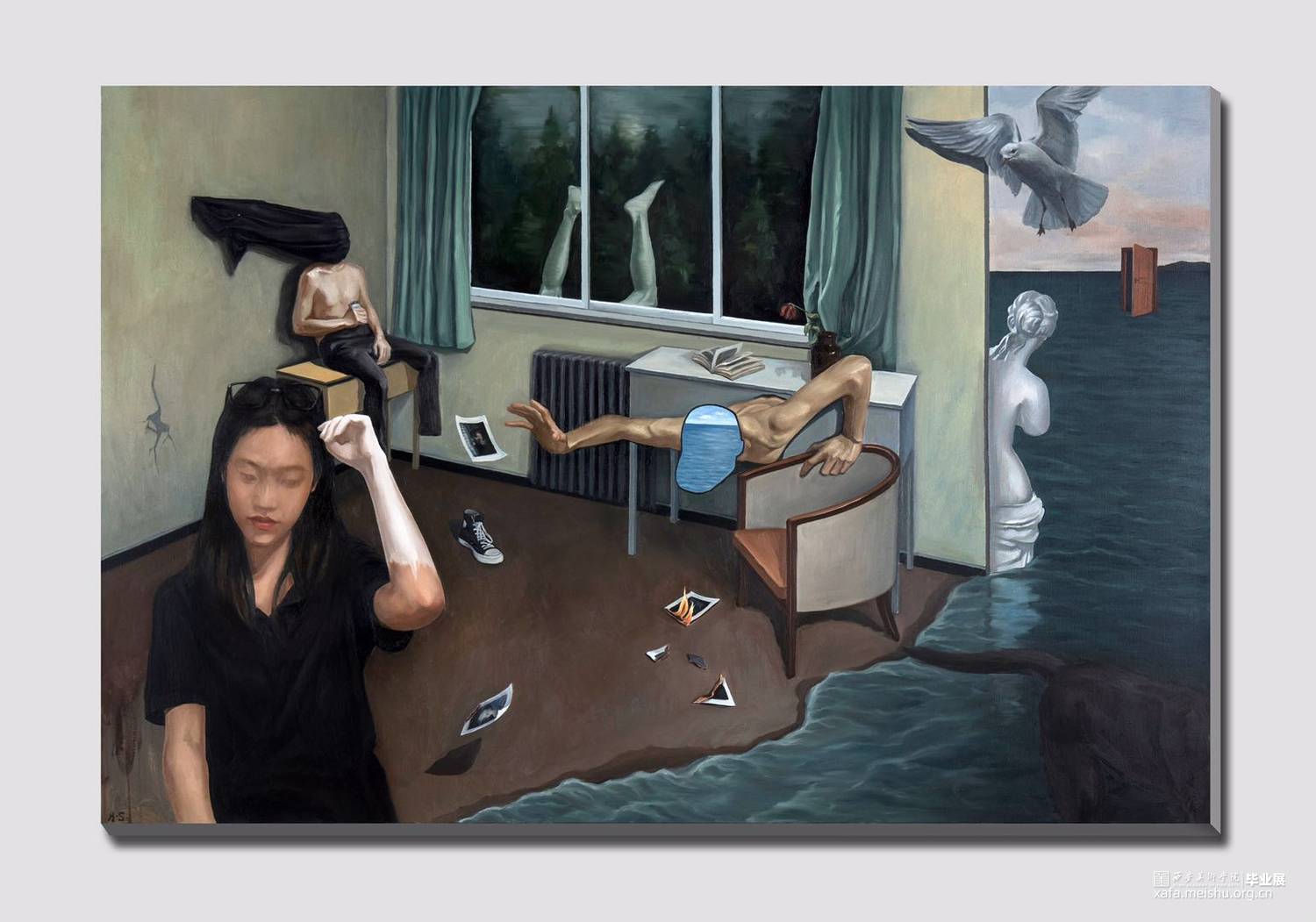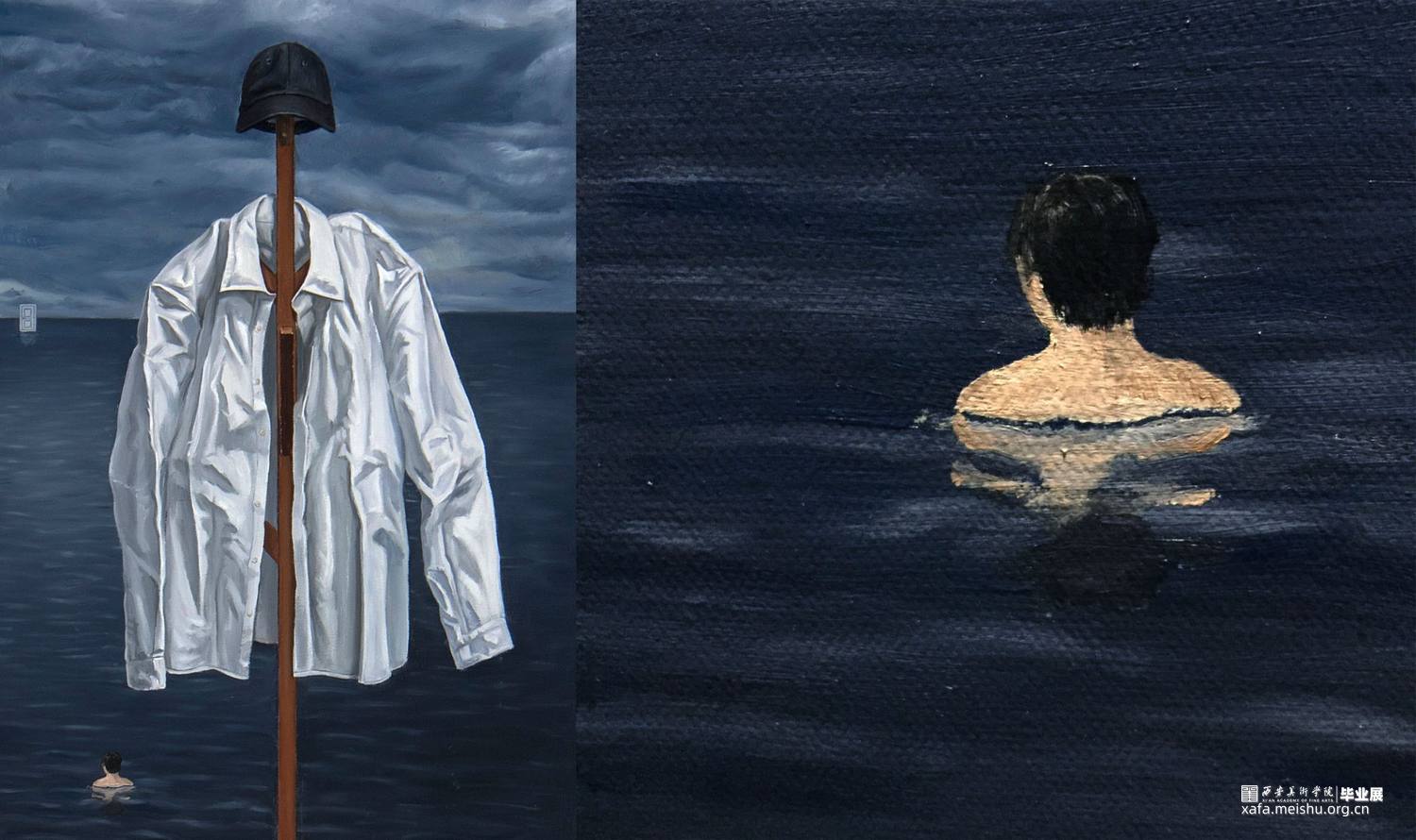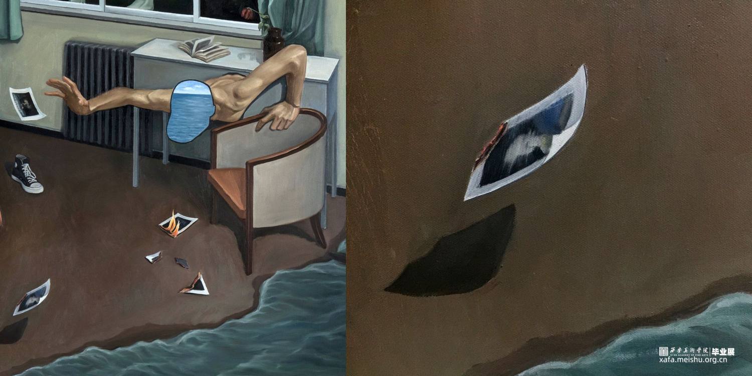 在残酷的现实世界,唯一残存的人性的隐居之所,那就是梦。画作以故事情节为系列,将梦境与现实结合,创作了一个自我臆想的超现实世界。为了逃避现实而想要去到梦的世界,可沉浸在梦中只会让我越陷越深。当梦破碎时,无法摆脱现实的我只能渐渐被负面情绪所吞噬。