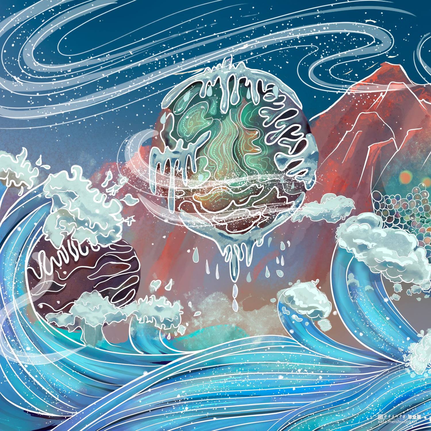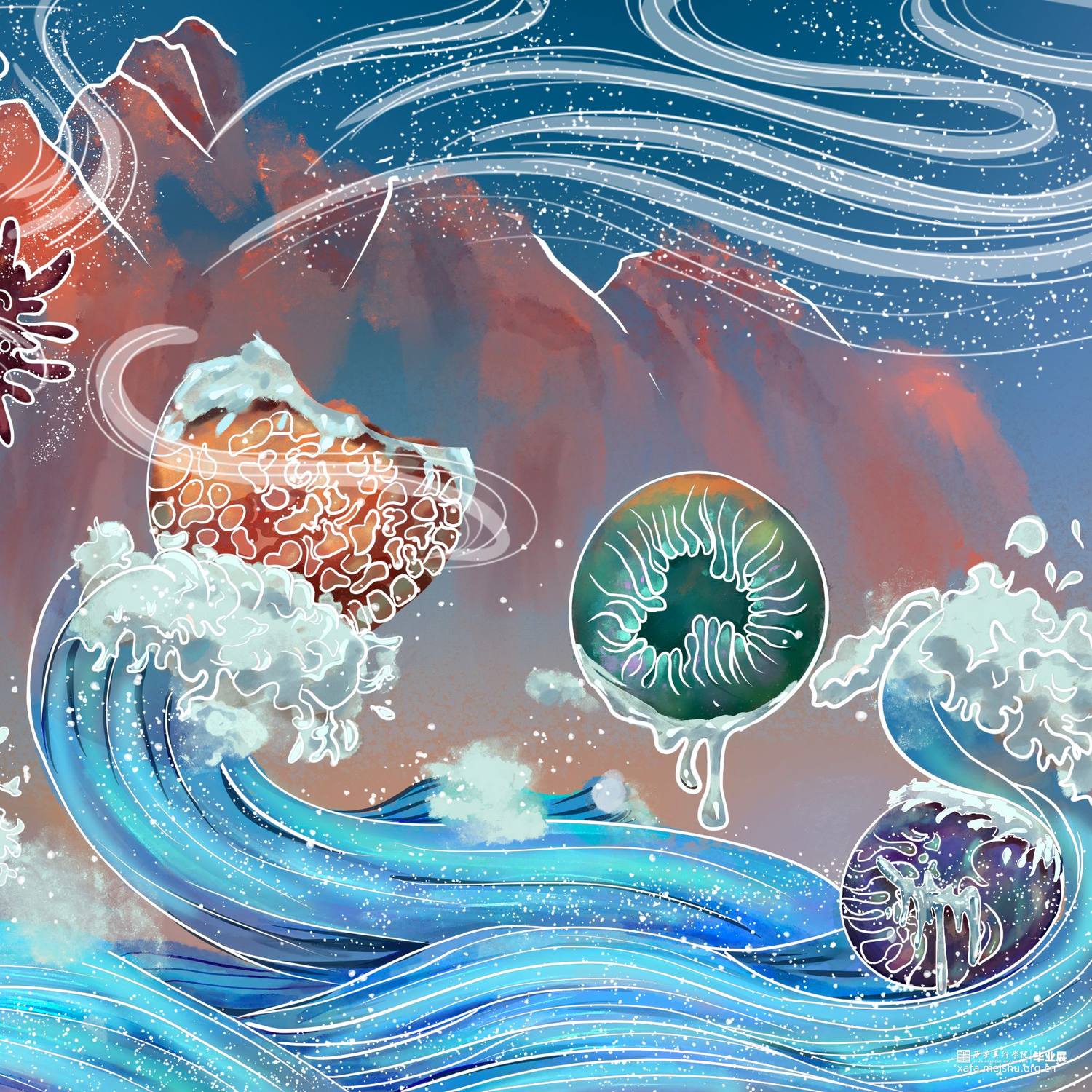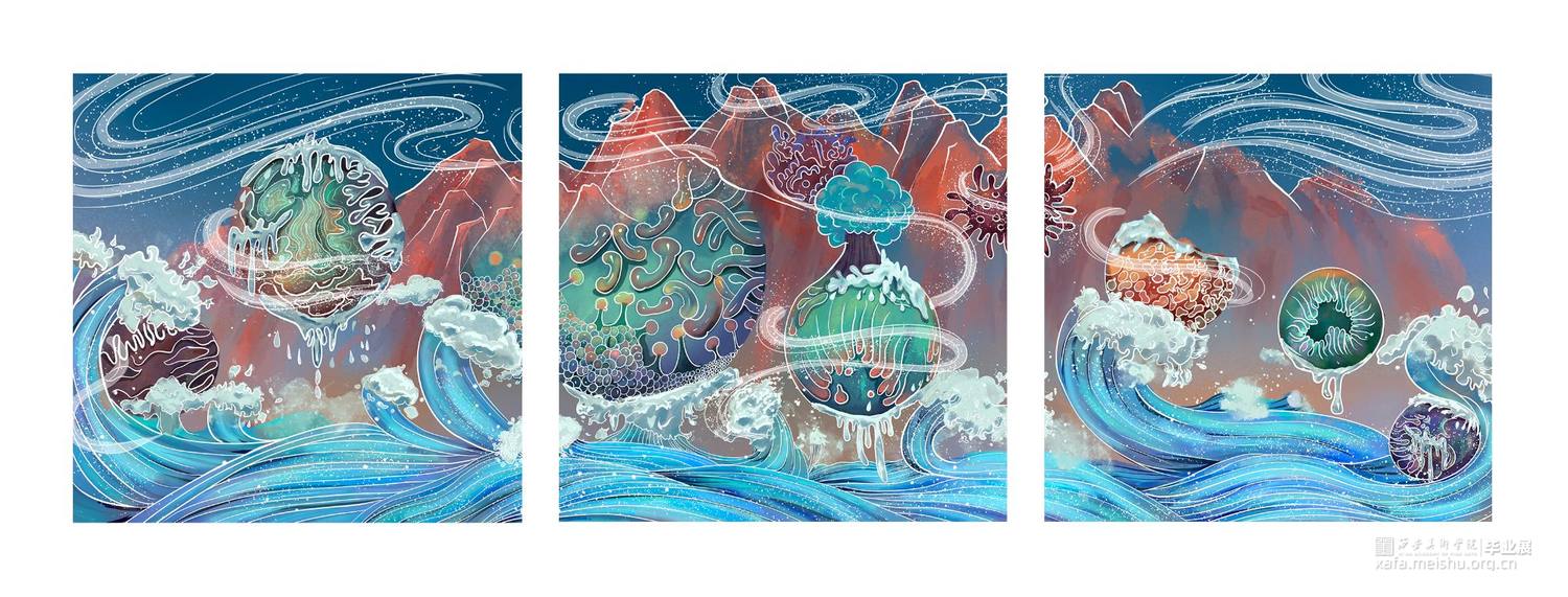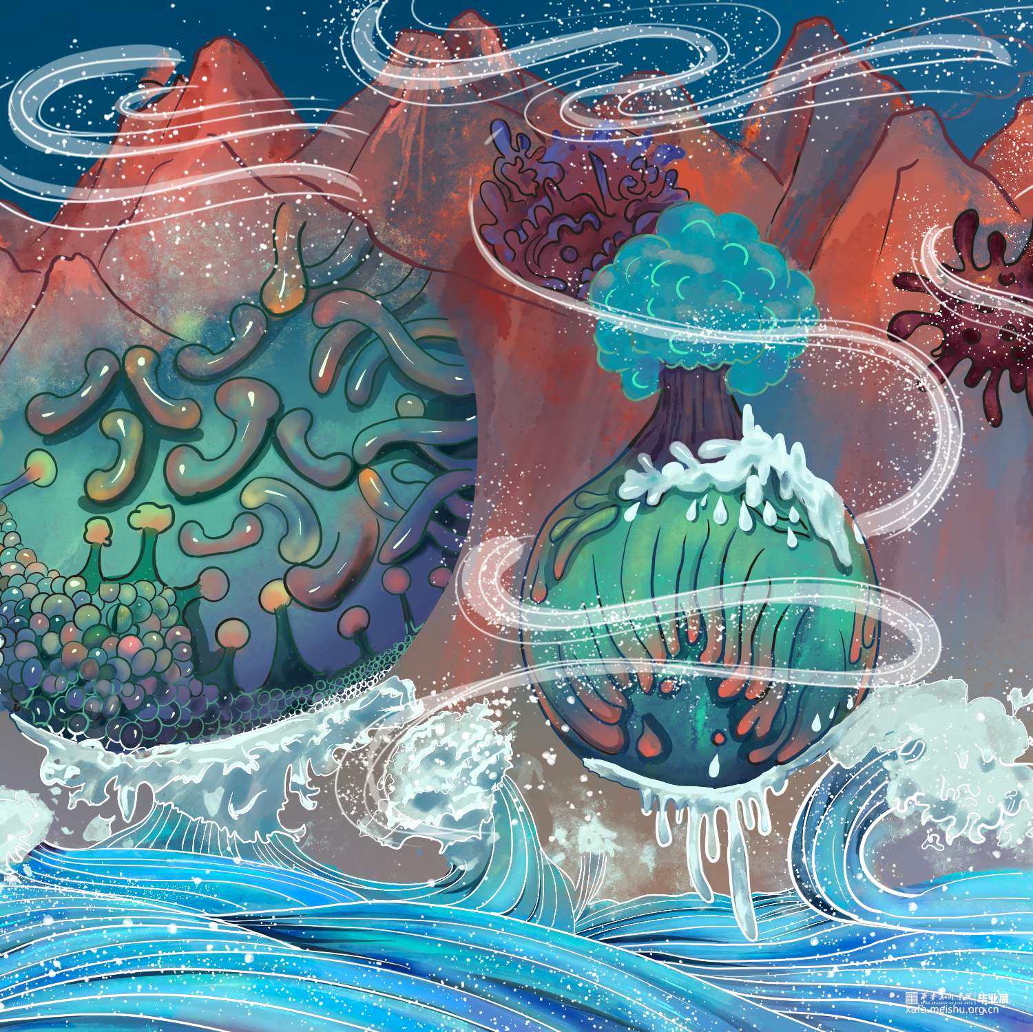 “生”意味着自然界中万物的存在。“灵”即是万物的精神所在,和一切的未知。作品《生与灵》运用抽象的图形和色彩来表达作者内心的情绪,传出大自然的神秘与力量。