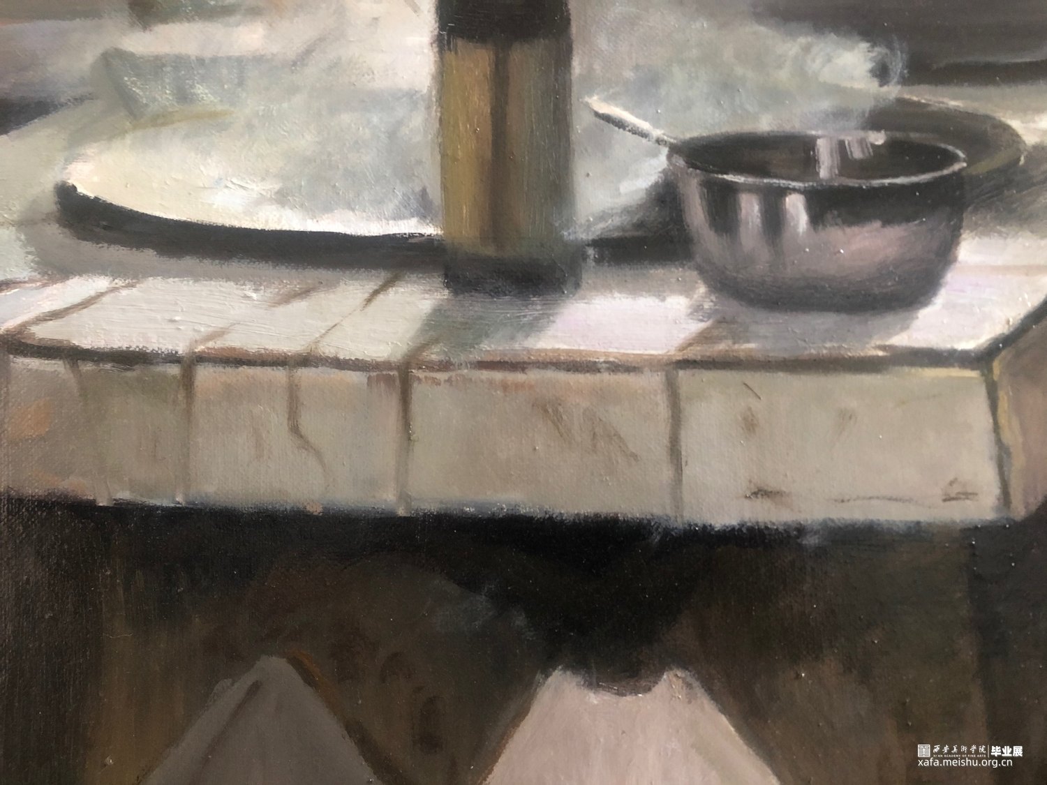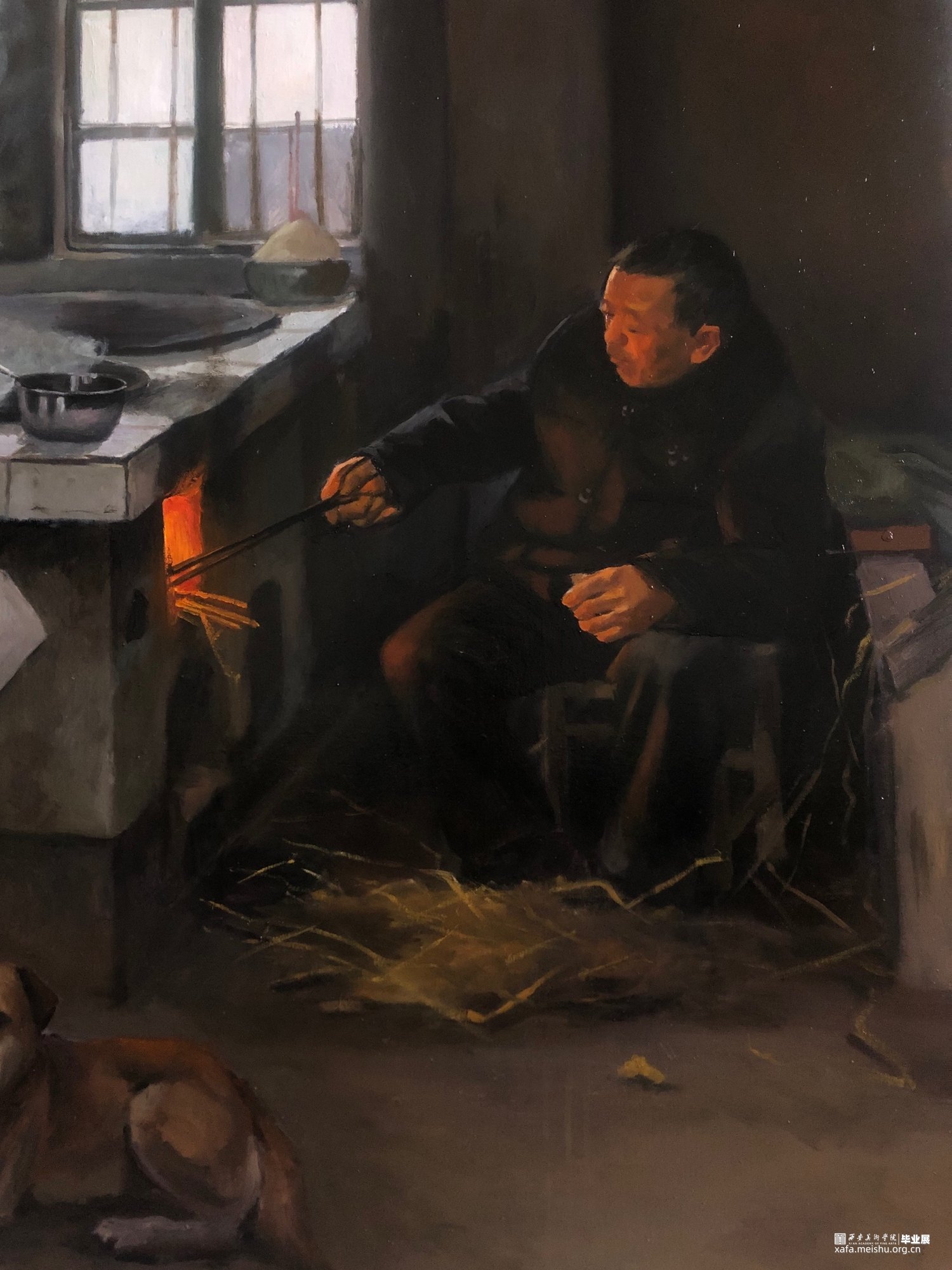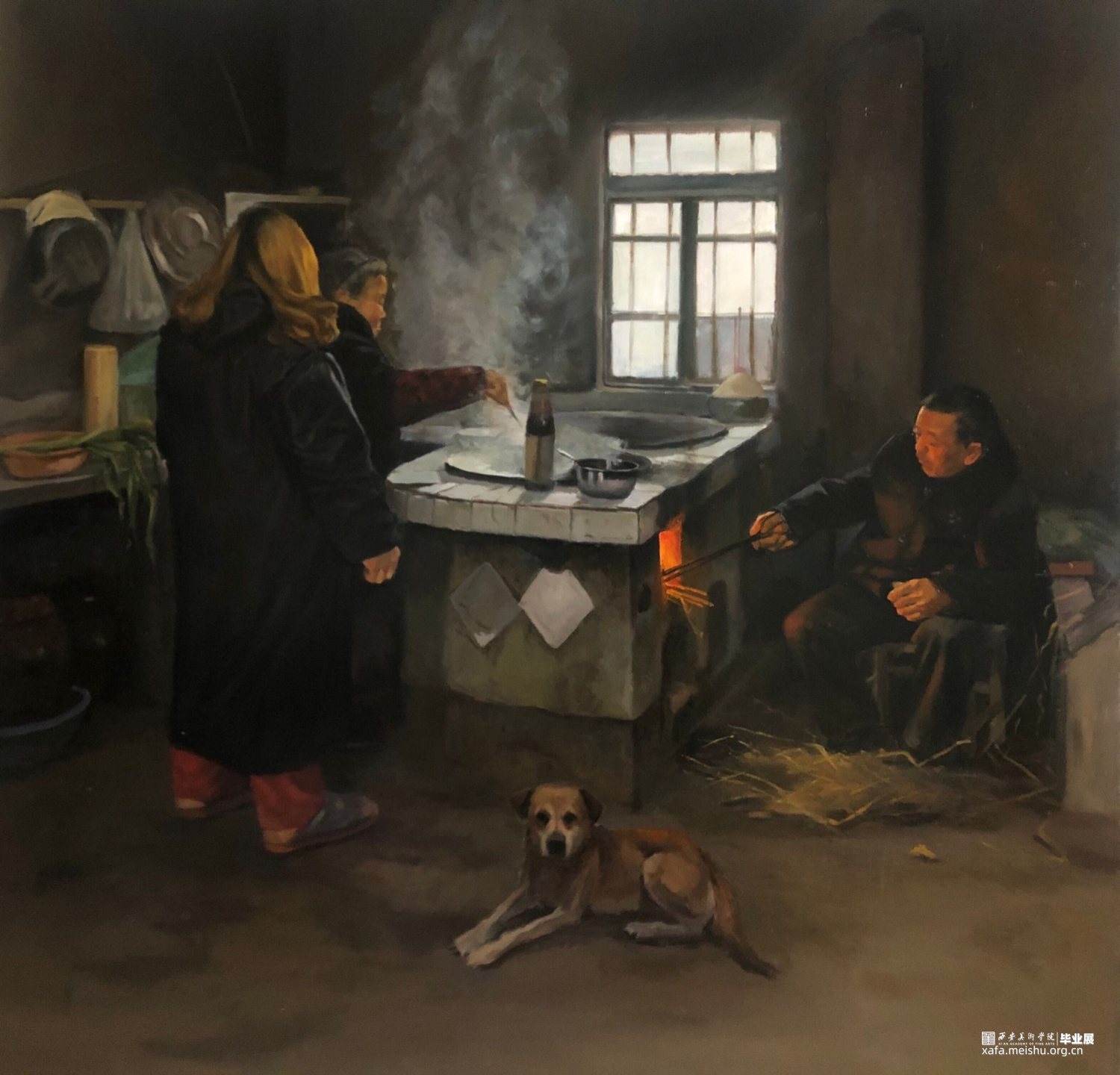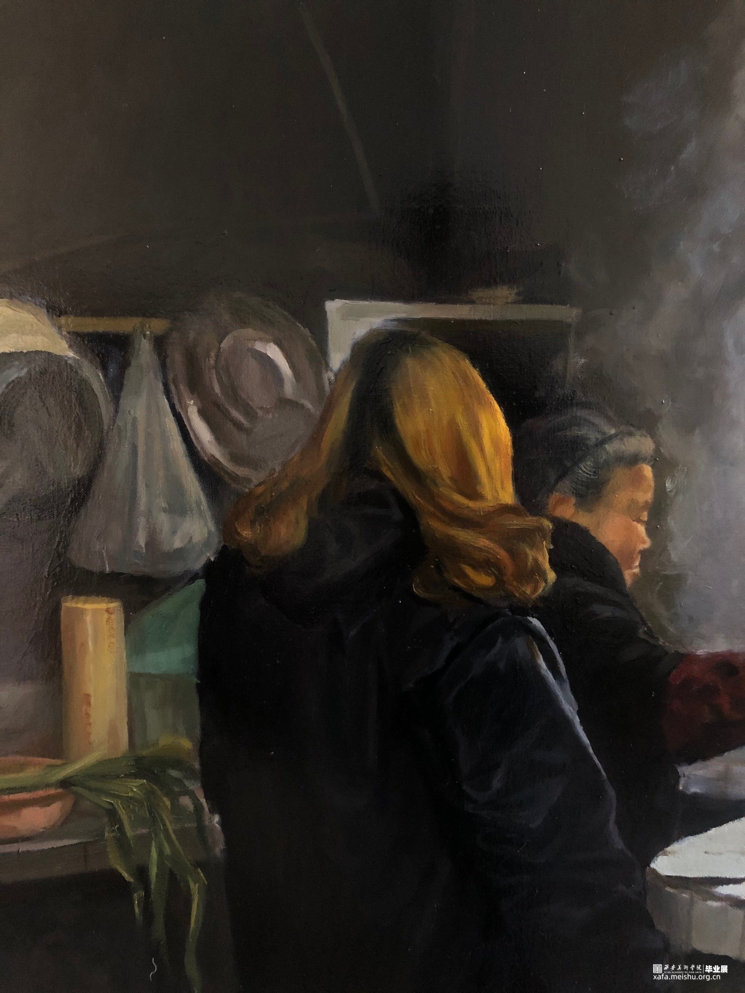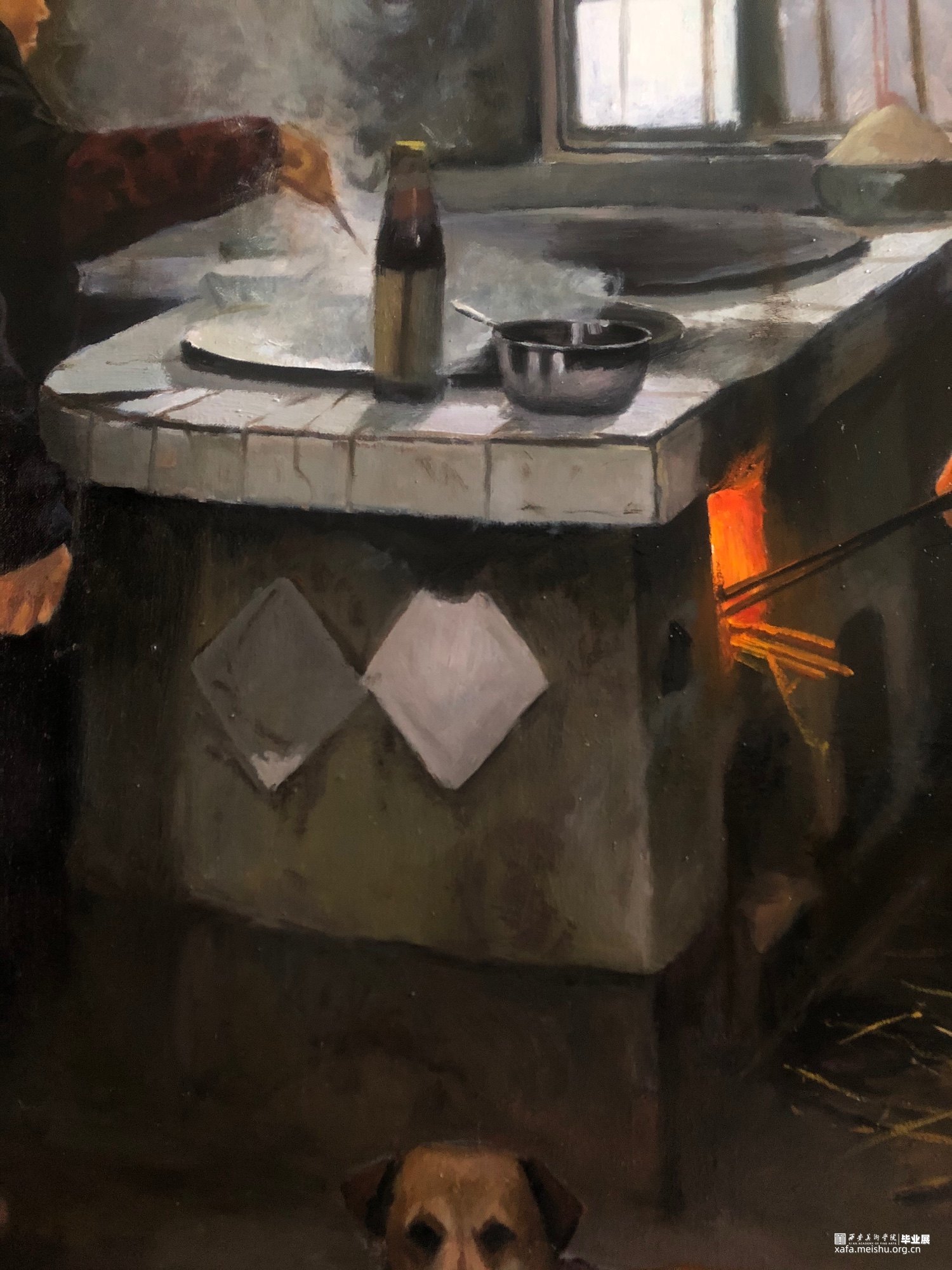 突然爆发的新冠肺炎,所有城市被按下暂停键。从全面封锁到局部解封,我们在家足不出户足足两个多月,彼此更珍惜近十年都没有过的可以一直在家相处,这也让我重新思考家人与家的意义和关系,家人复杂的给予和付出以及坚持和妥协,如画上既定的色块,我不得不去想了,我不得不去做了。摒弃了之前的所有创作小稿,决定用画笔重现当时的温馨,老厨房是我心中的一个情结,小时就吃在这样的厨房炒的菜长大,奶奶炒菜,爷爷用干柴稻草生火,而我们在旁边等着端菜,幸福而温馨。谨以此画纪念爷爷!
