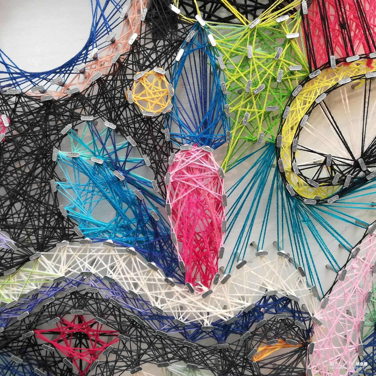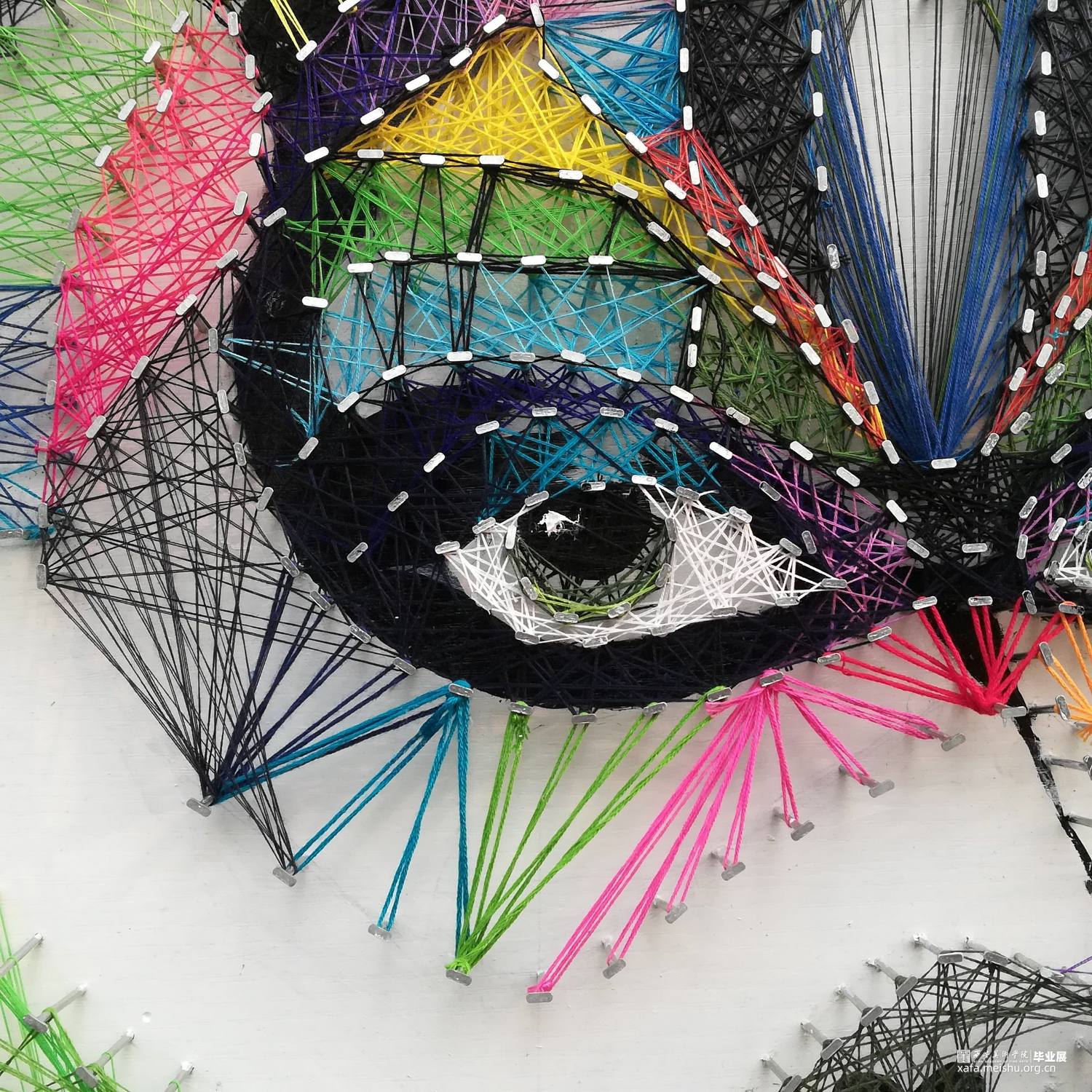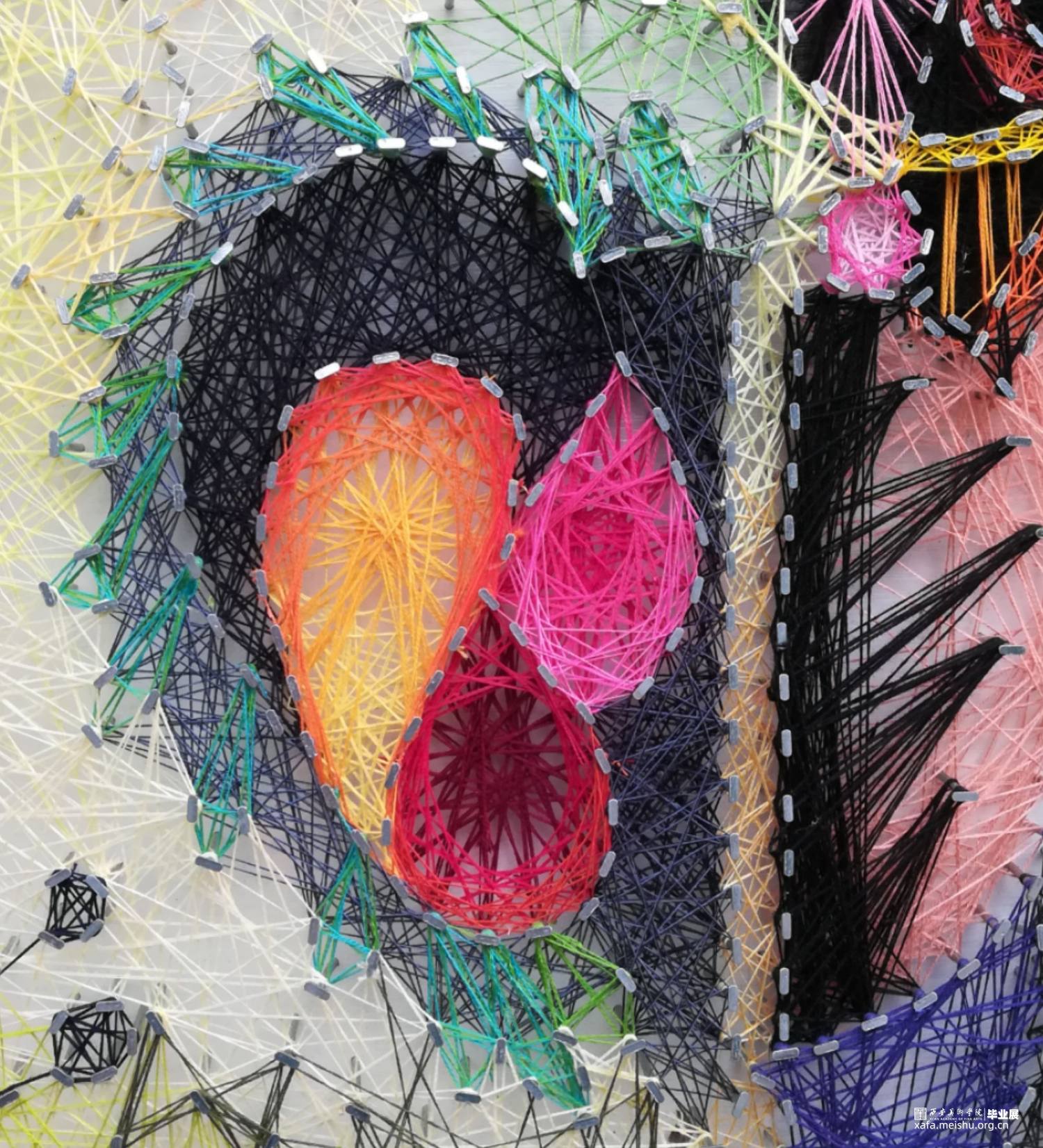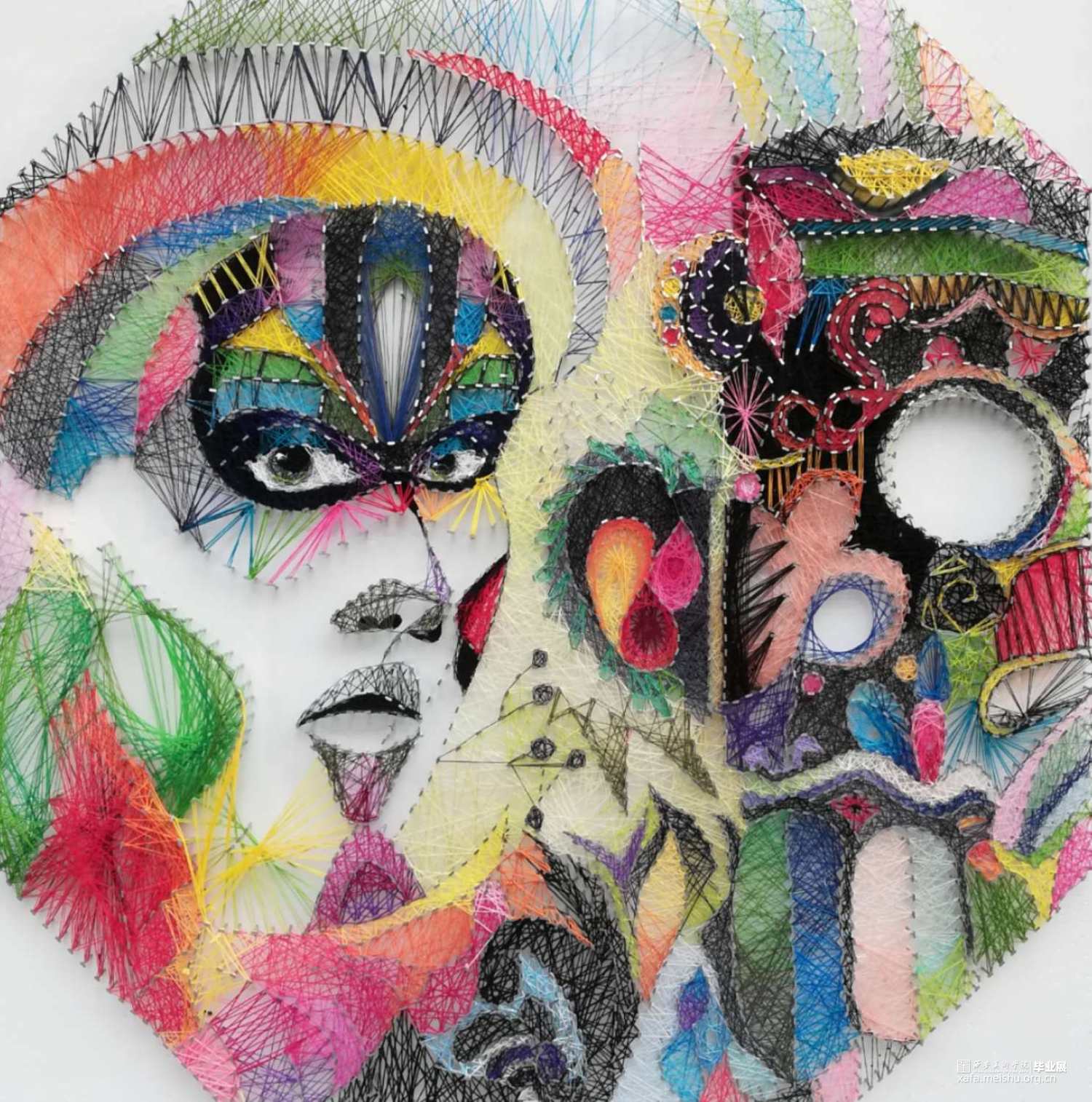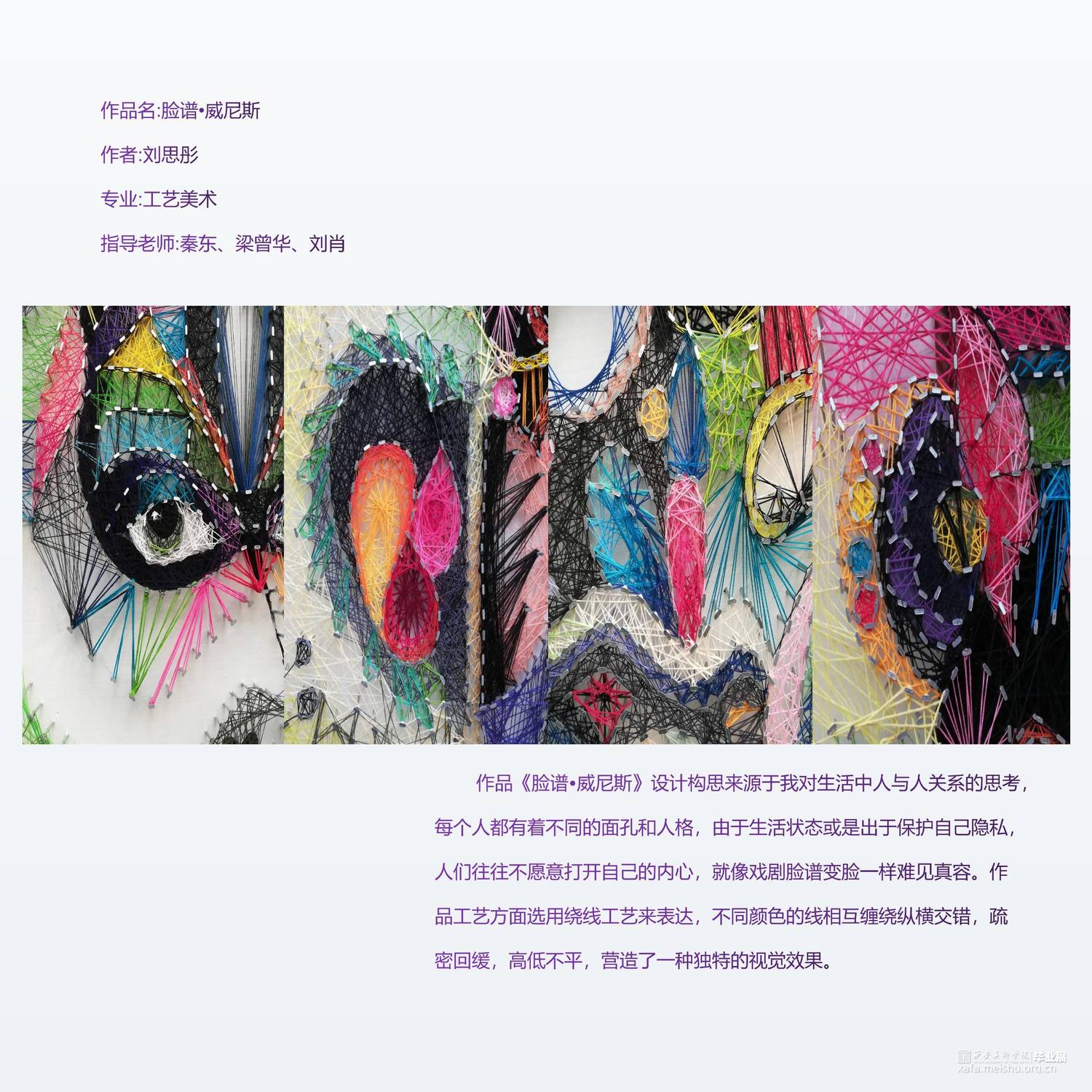 作品《脸谱•威尼斯》设计构思来源于我对生活中人与人关系的思考,每个人都有着不同的面孔和人格,由于生活状态或是出于保护自己隐私,人们往往不愿意打开自己的内心,就像戏剧脸谱变脸一样难见真容。作品工艺方面选用绕线工艺来表达,不同颜色的线相互缠绕纵横交错,疏密回缓,高低不平,营造了一种独特的视觉效果。
