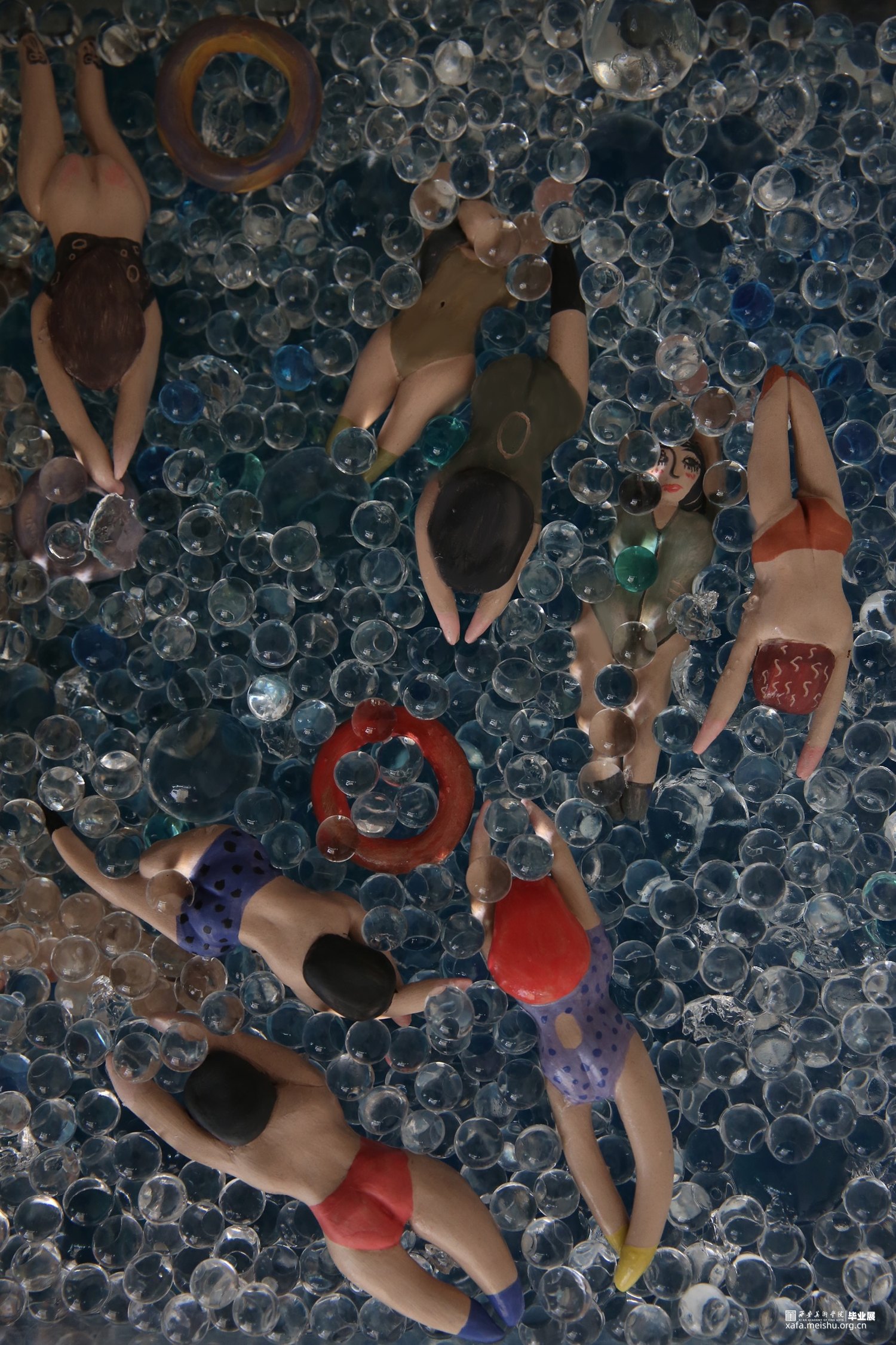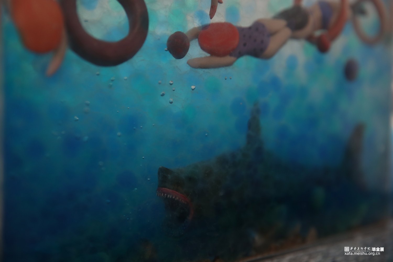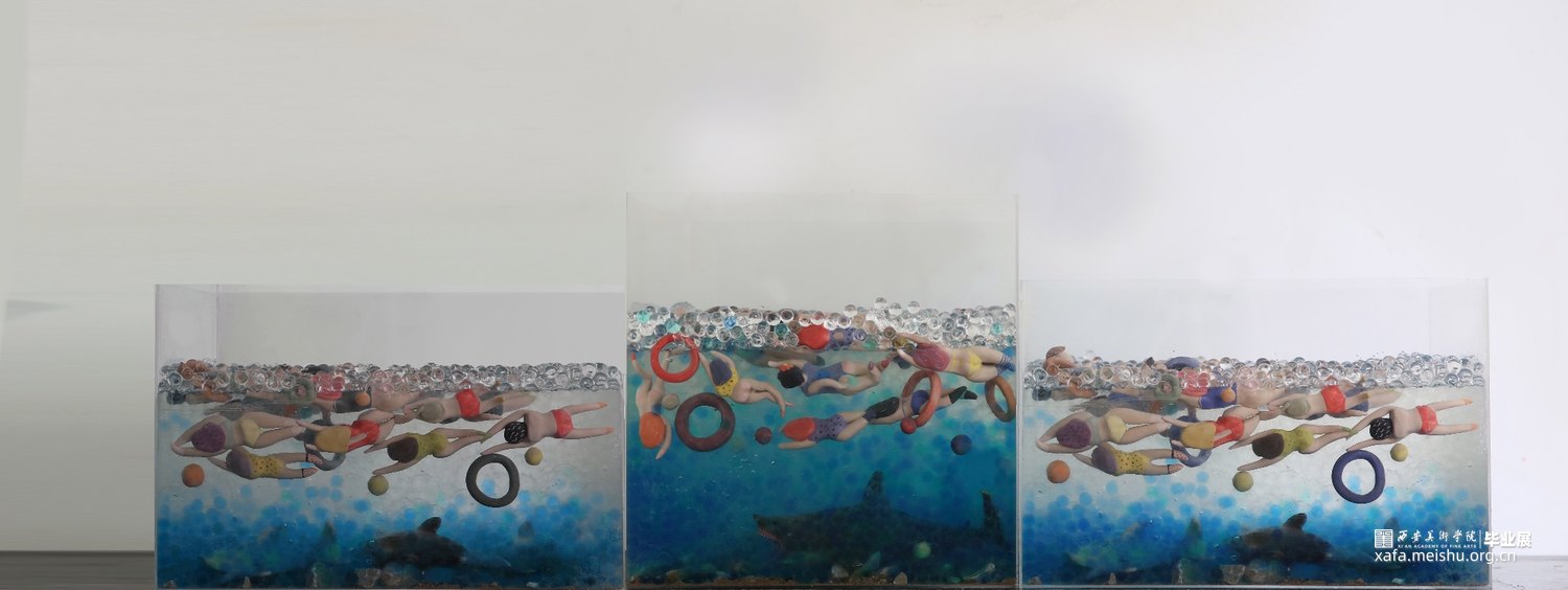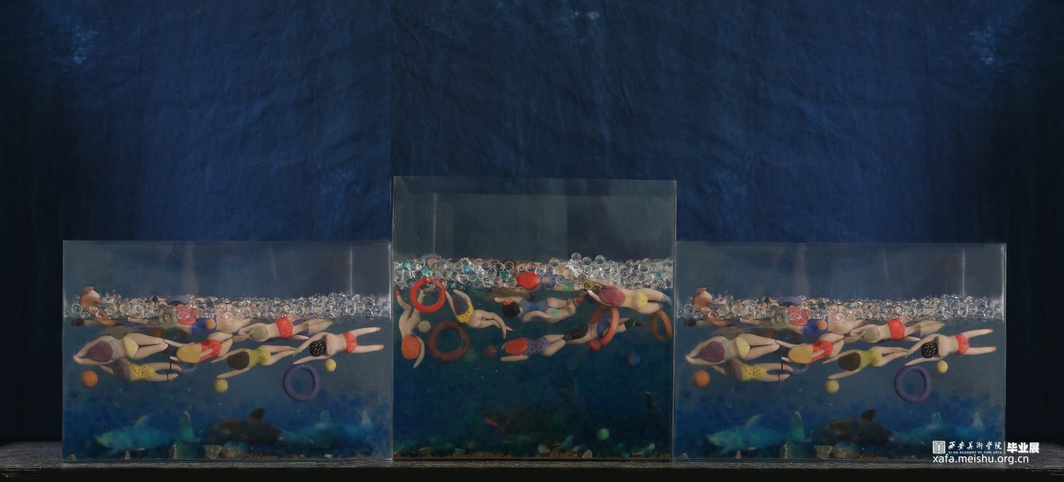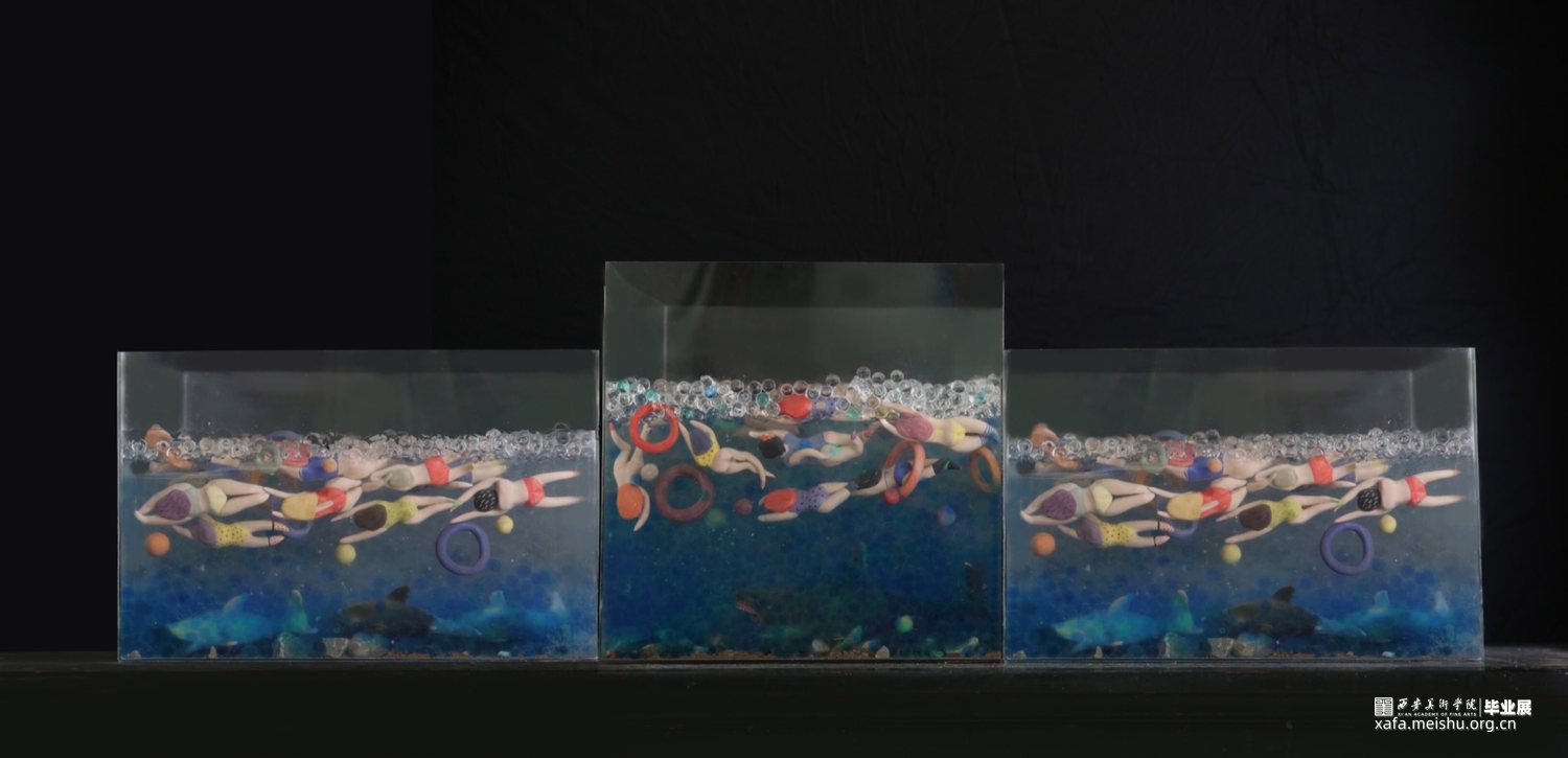 作品采用陶瓷与综合材料相结合,手捏成型、色彩与姿态各异的陶瓷人物,在综合材料塑造成型的海面遨游时,却不知海底暗藏杀机,危险重重,安与危,福与祸,生与死,有时仅一步之遥。月有阴晴圆缺,人有旦夕祸福。人生有生离死别也有爱与希望,只看我们如何去面对。