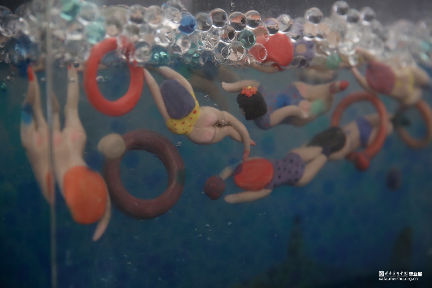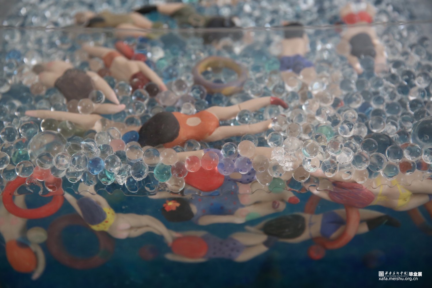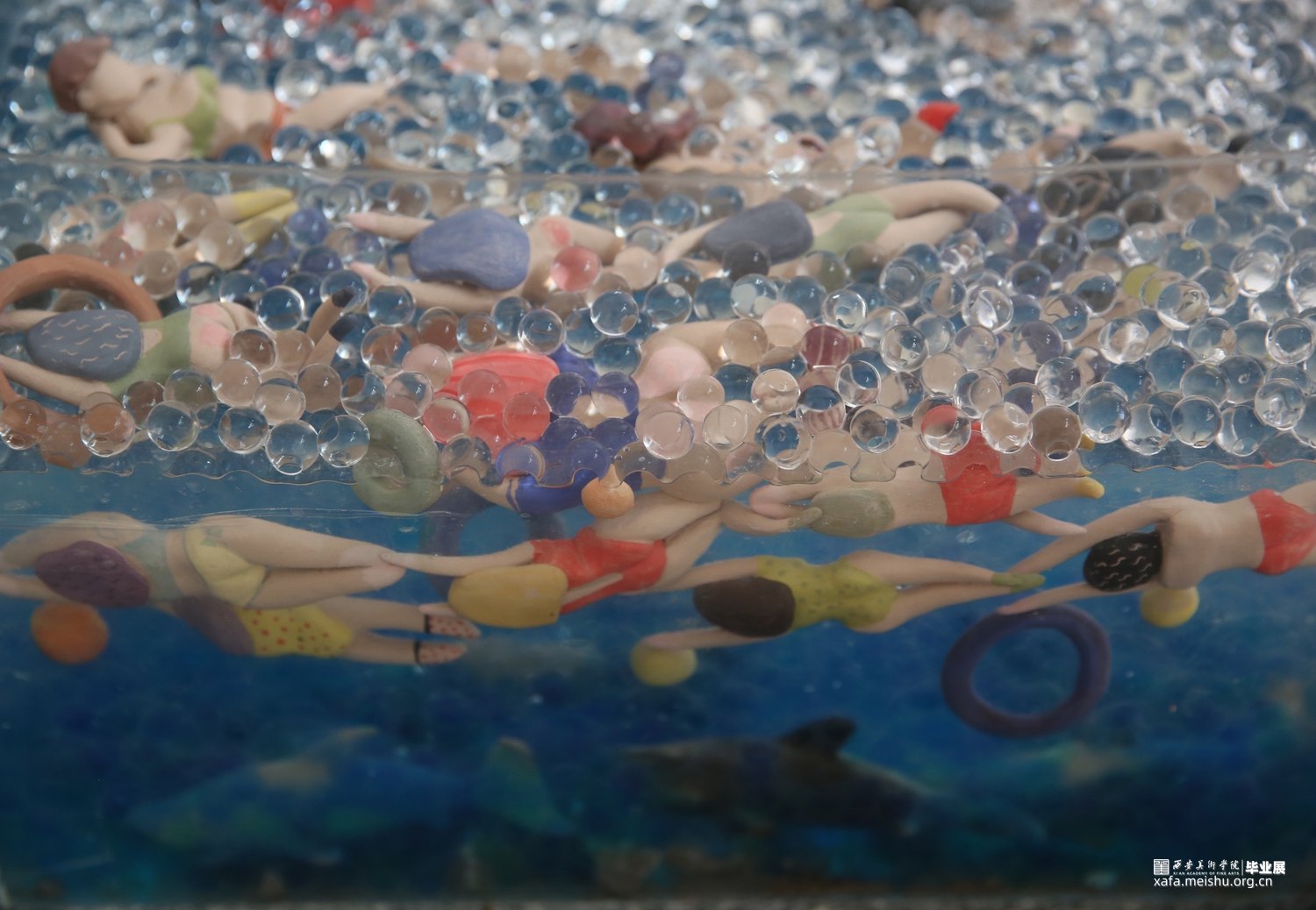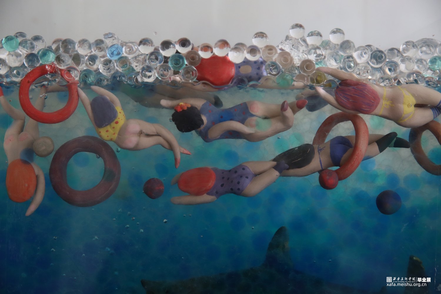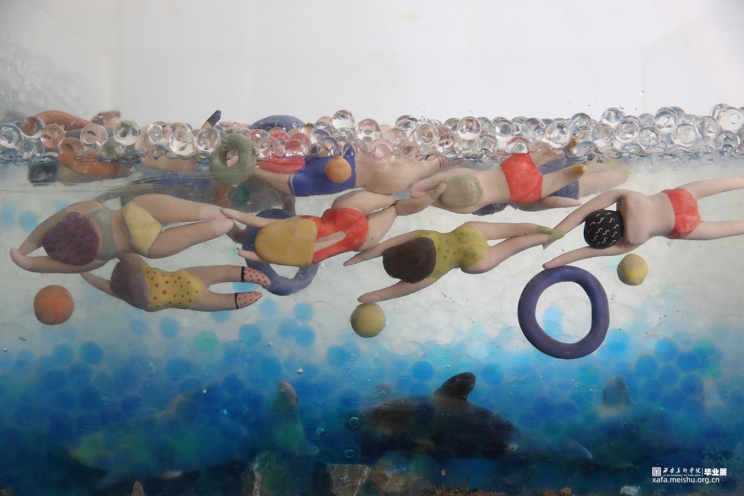 作品采用陶瓷与综合材料相结合,手捏成型、色彩与姿态各异的陶瓷人物,在综合材料塑造成型的海面遨游时,却不知海底暗藏杀机,危险重重,安与危,福与祸,生与死,有时仅一步之遥。月有阴晴圆缺,人有旦夕祸福。人生有生离死别也有爱与希望,只看我们如何去面对。