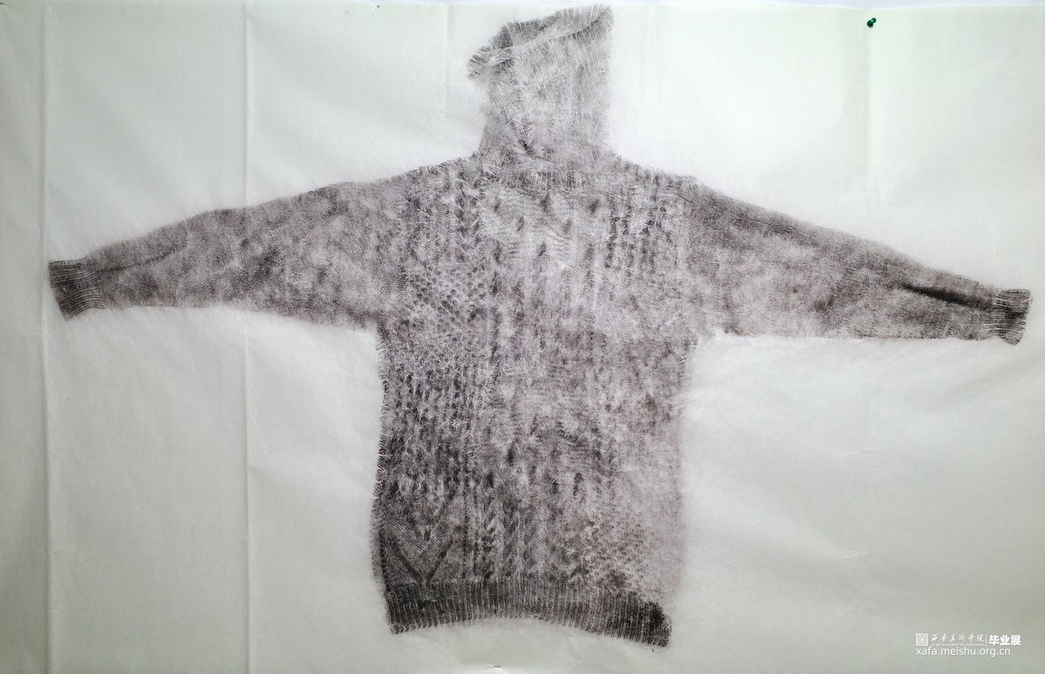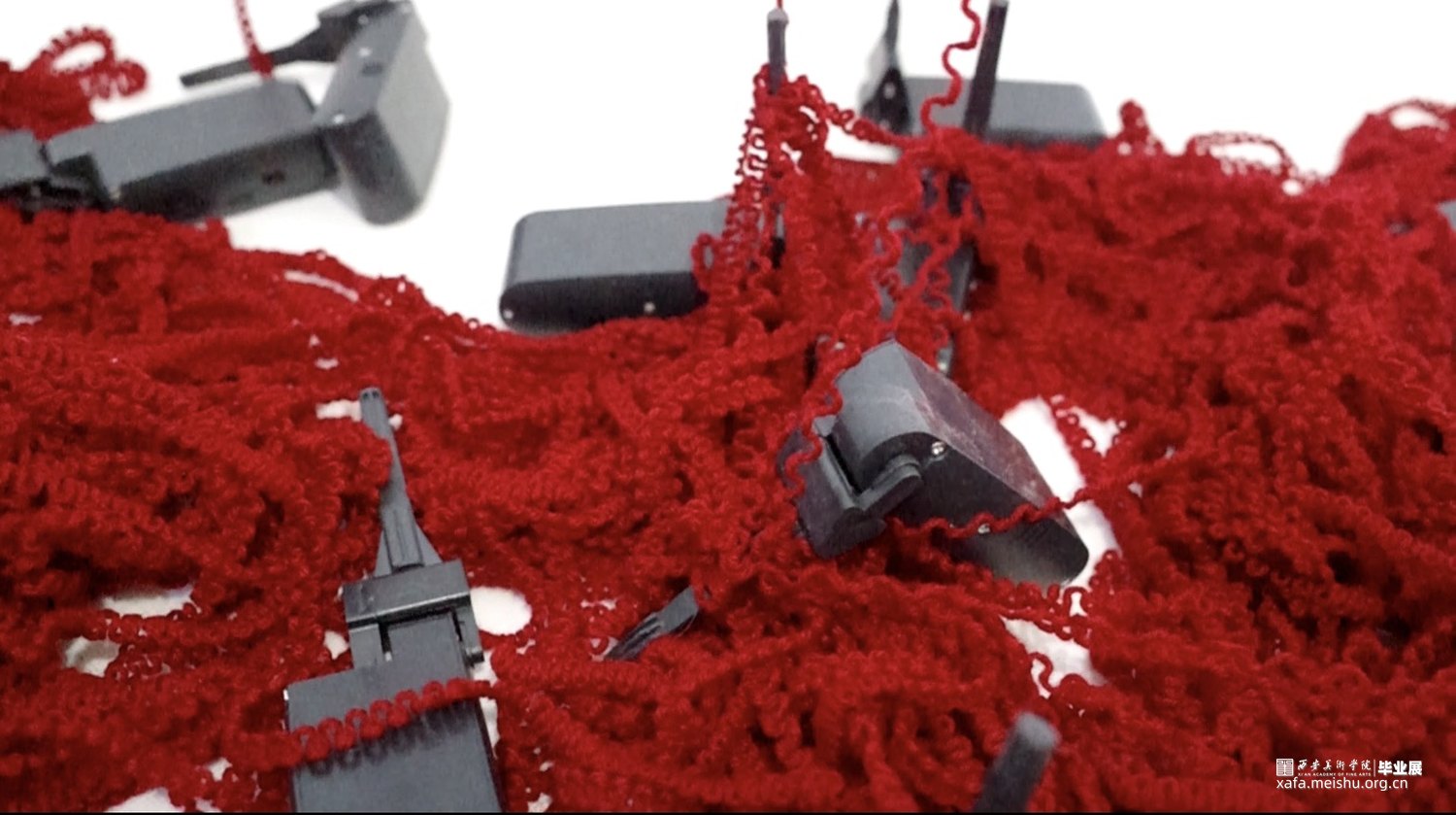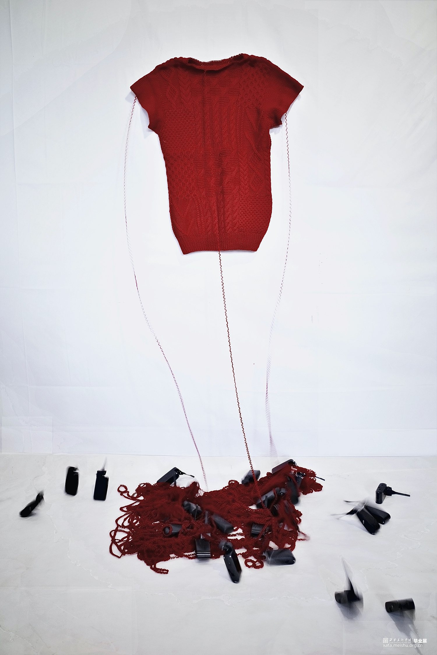 作品名中的差异在于人手与机械,自动和手动,消减与增长,绵延的部分更多的在于作品本身的延续性方面。作品通过对于纤维面料的再生性为切入点,对于简单和复杂作为主要讨论目标做为主旨,相比毛衣简单基础的形式相比,拆除的毛线更具可能性的特点突出了主题。作品通过小电机的不断跳动来拉扯毛衣,作者认为这是一种人的成长,假借毛衣暗喻作者自身的一种成长路径,而拓印的过程全部都由手工来完成,拓片呈现的效果有一种黑灰色同时也暗喻一种新生,同毛衣拆解的鲜红作为对比.