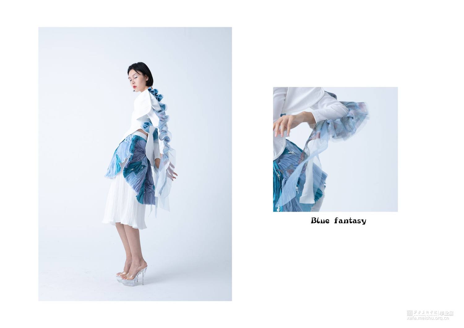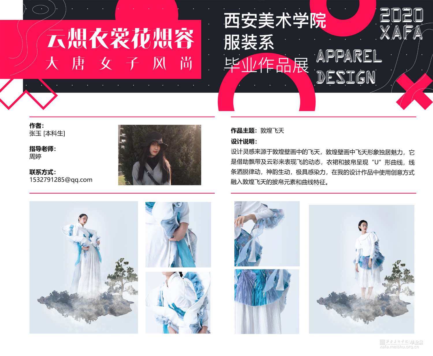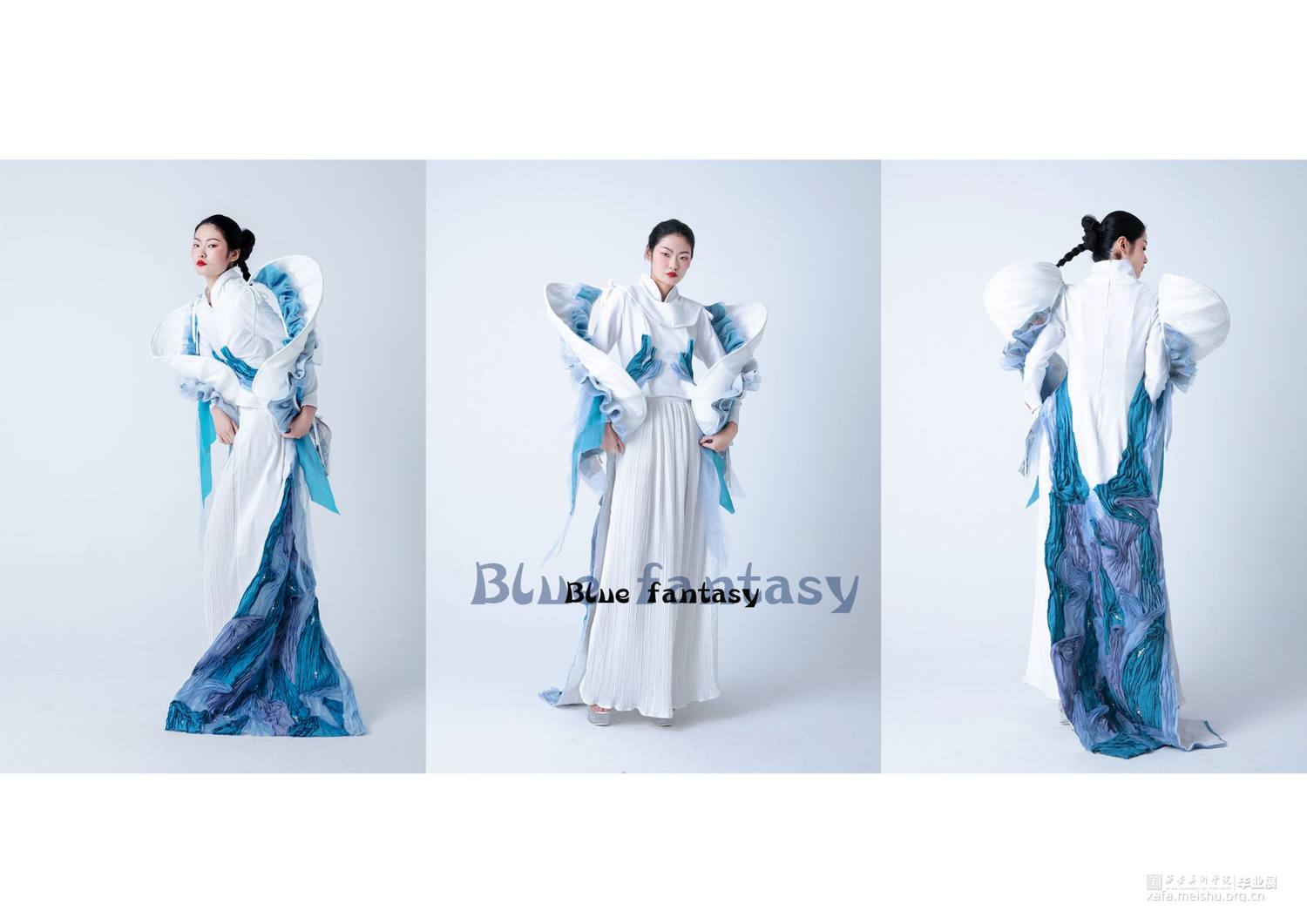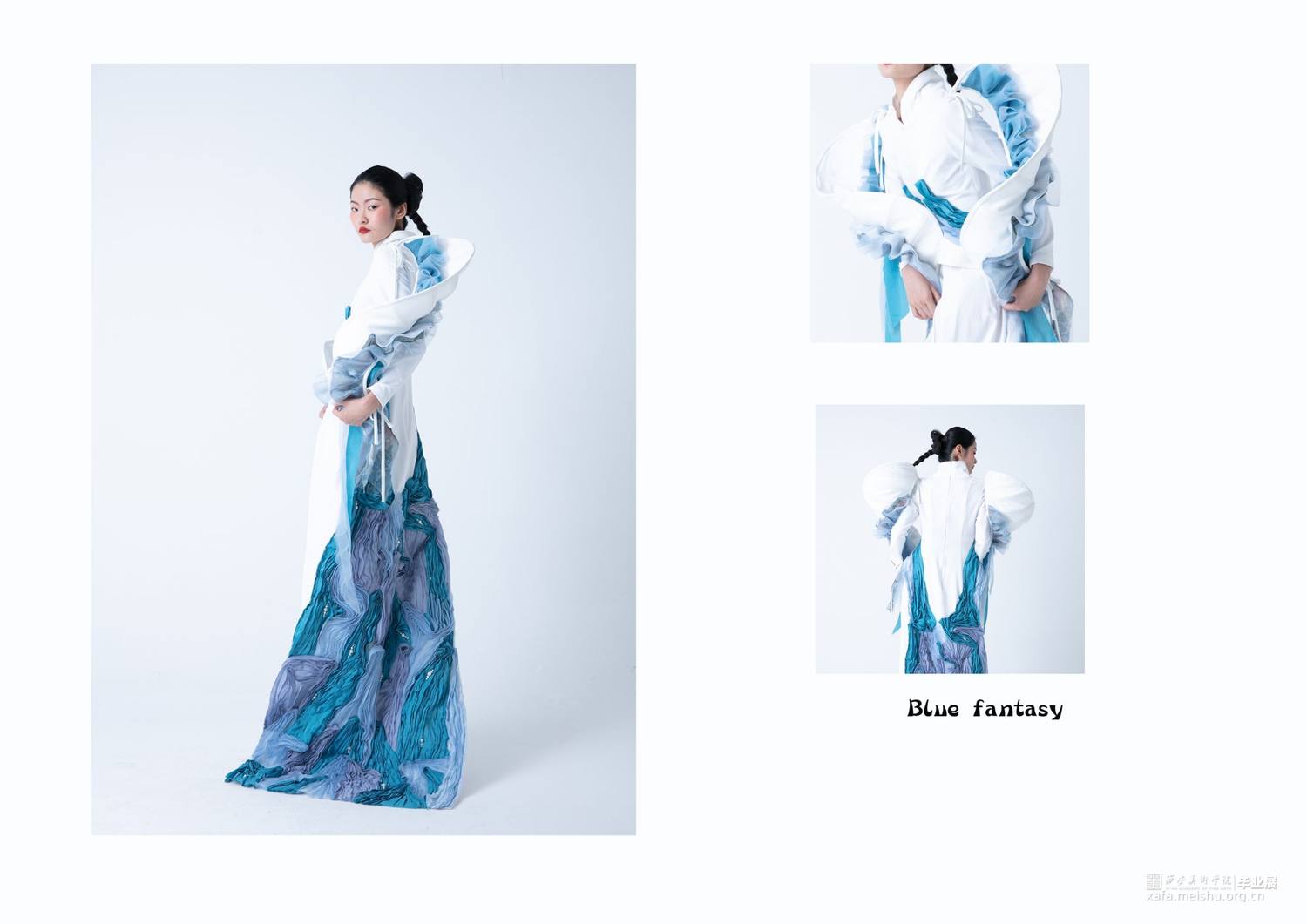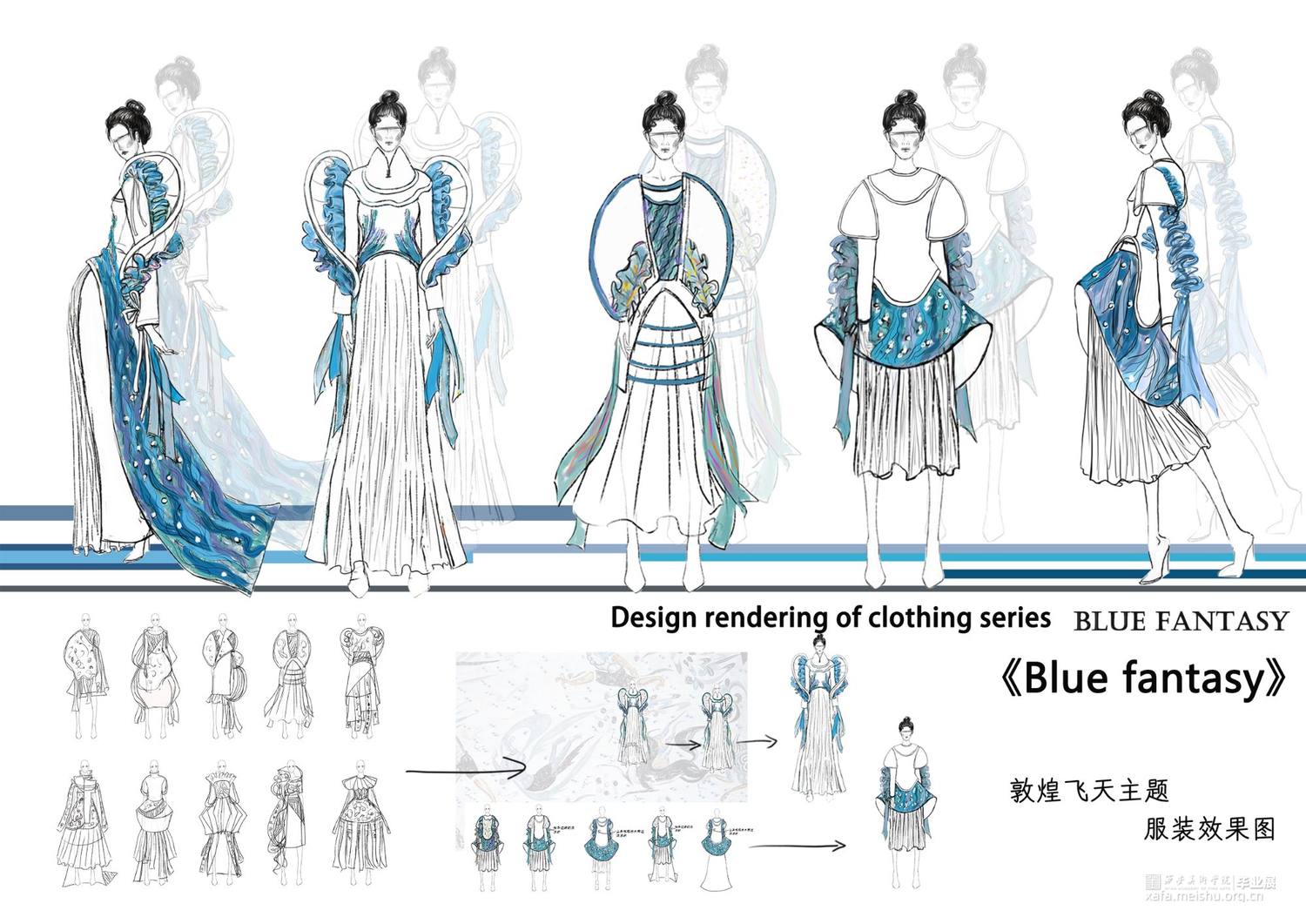 作品灵感来源于敦煌壁画中的飞天,作品提取飞天形象的飘带元素和飞舞时衣裙呈现的“U”型线条元素。并把这种线条的韵律美与女性身体独特的曲线美相结合,服装使用纯洁的白色和蓝色,表现自由富于浪漫的服装曲线,作品取名译为蓝色幻想,通过飞天表达人们追求永恒的纯净、安详、欢乐、自由,它是一种超越现实的幻想,是一种浪漫的追求。