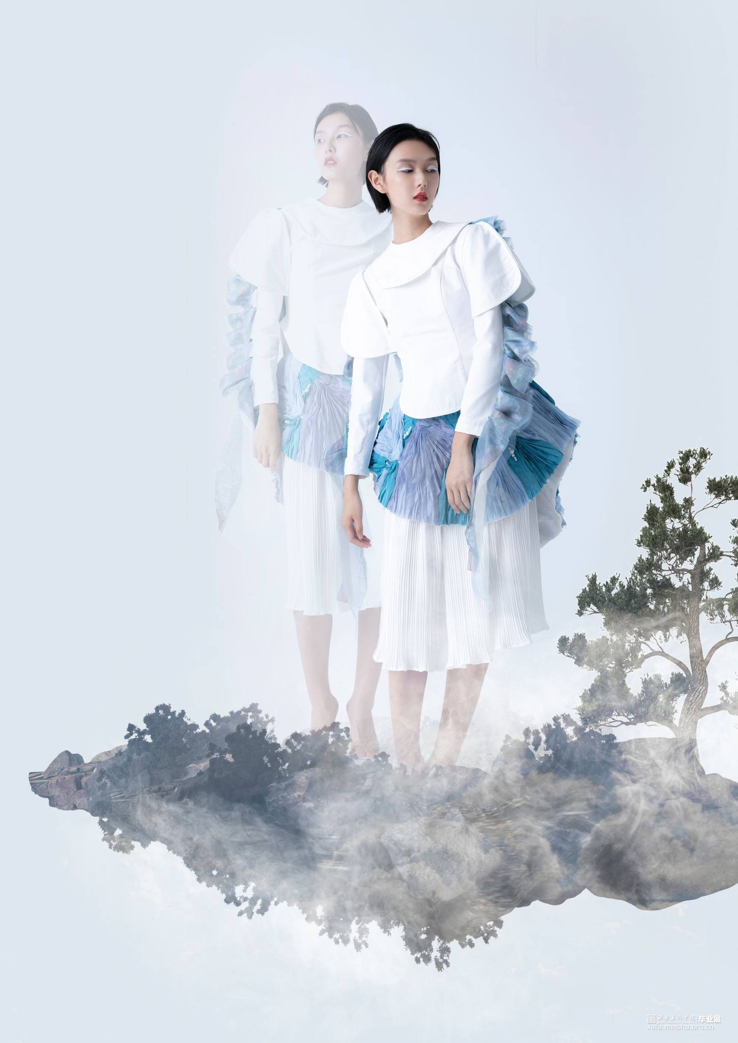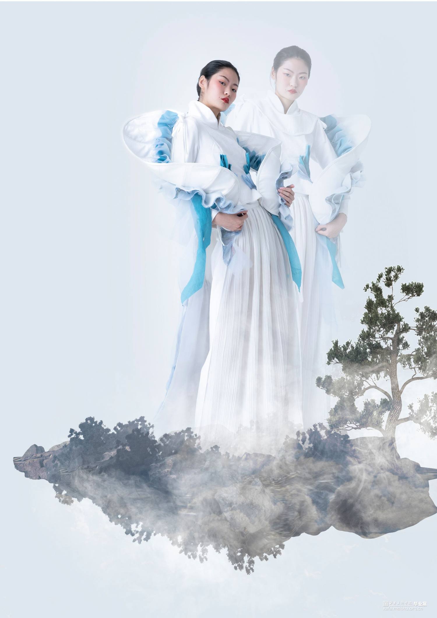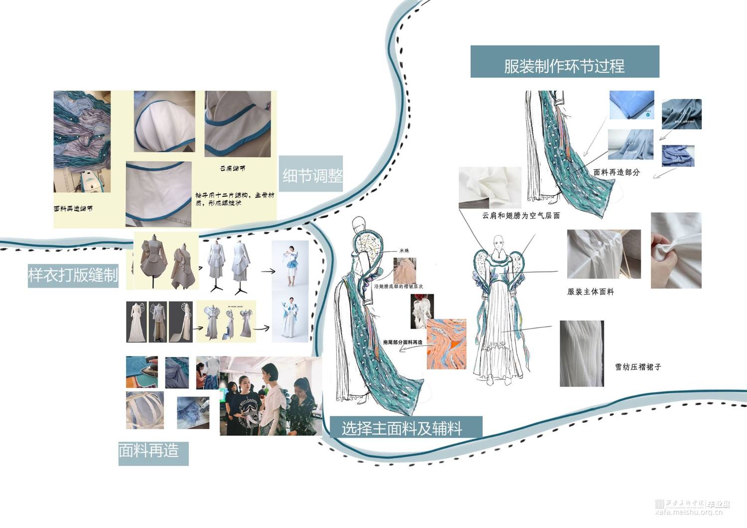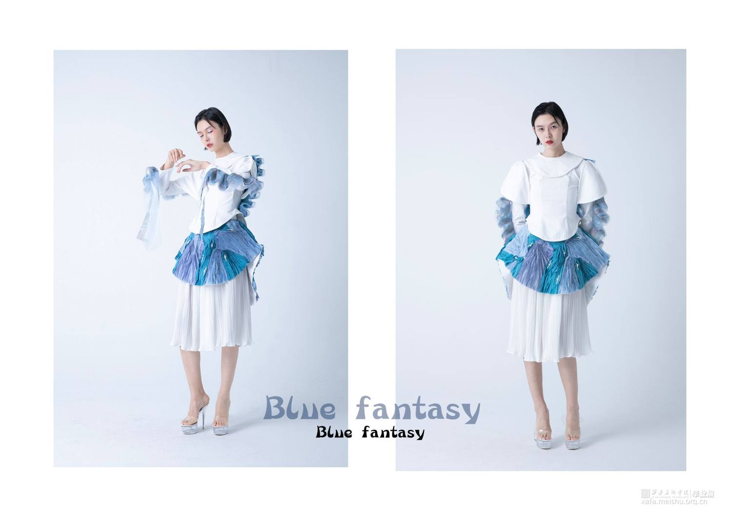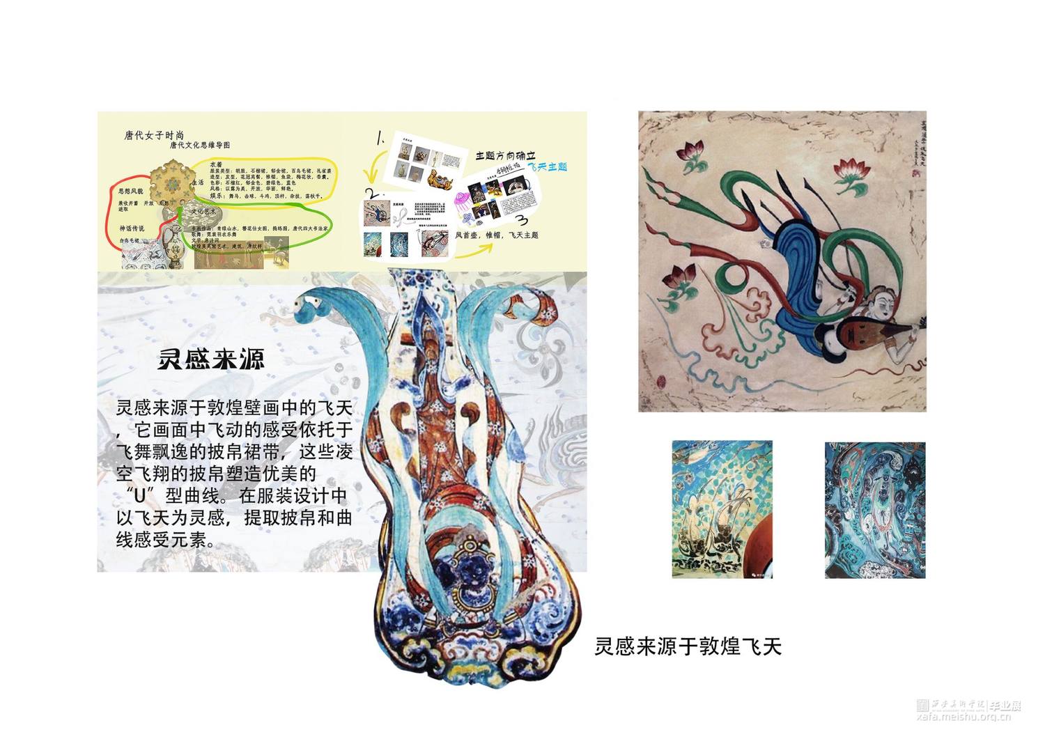 作品灵感来源于敦煌壁画中的飞天,作品提取飞天形象的飘带元素和飞舞时衣裙呈现的“U”型线条元素。并把这种线条的韵律美与女性身体独特的曲线美相结合,服装使用纯洁的白色和蓝色,表现自由富于浪漫的服装曲线,作品取名译为蓝色幻想,通过飞天表达人们追求永恒的纯净、安详、欢乐、自由,它是一种超越现实的幻想,是一种浪漫的追求。