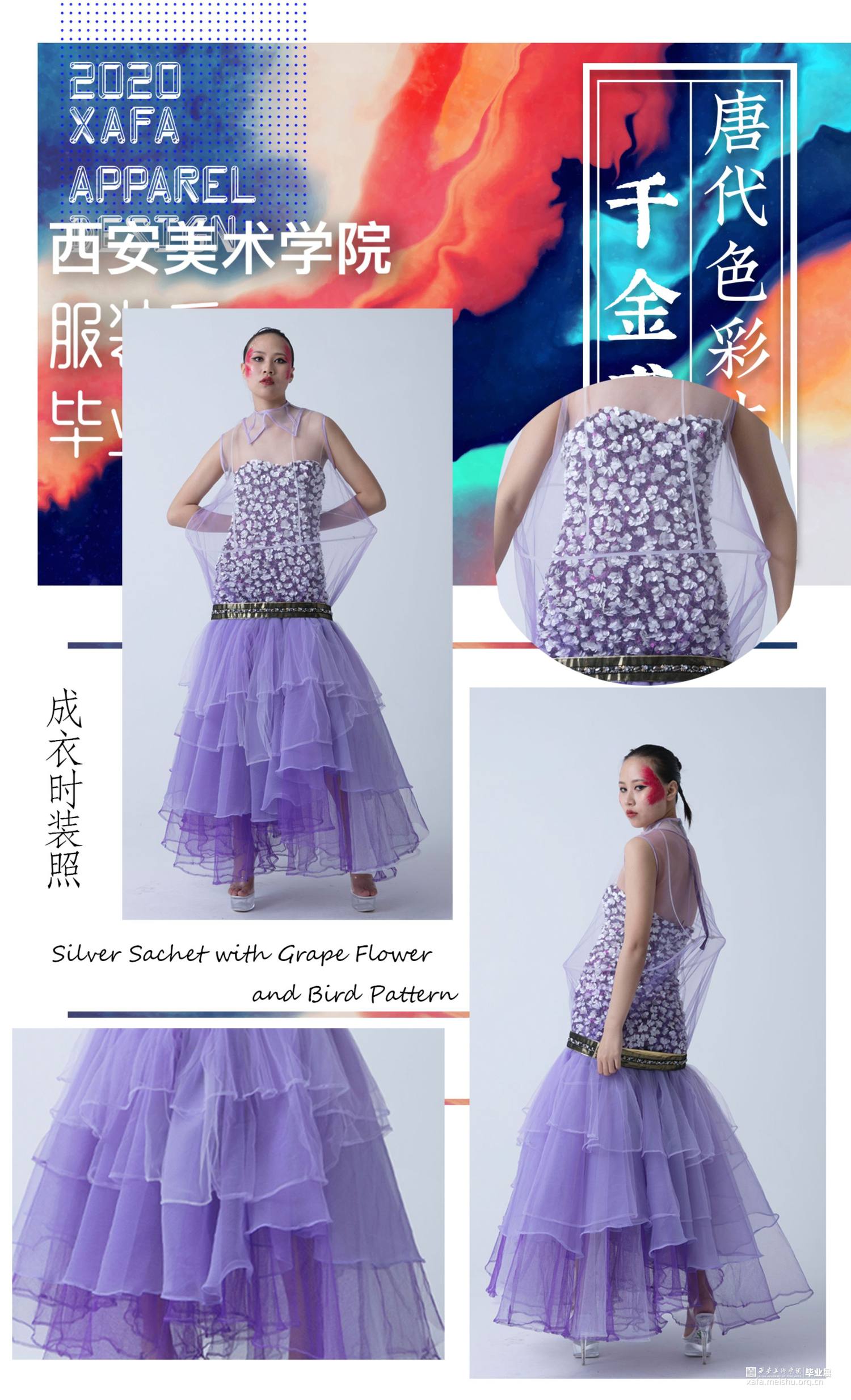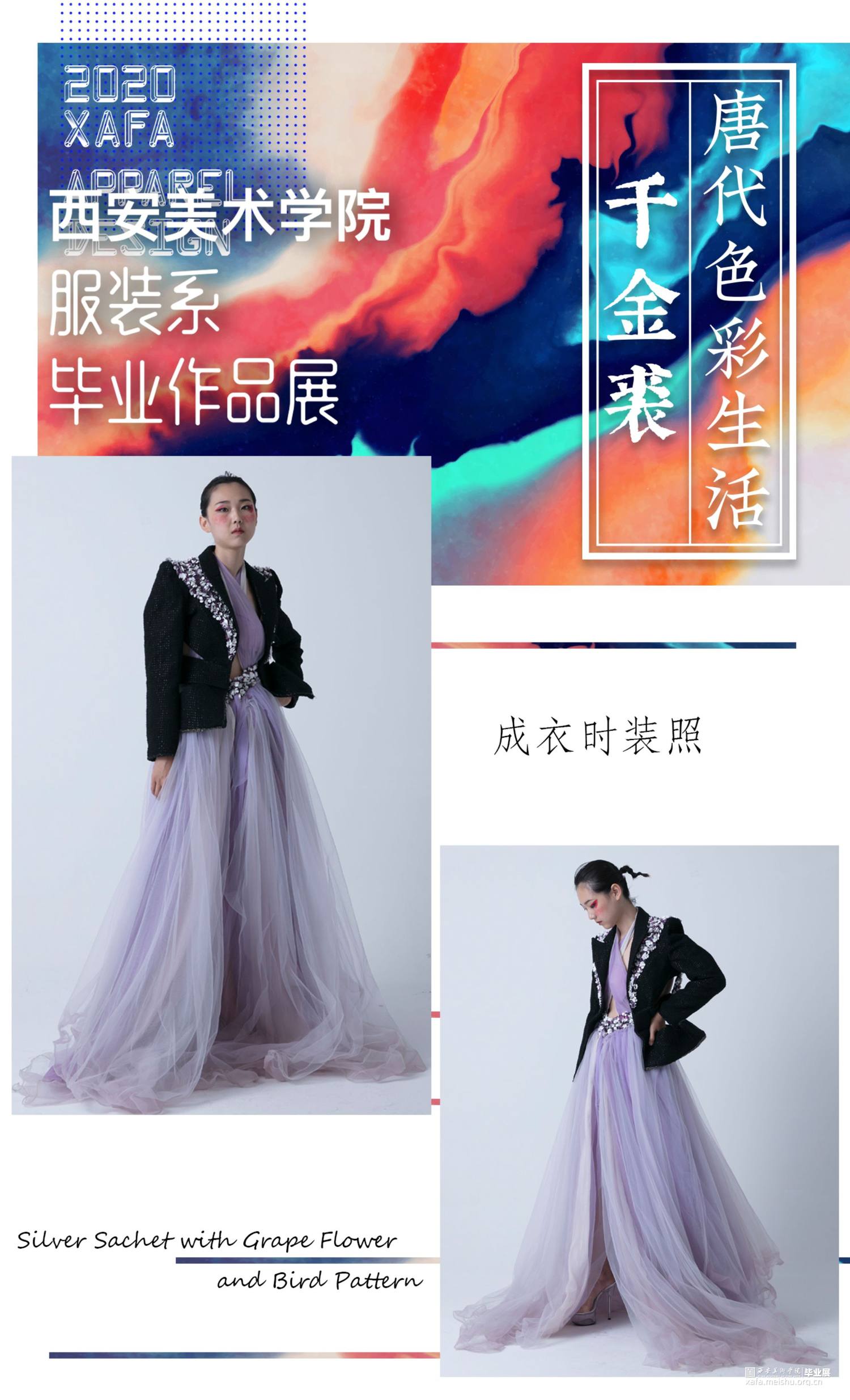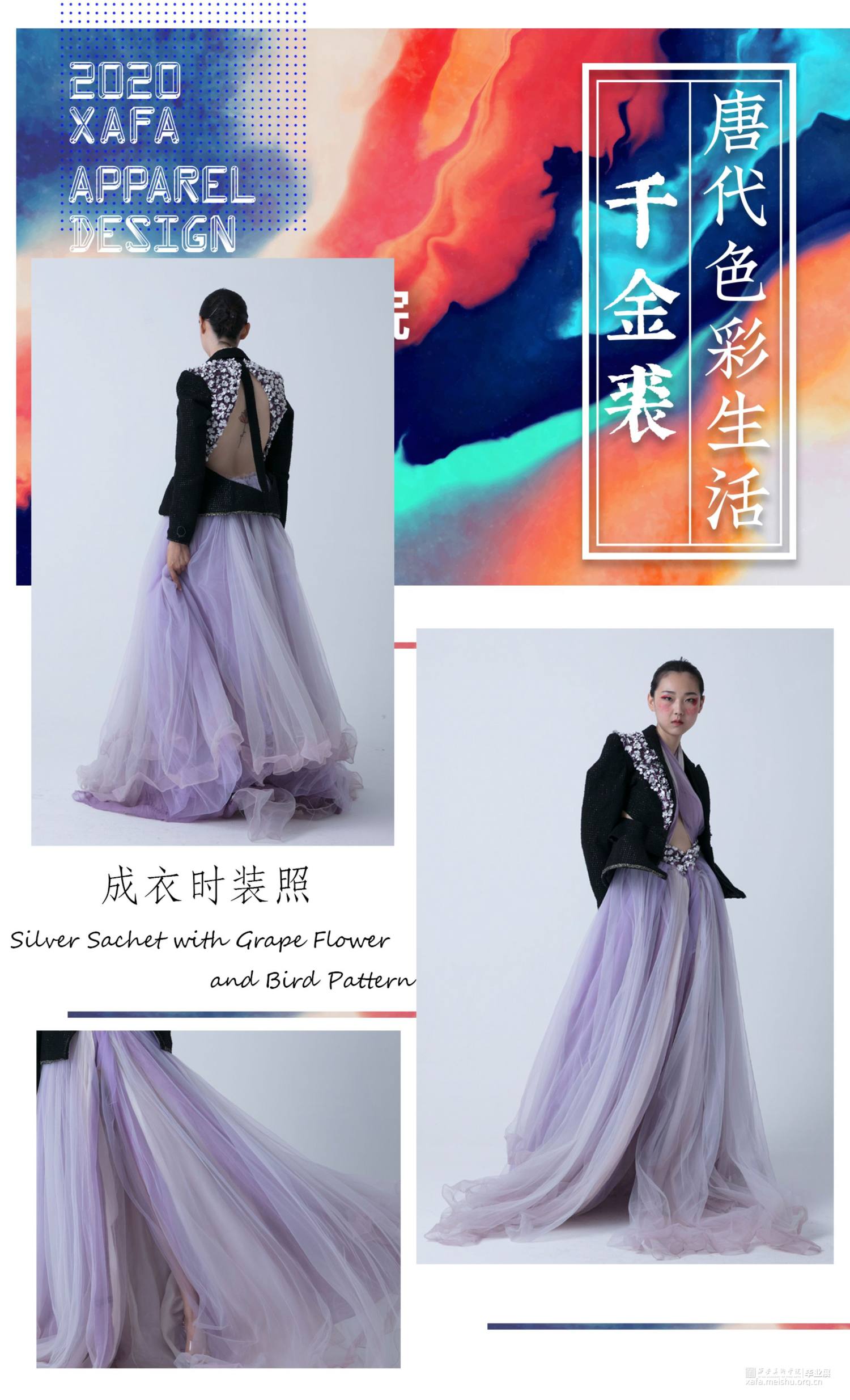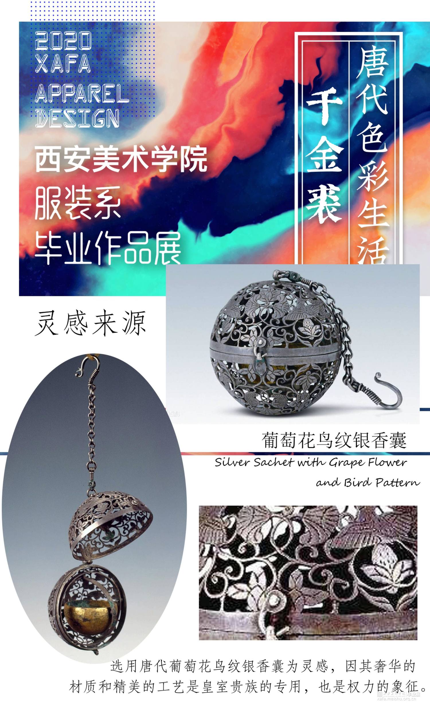 作品主要以陕西何家村的遗宝唐代葡萄花鸟纹银香囊与高级成衣定制的理念融合,从唐代遗宝来和现代结合的设计理念,给人以“有韵味,有历史,有传奇”的冲击视角,具有强烈的当代女性的知性与优雅特征。
