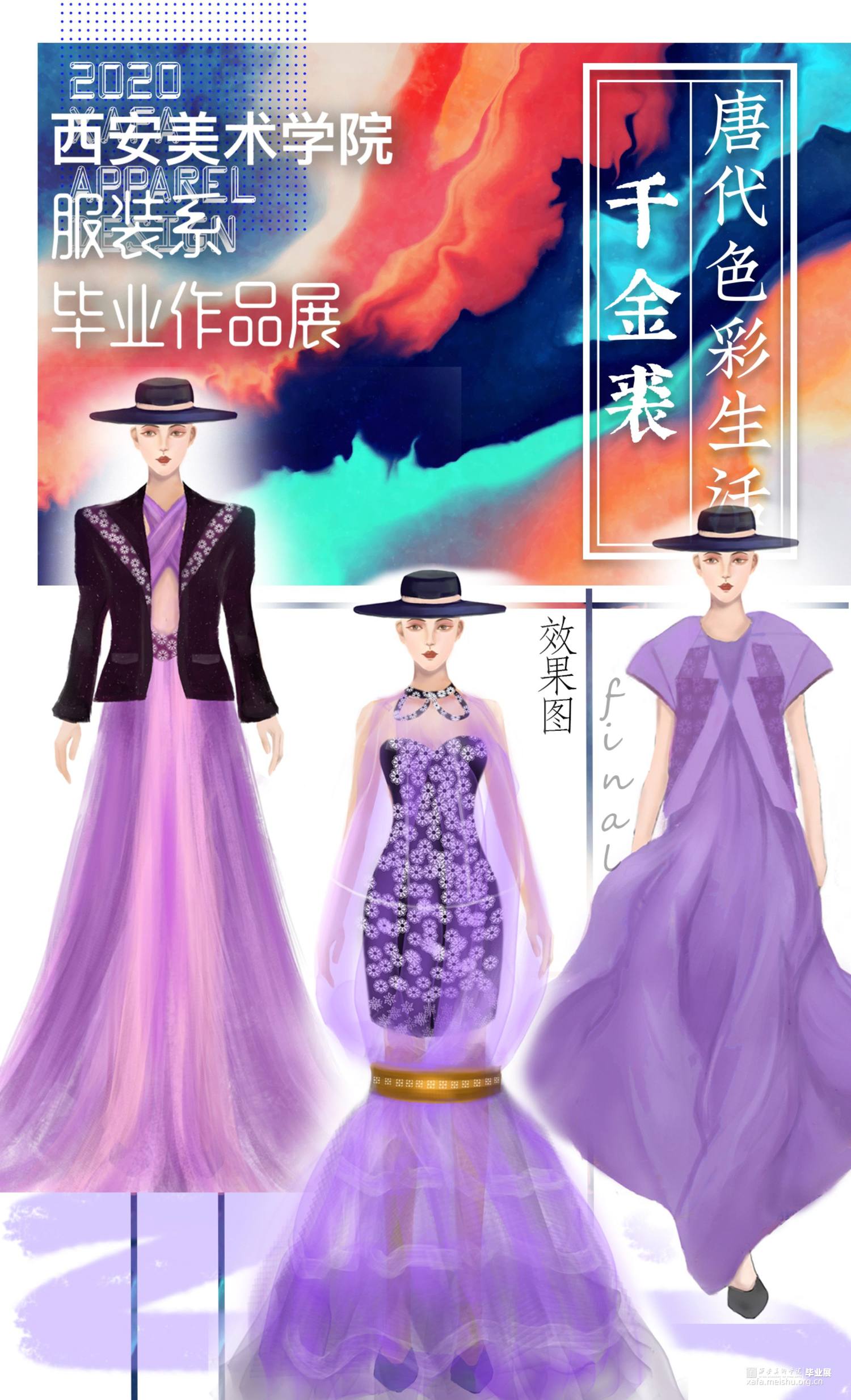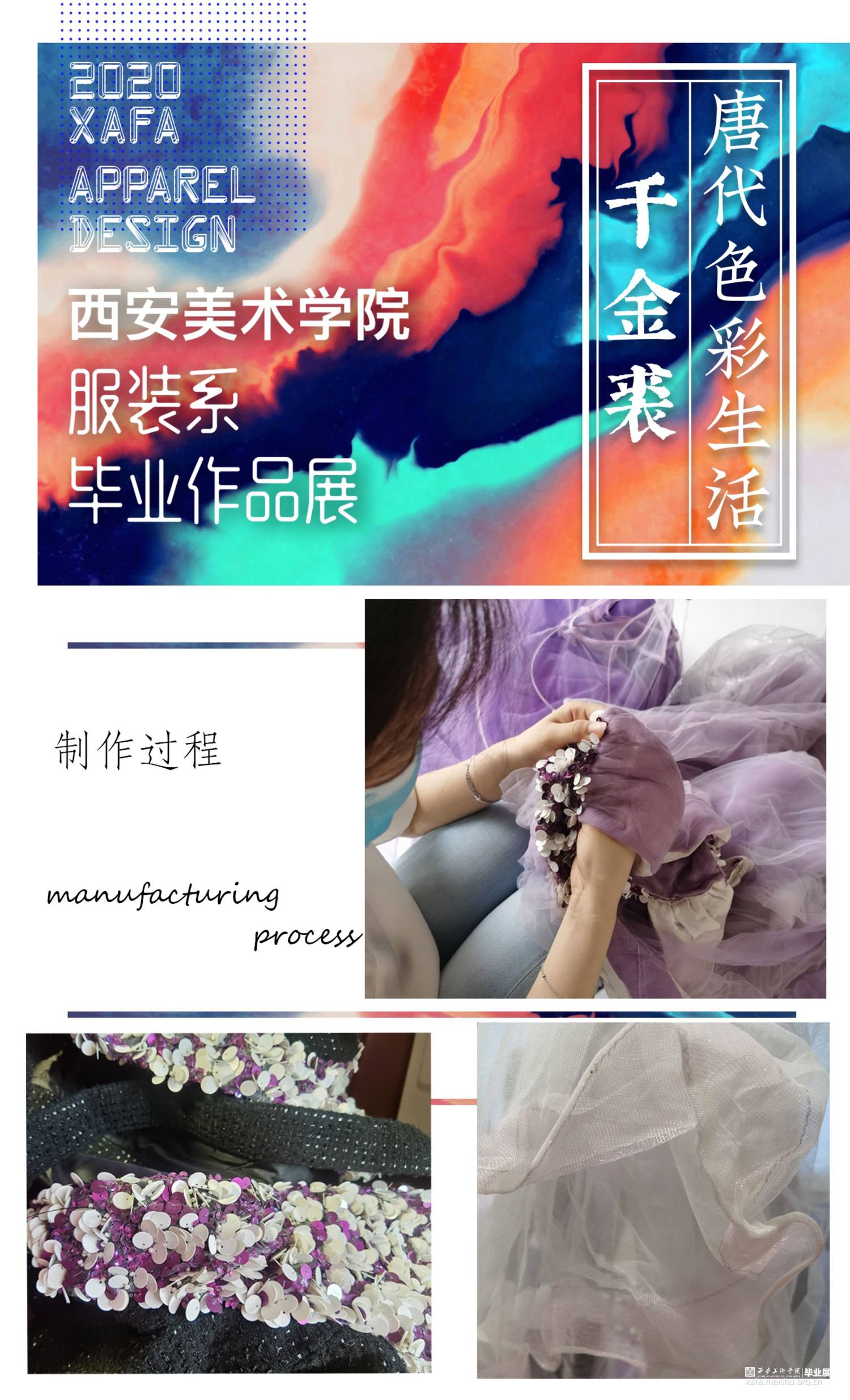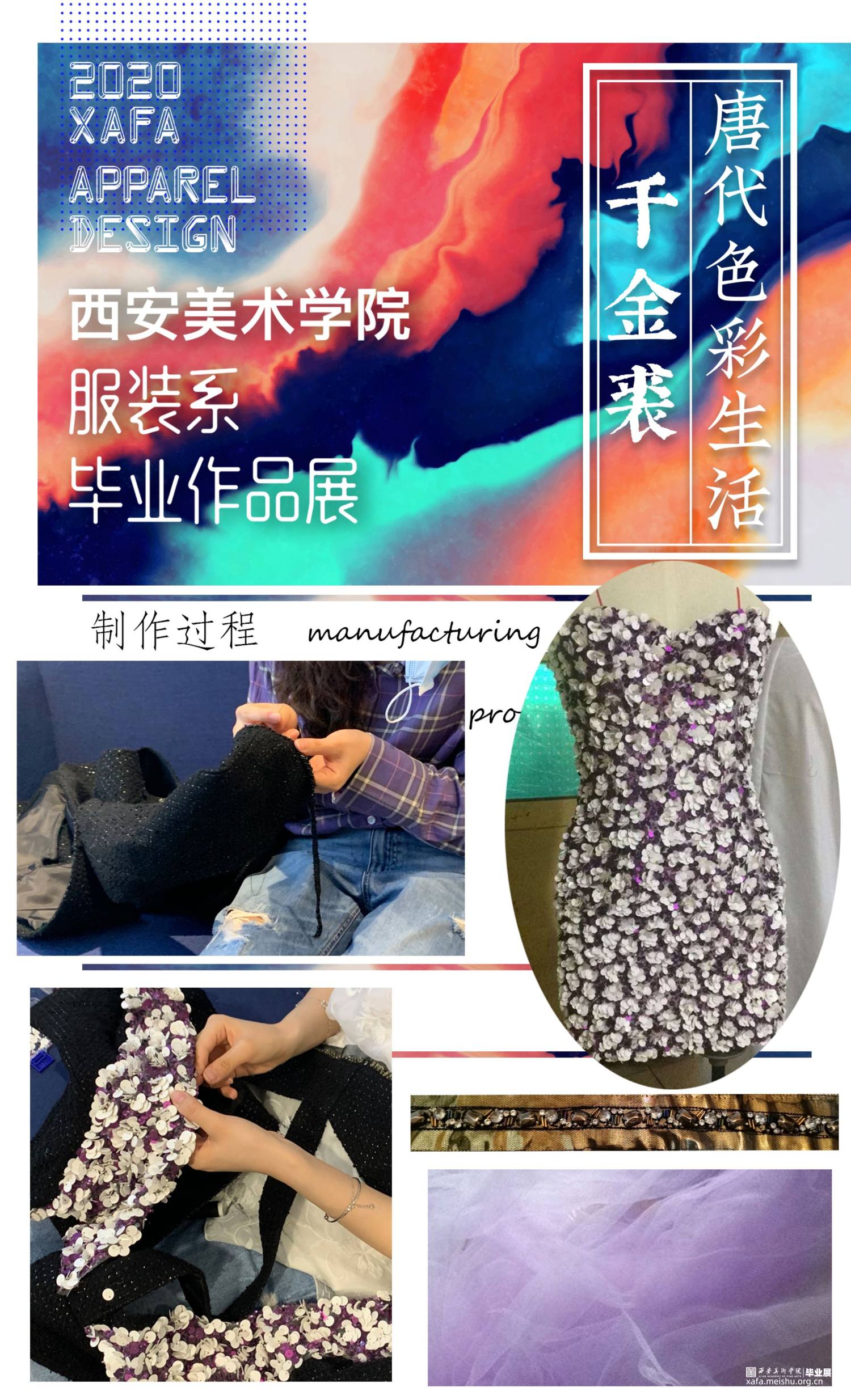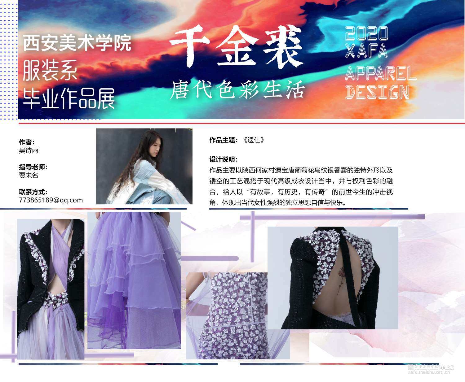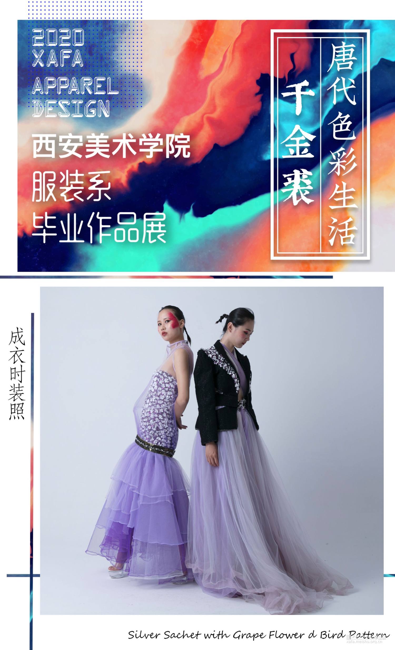 作品主要以陕西何家村的遗宝唐代葡萄花鸟纹银香囊与高级成衣定制的理念融合,从唐代遗宝来和现代结合的设计理念,给人以“有韵味,有历史,有传奇”的冲击视角,具有强烈的当代女性的知性与优雅特征。