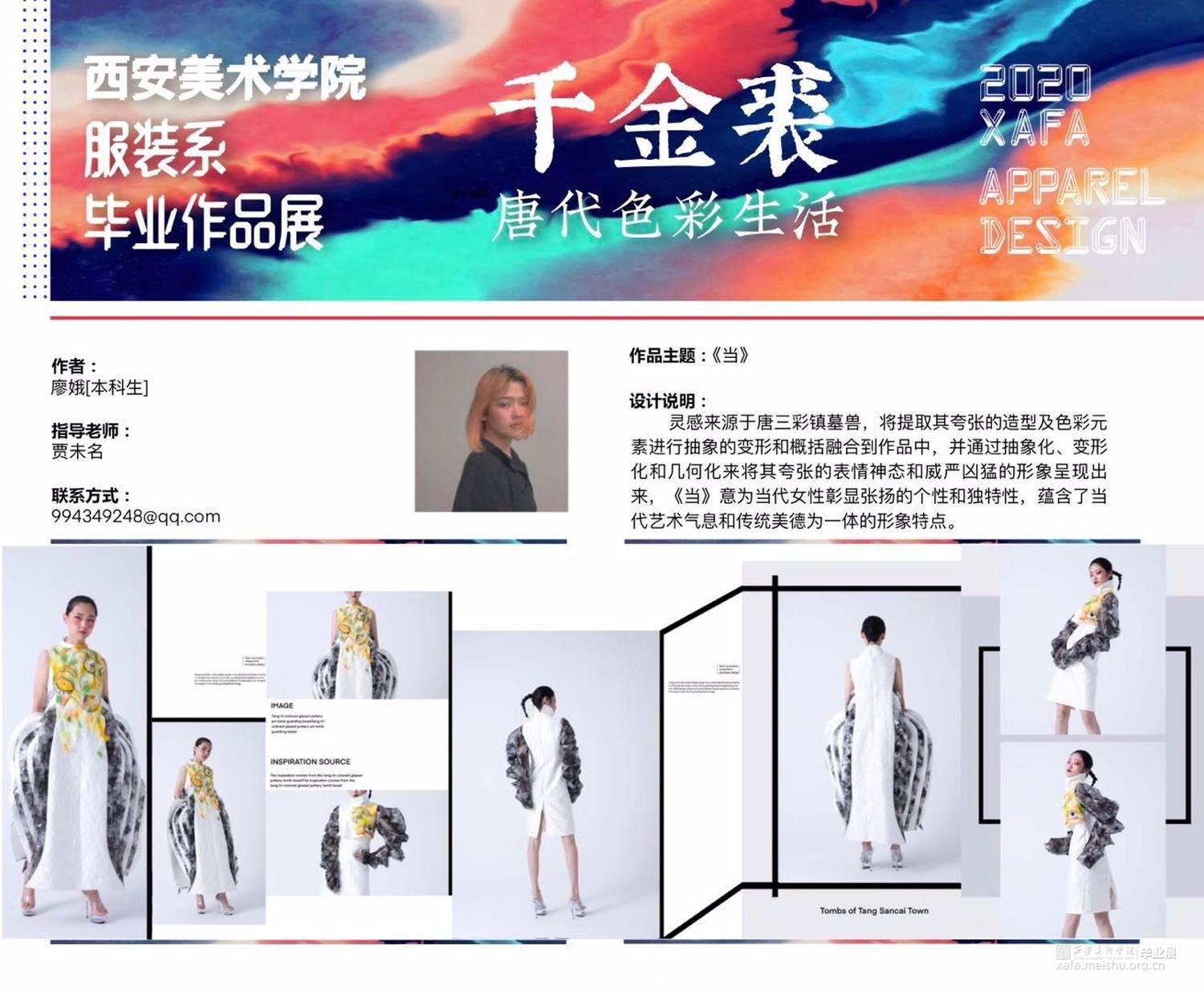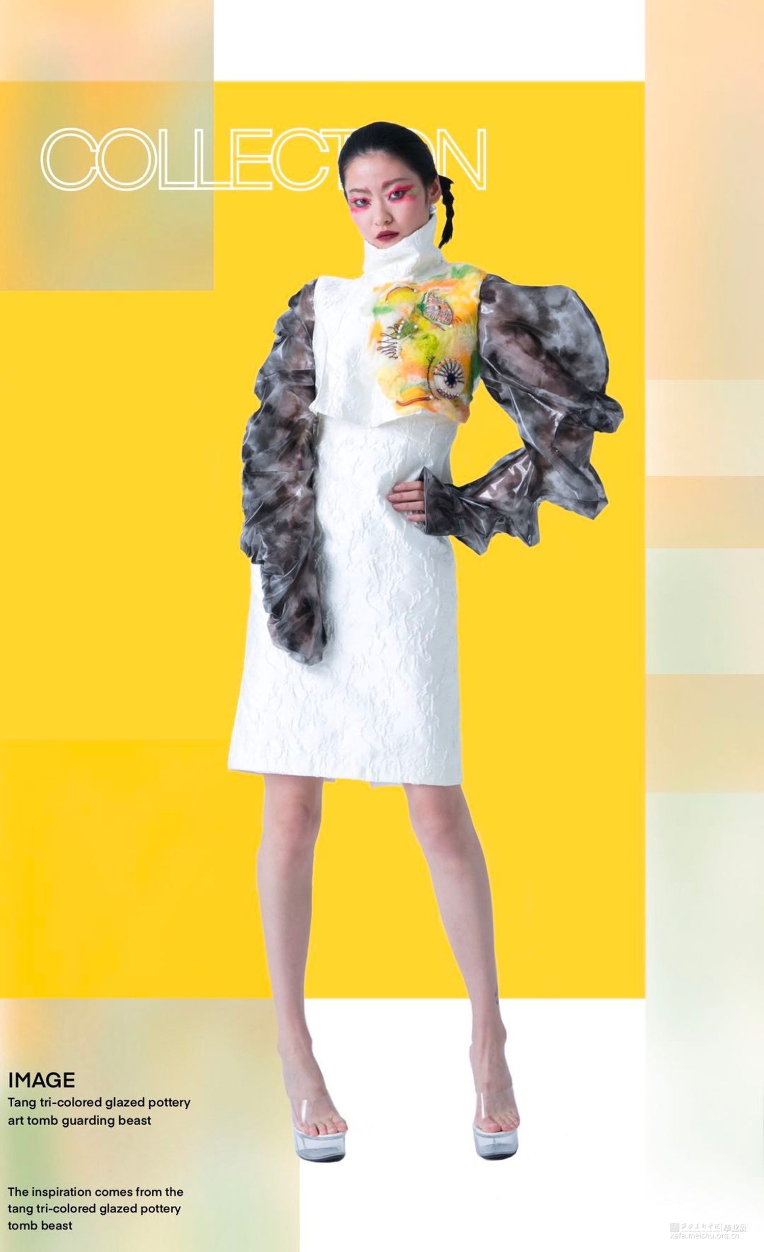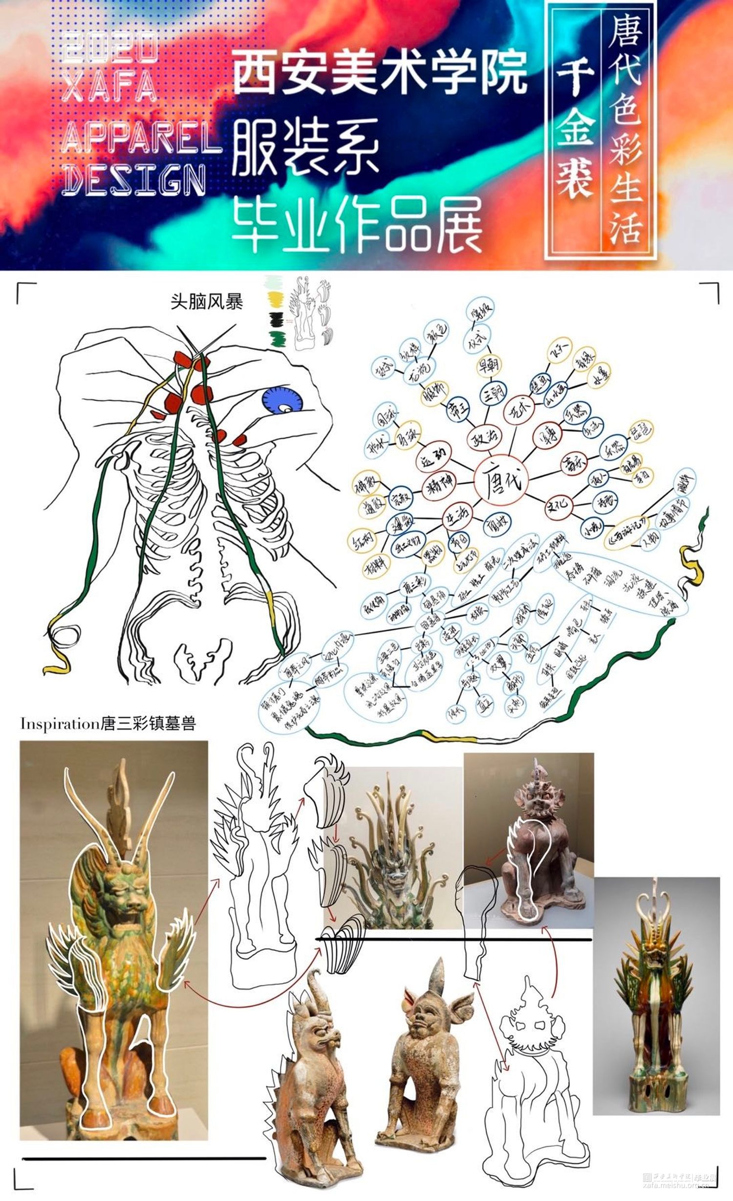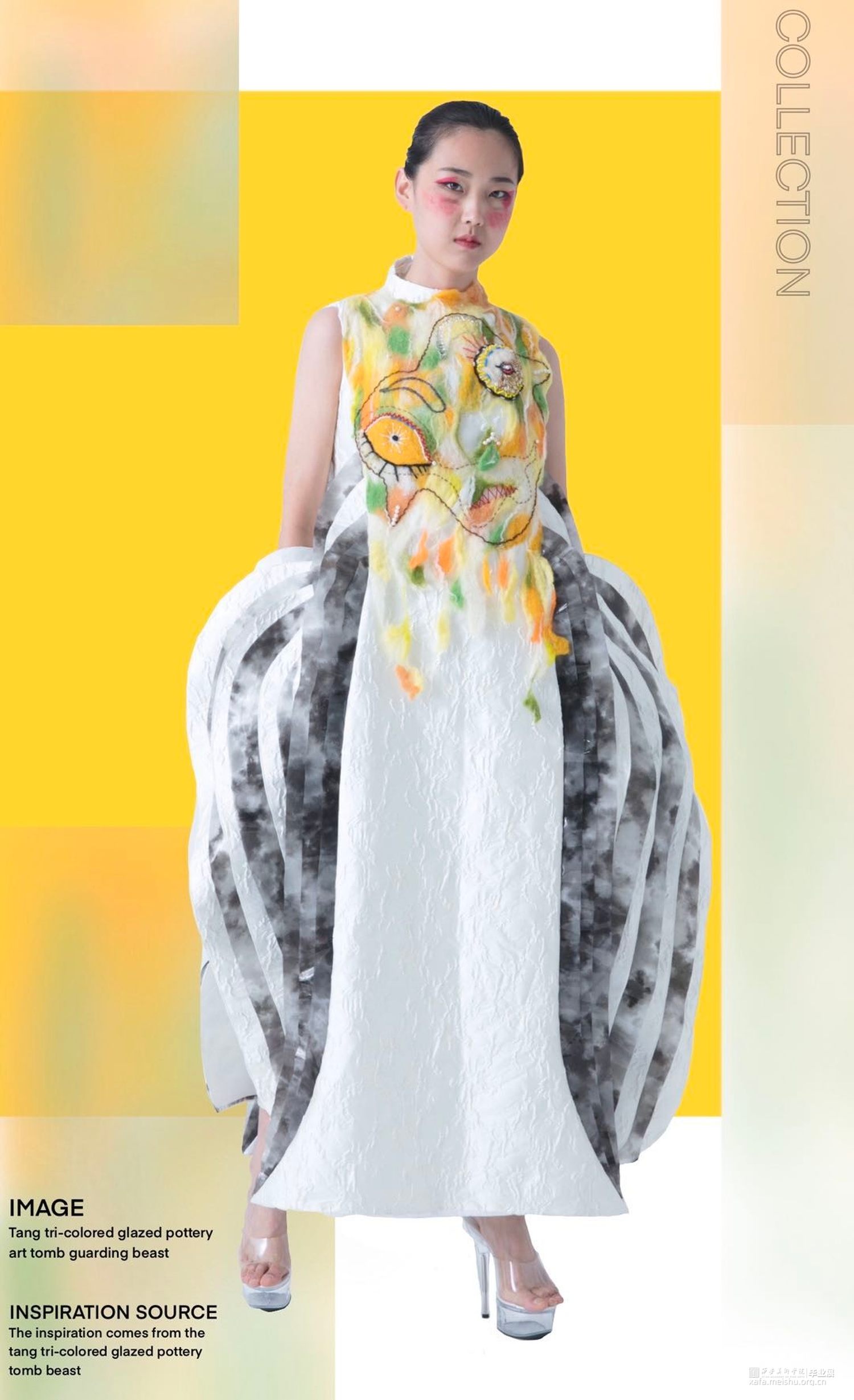 作品灵感来源于传统文化——唐三彩镇墓兽。从唐三彩镇墓兽的色彩、造型和制作工艺等方面进行分析、拓展及整合,然后提取夸张的造型和艳丽协调的色彩等元素进行抽象变形和概括融合到作品中,并通过抽象化、变形化和几何化的方法来体现形似性,将扇形的双翼、粗壮的四肢和凸起的胸部等特征进行拆分、转换、变形和重组,意将其夸张的表情神态和威严凶猛的独特形象呈现出来。《当》意为当代女性有着镇墓兽的张扬的个性及独特性,蕴含了当代艺术和传统美德为一体的形象特点。
