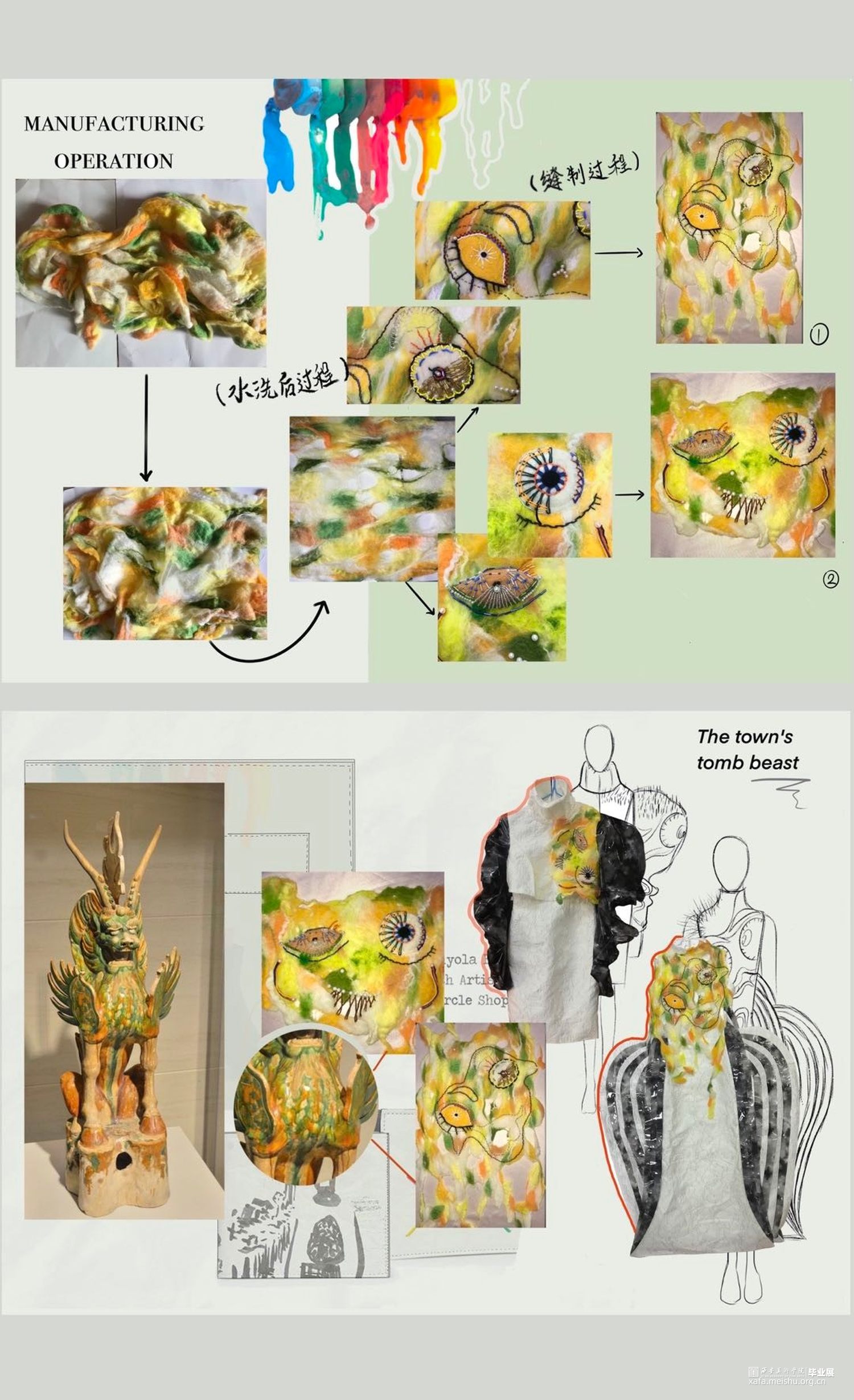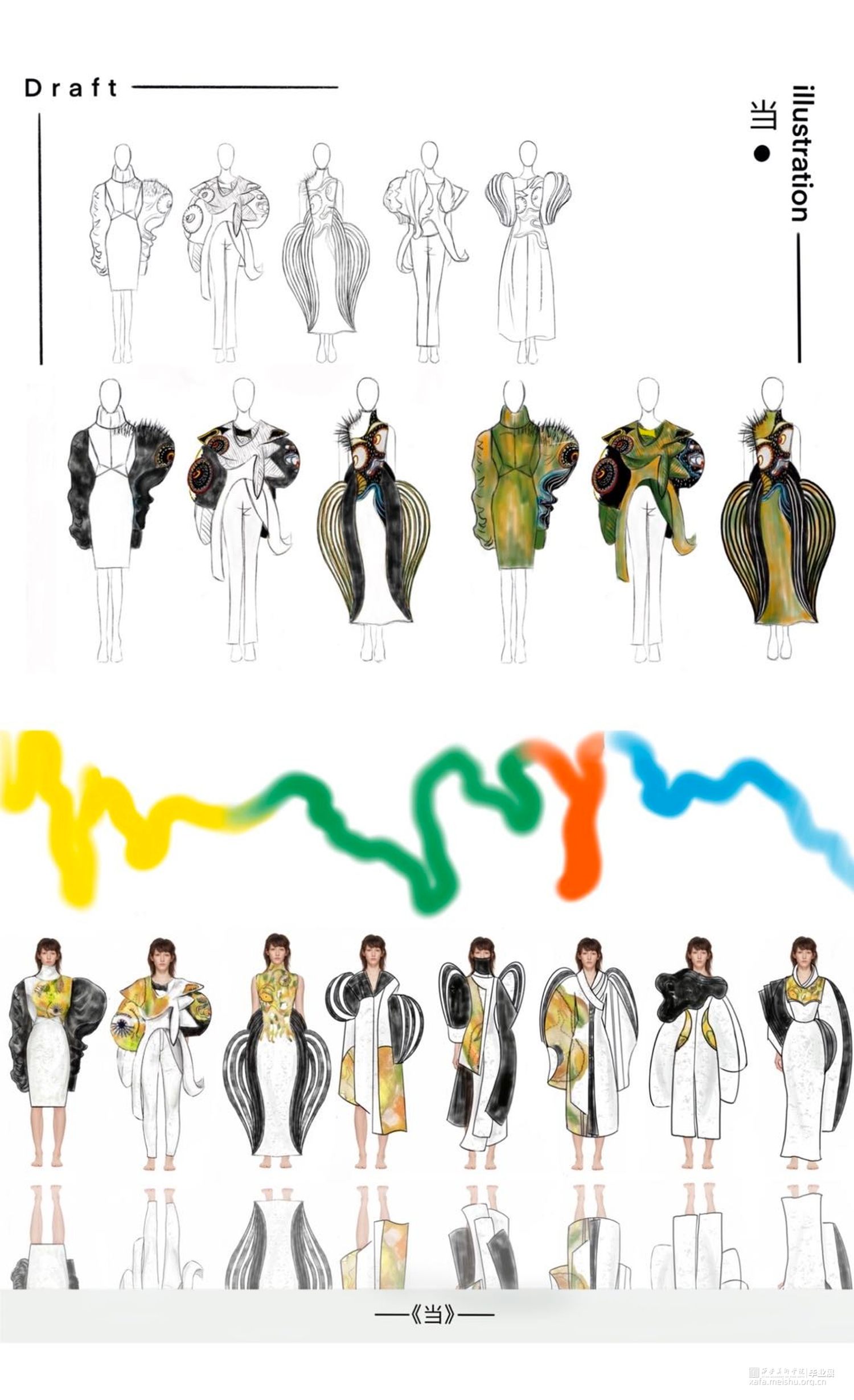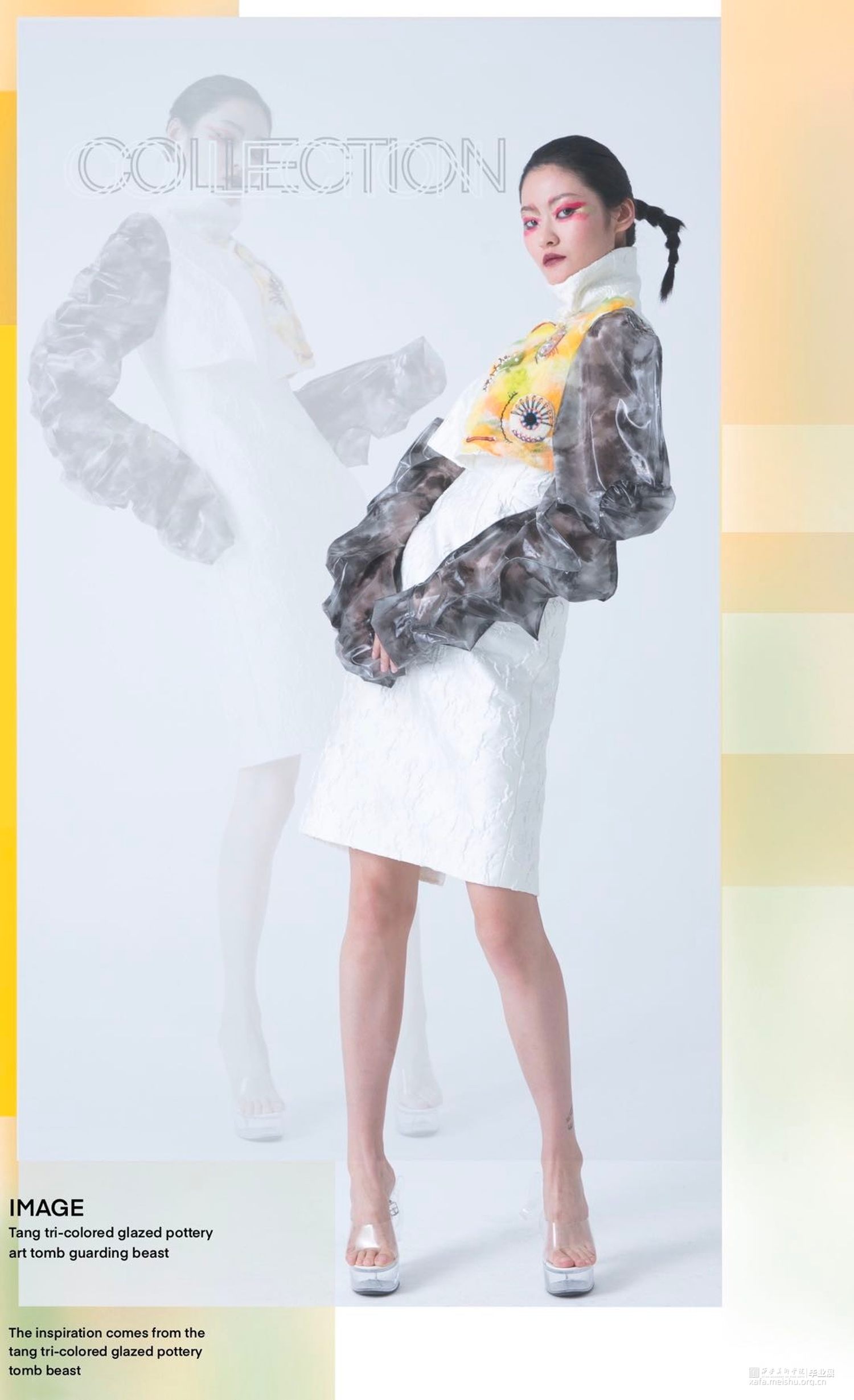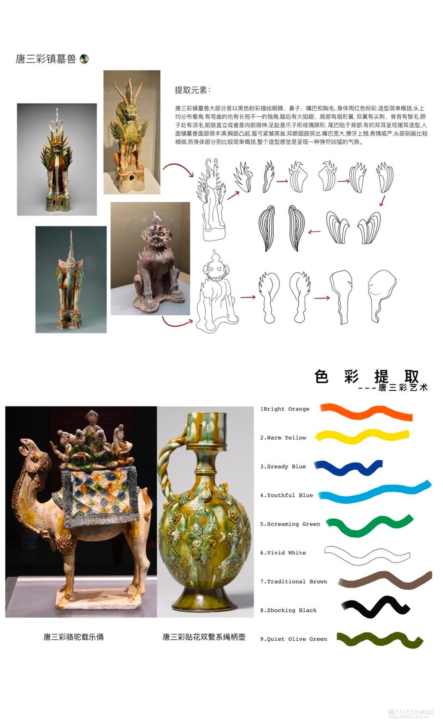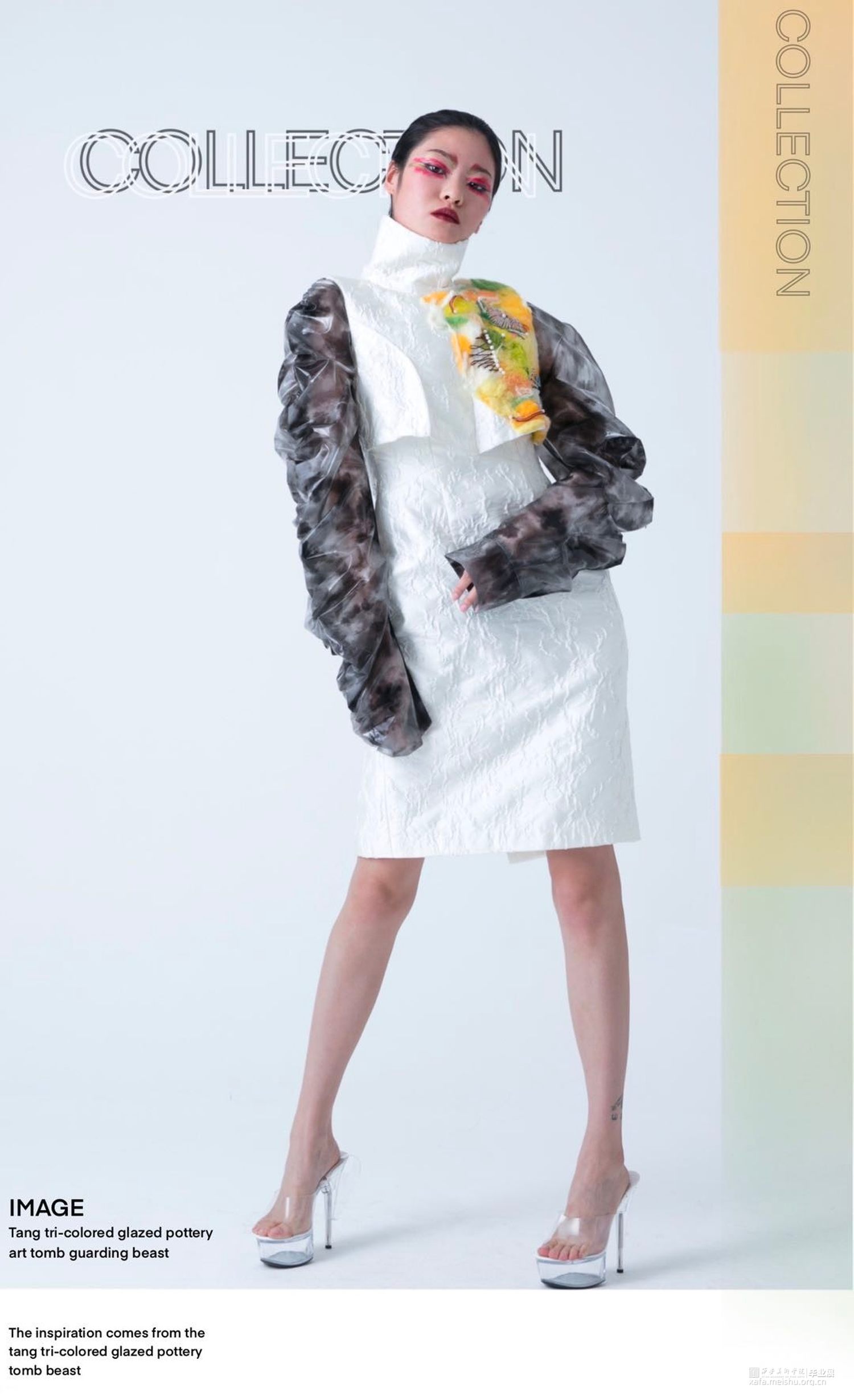 作品灵感来源于传统文化——唐三彩镇墓兽。从唐三彩镇墓兽的色彩、造型和制作工艺等方面进行分析、拓展及整合,然后提取夸张的造型和艳丽协调的色彩等元素进行抽象变形和概括融合到作品中,并通过抽象化、变形化和几何化的方法来体现形似性,将扇形的双翼、粗壮的四肢和凸起的胸部等特征进行拆分、转换、变形和重组,意将其夸张的表情神态和威严凶猛的独特形象呈现出来。《当》意为当代女性有着镇墓兽的张扬的个性及独特性,蕴含了当代艺术和传统美德为一体的形象特点。