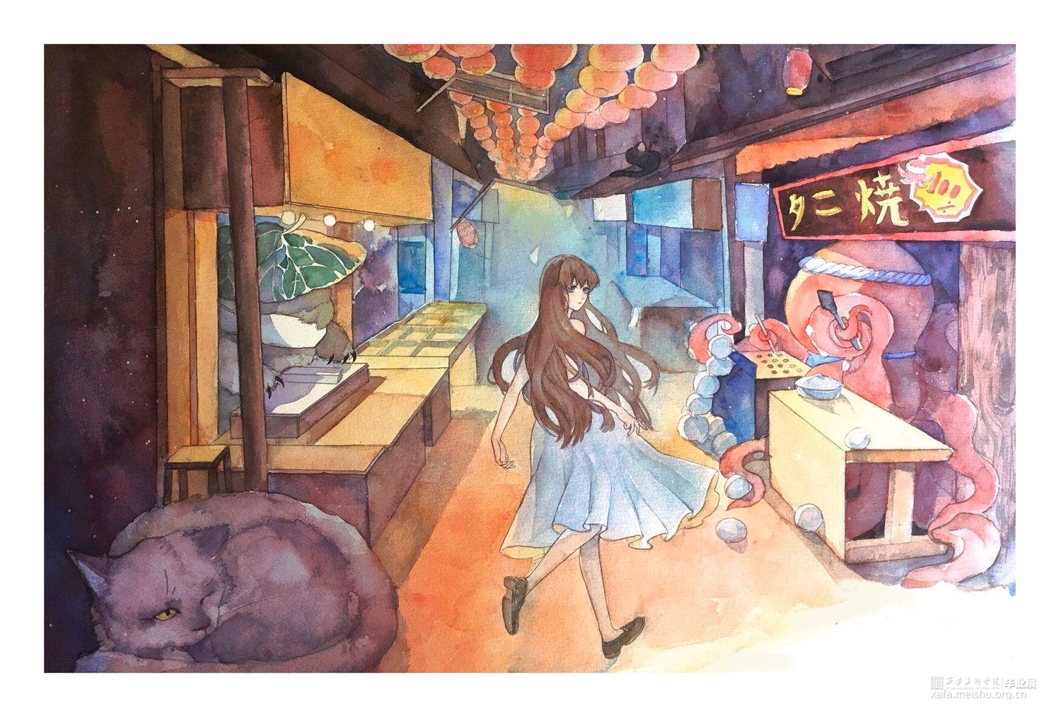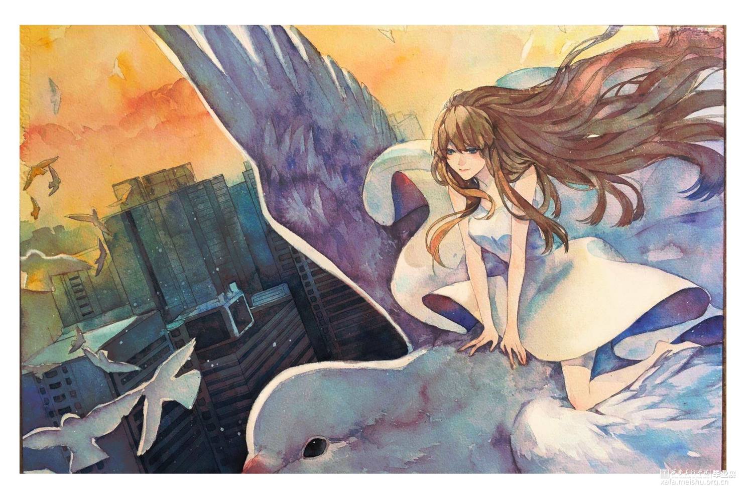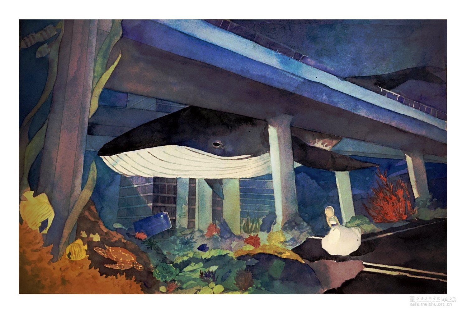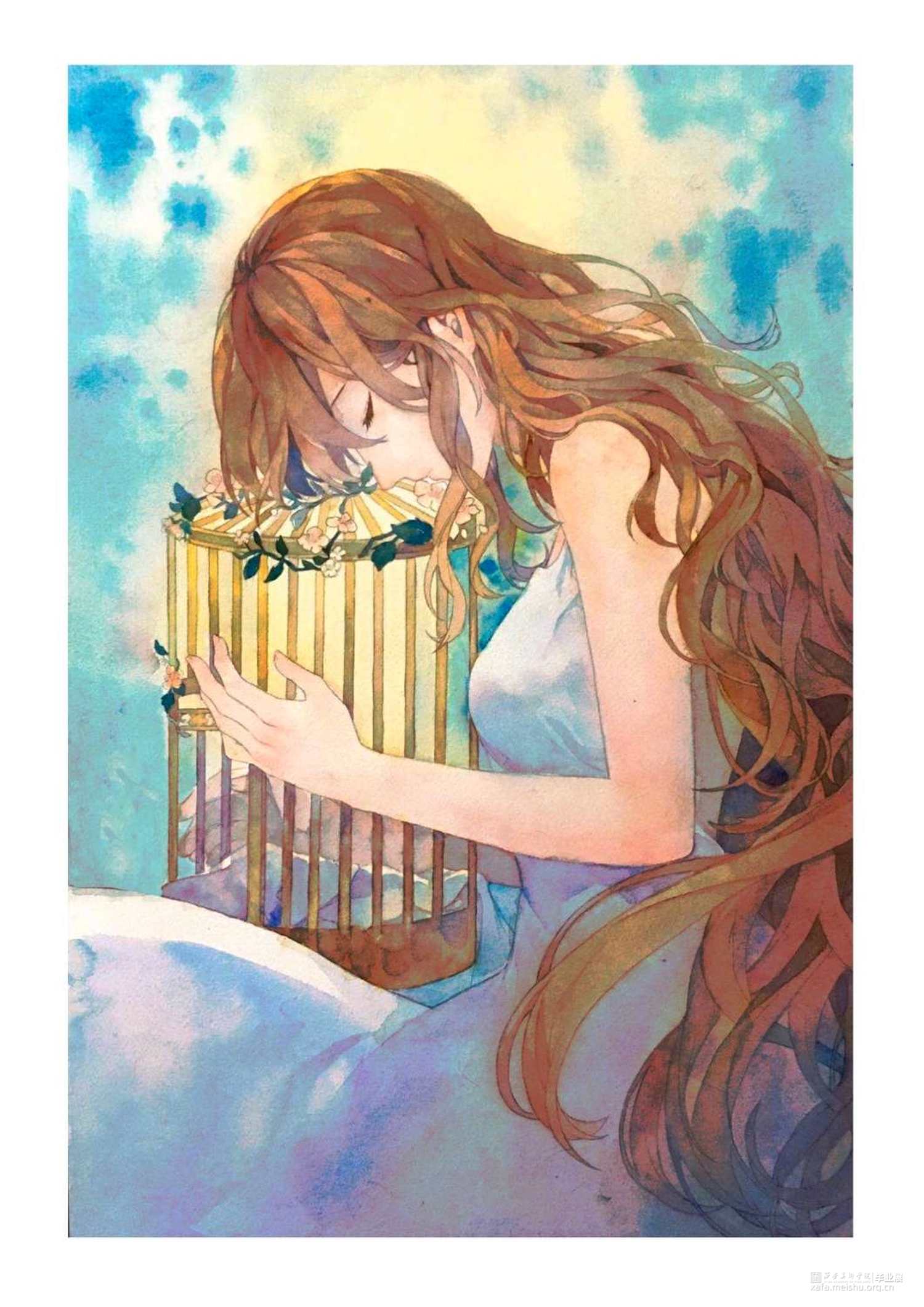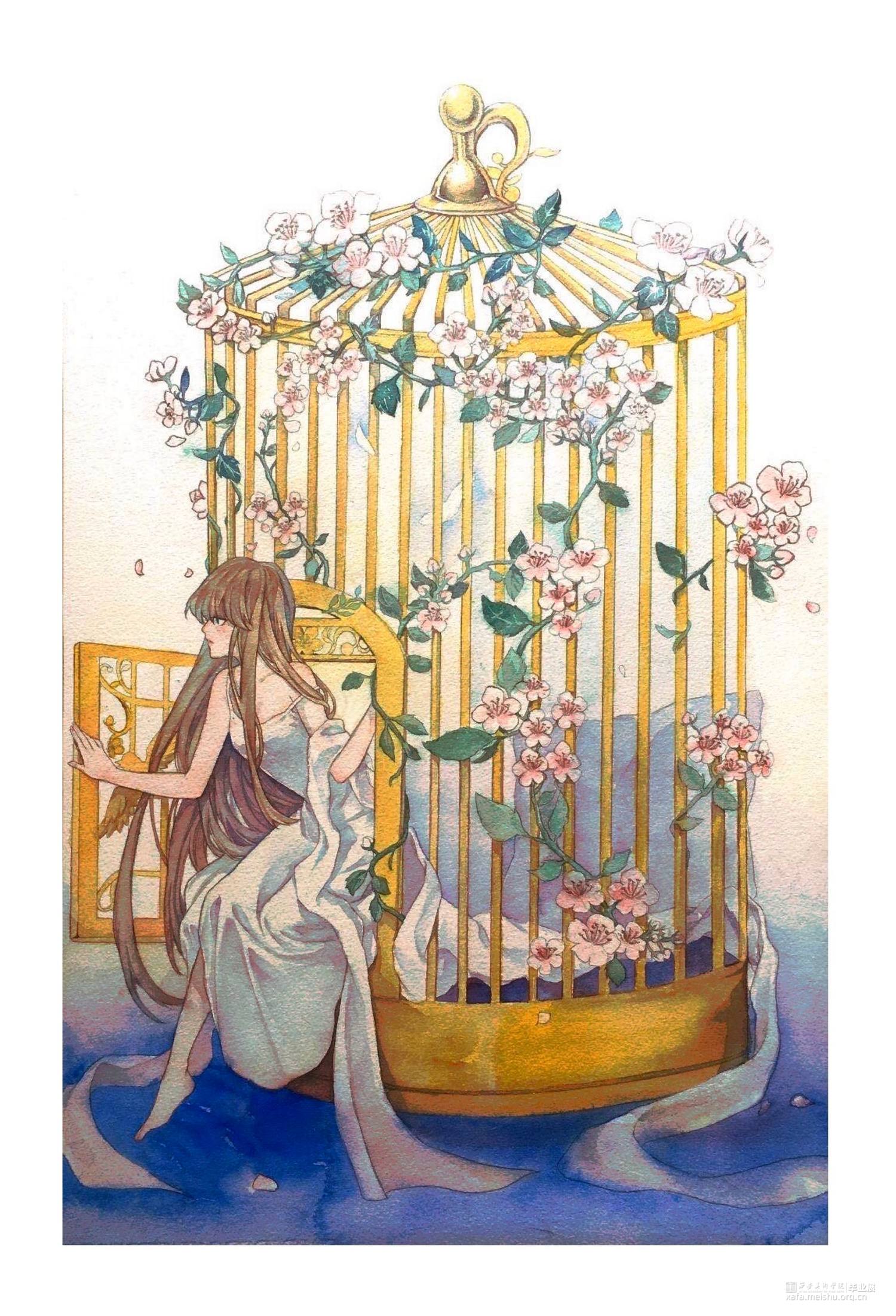 这一组水彩风插画,描述的是一个女孩在笼中推开门扉,探出身子向外胆怯却又止不住期待地张望,走出,亲身经历也目睹了笼外绚丽斑斓大千世界:凌晨破晓时在空中乘着鸟群翱翔;海底被自然占领的人类文明;夜晚灯火阑珊热闹非凡。而当女孩想要回到安定温暖的笼中时,却发现自己已经长大到无法再进入笼内。