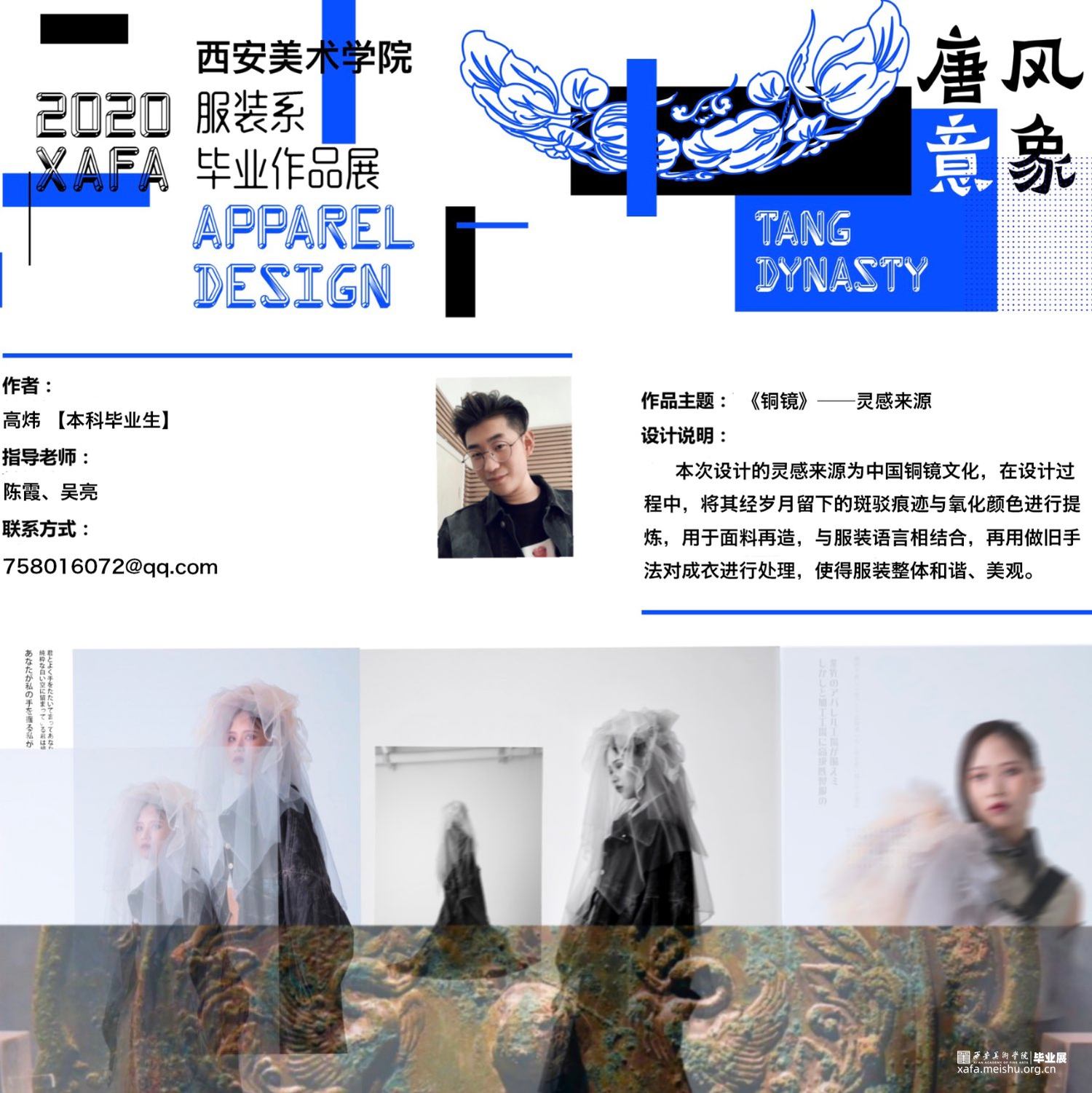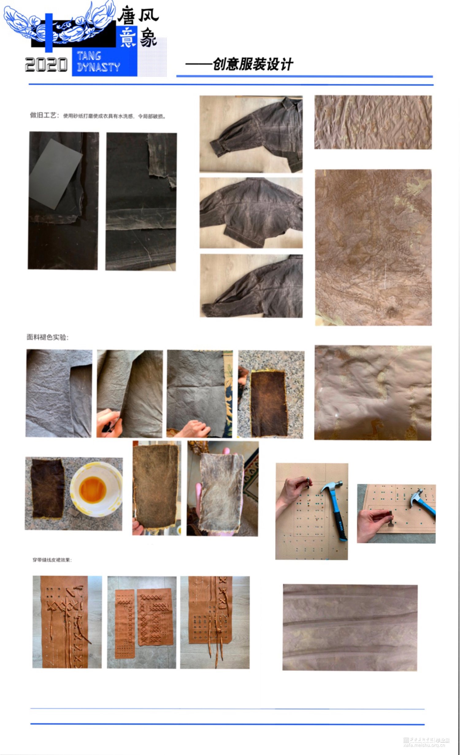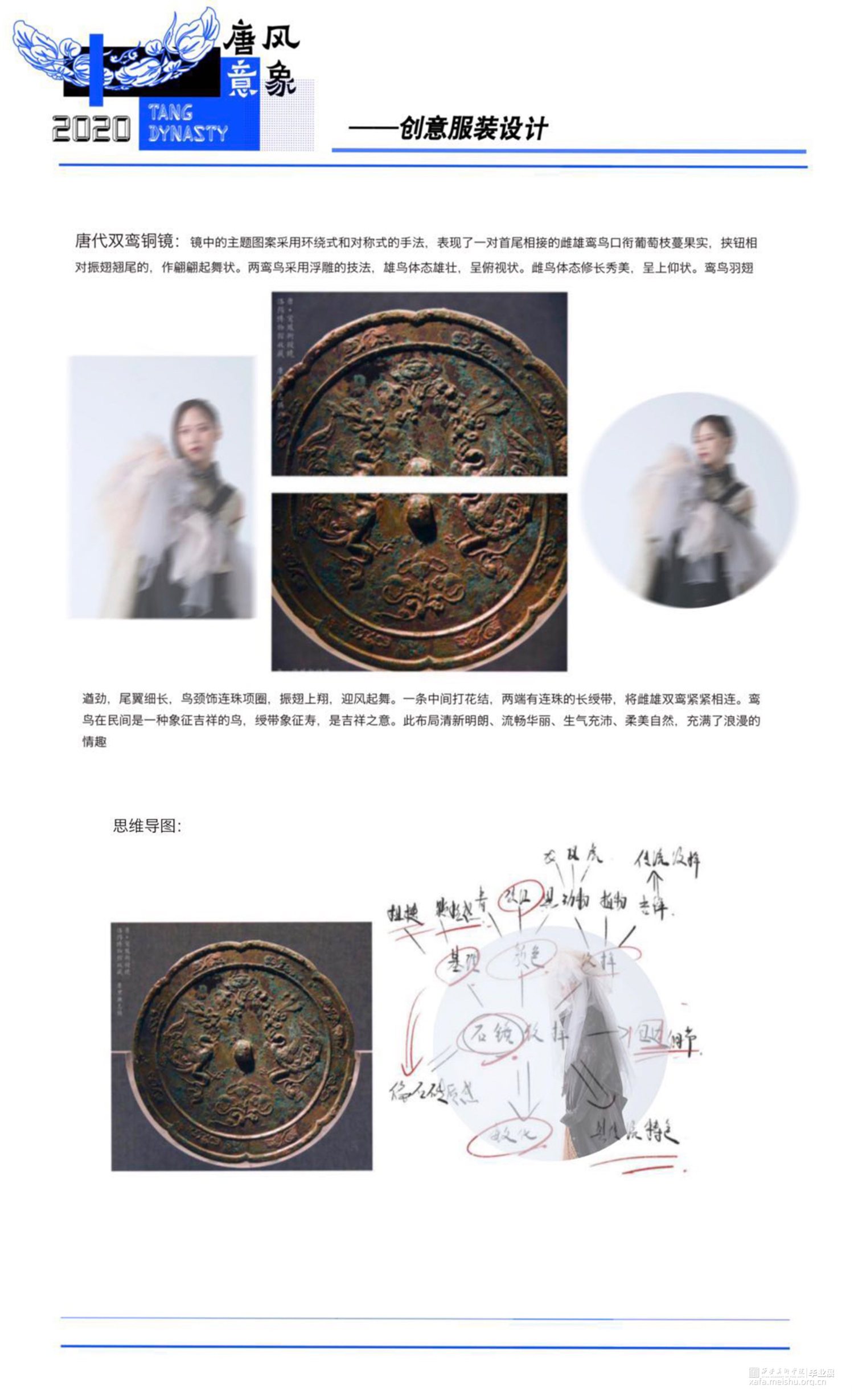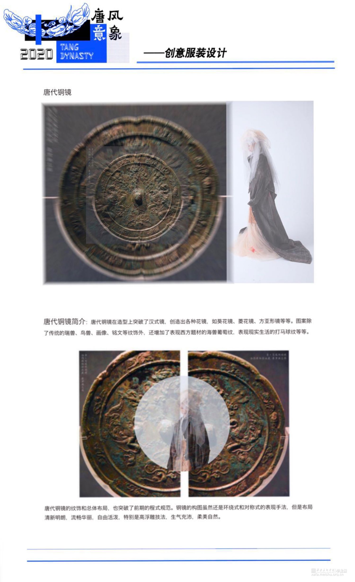 本次设计的灵感来源于中国铜镜文化,在设计过程中,将其经过岁月留下的斑驳痕迹与氧化后颜色进行提炼,用于服装面料再造,将其与服装语言相结合,再用做旧手法对服装整体进行处理,使得整体和谐、美观。