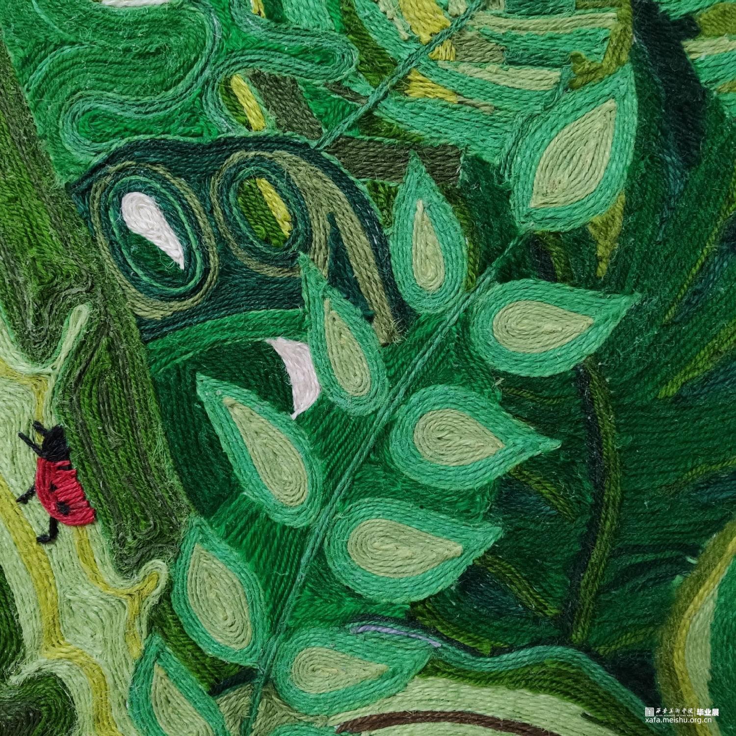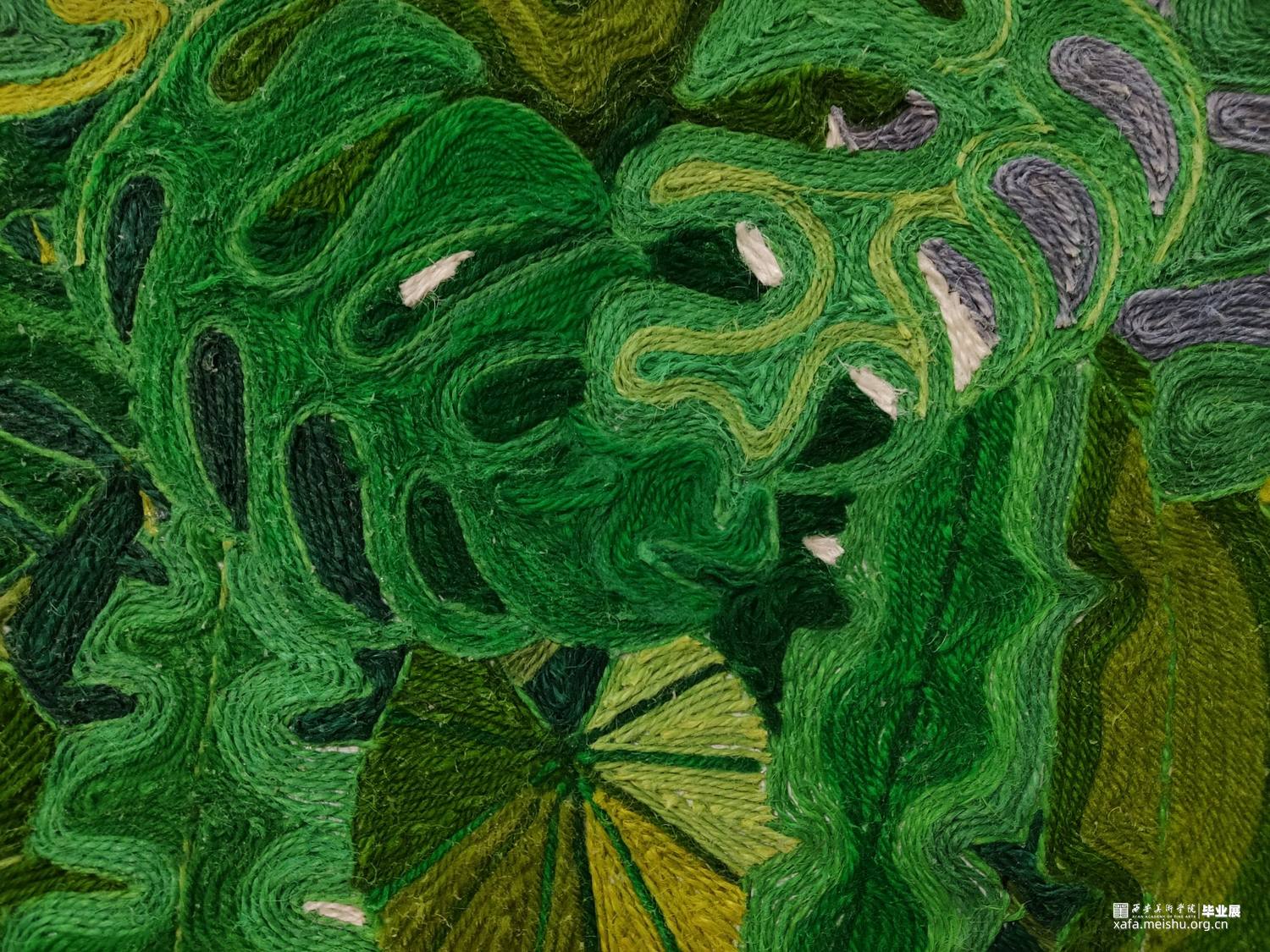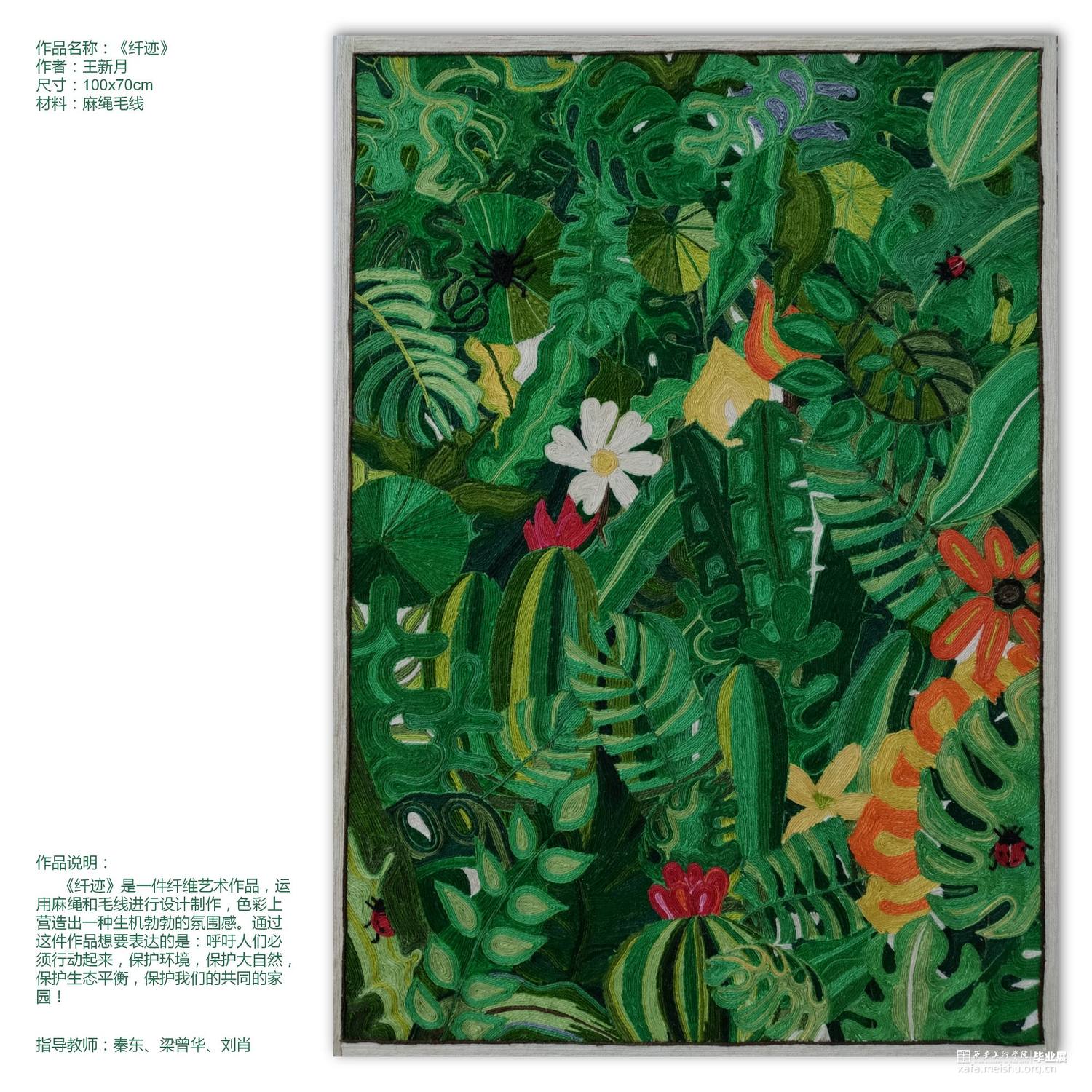 《纤迹》是一件纤维艺术作品,运用麻绳和毛线进行设计制作,色彩上营造出一种生机勃勃的氛围感。通过这件作品想要表达的是:呼吁人们必须行动起来,保护环境,保护大自然,保护生态平衡,保护我们的共同的家园!