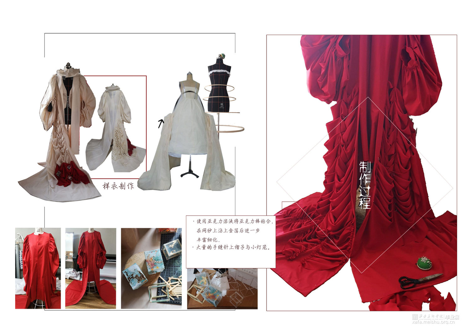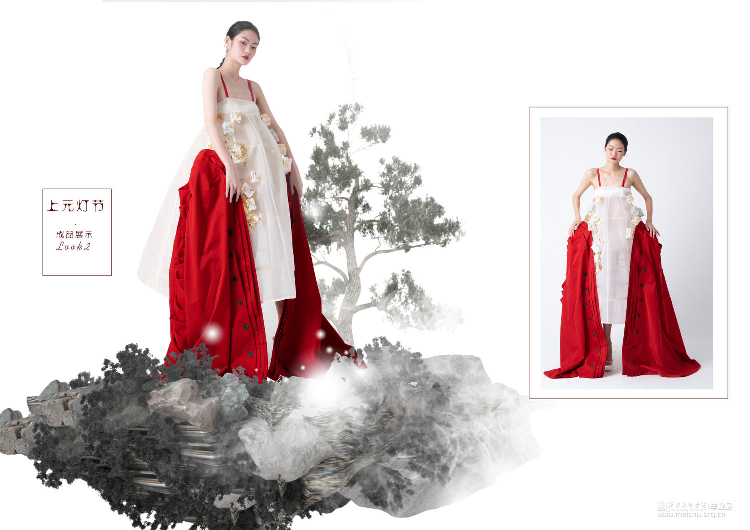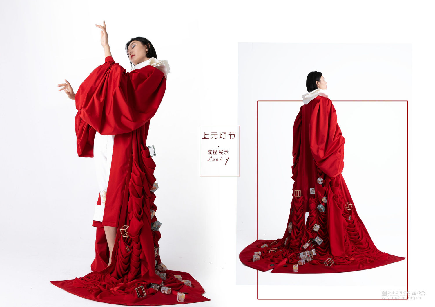 本次毕设作品通过场景联想的思路,将“上元灯节”的场景元素逐步精确,提取出层层叠叠的花灯元素。在本人的毕业设计中,面料再造部分以亚克力方棒和竹条做成方块支架,成为简化后的花灯雏形,使用大量金箔粘贴在方块支架和躯体的纱制面料上,象征连绵的灯光。侧摆使用哑光的红色面料做出大量的垂荡与缩褶,不同的捏褶方式可使服装更有层次感和运动感,褶子的堆积表现了长安灯会盈千累万的灯架。两侧裙摆的两排纽扣与斜插袋使从历史场景中提取元素的服装增添熟悉的现代气息。