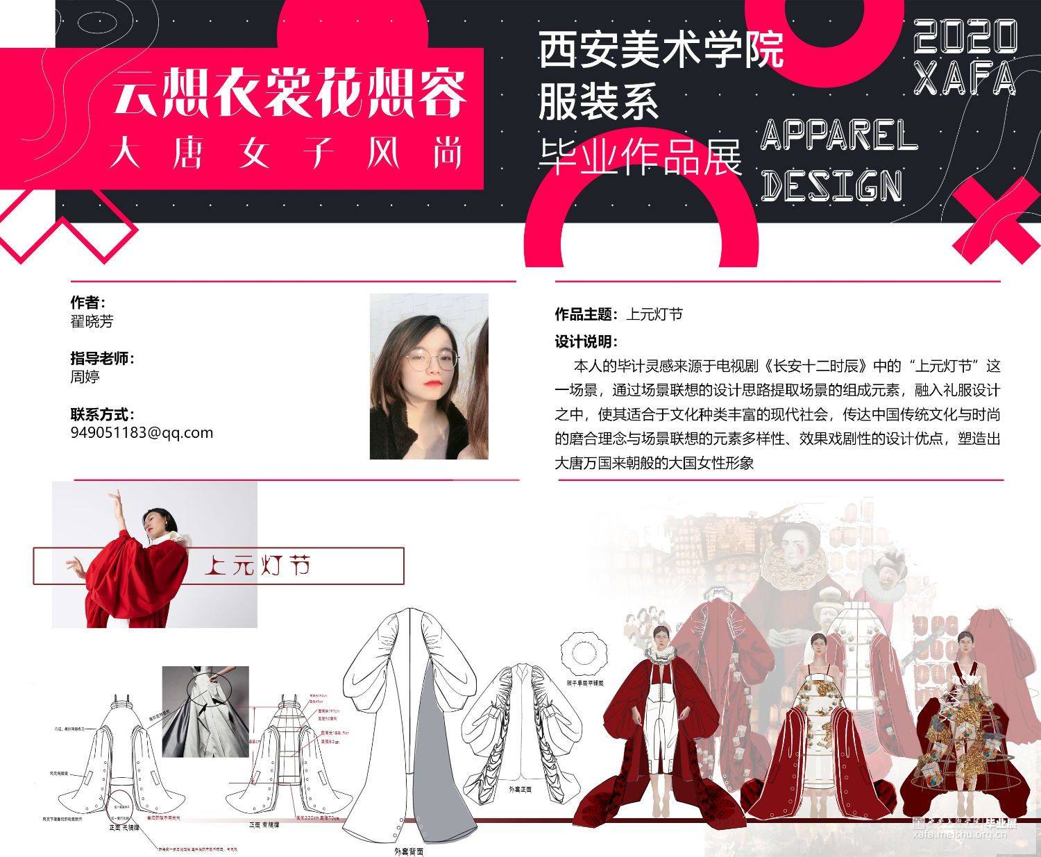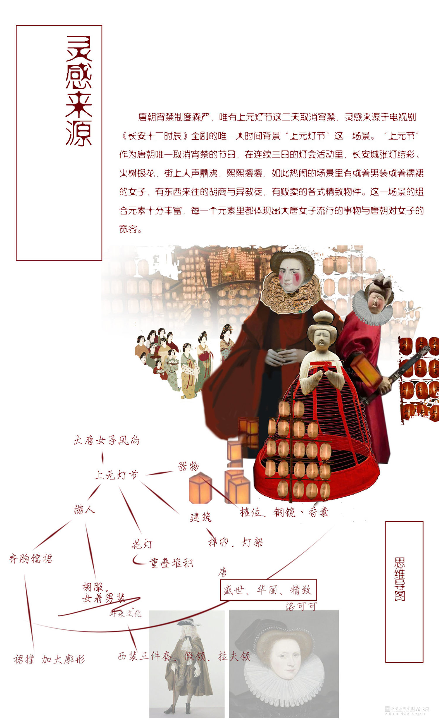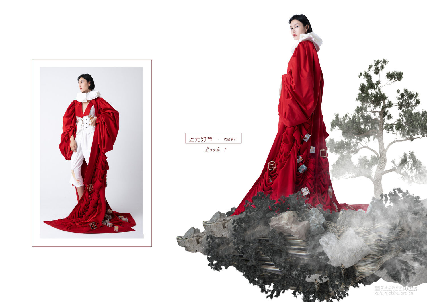 本次毕设作品通过场景联想的思路,将“上元灯节”的场景元素逐步精确,提取出层层叠叠的花灯元素。在本人的毕业设计中,面料再造部分以亚克力方棒和竹条做成方块支架,成为简化后的花灯雏形,使用大量金箔粘贴在方块支架和躯体的纱制面料上,象征连绵的灯光。侧摆使用哑光的红色面料做出大量的垂荡与缩褶,不同的捏褶方式可使服装更有层次感和运动感,褶子的堆积表现了长安灯会盈千累万的灯架。两侧裙摆的两排纽扣与斜插袋使从历史场景中提取元素的服装增添熟悉的现代气息。