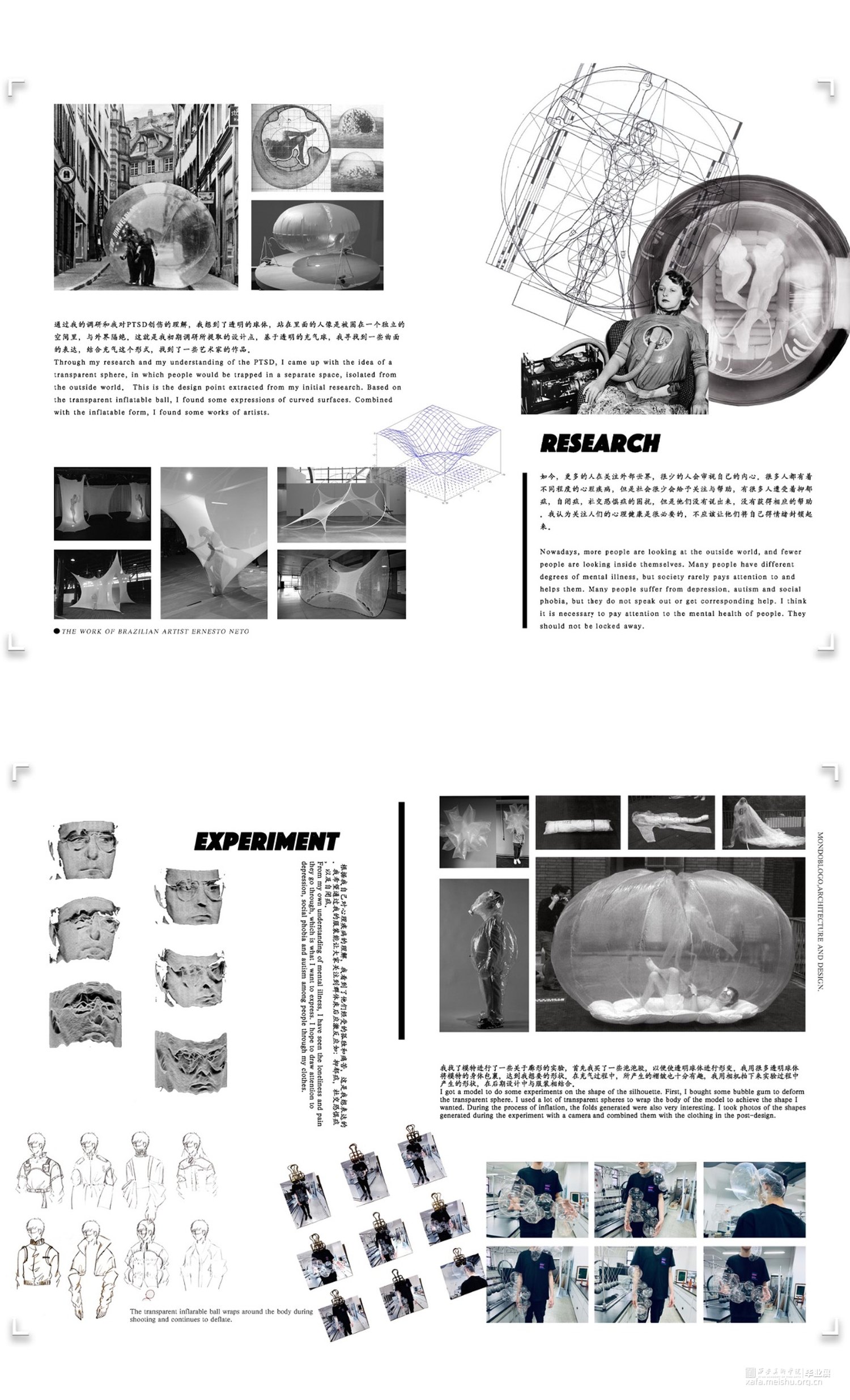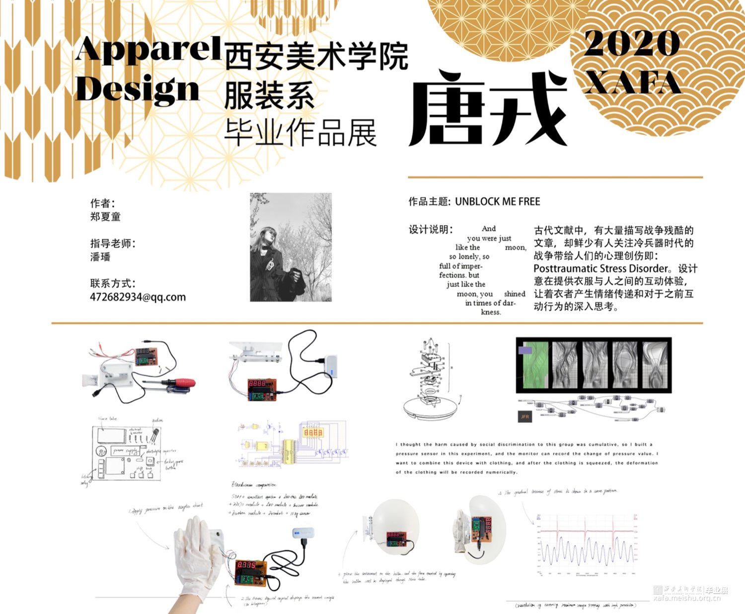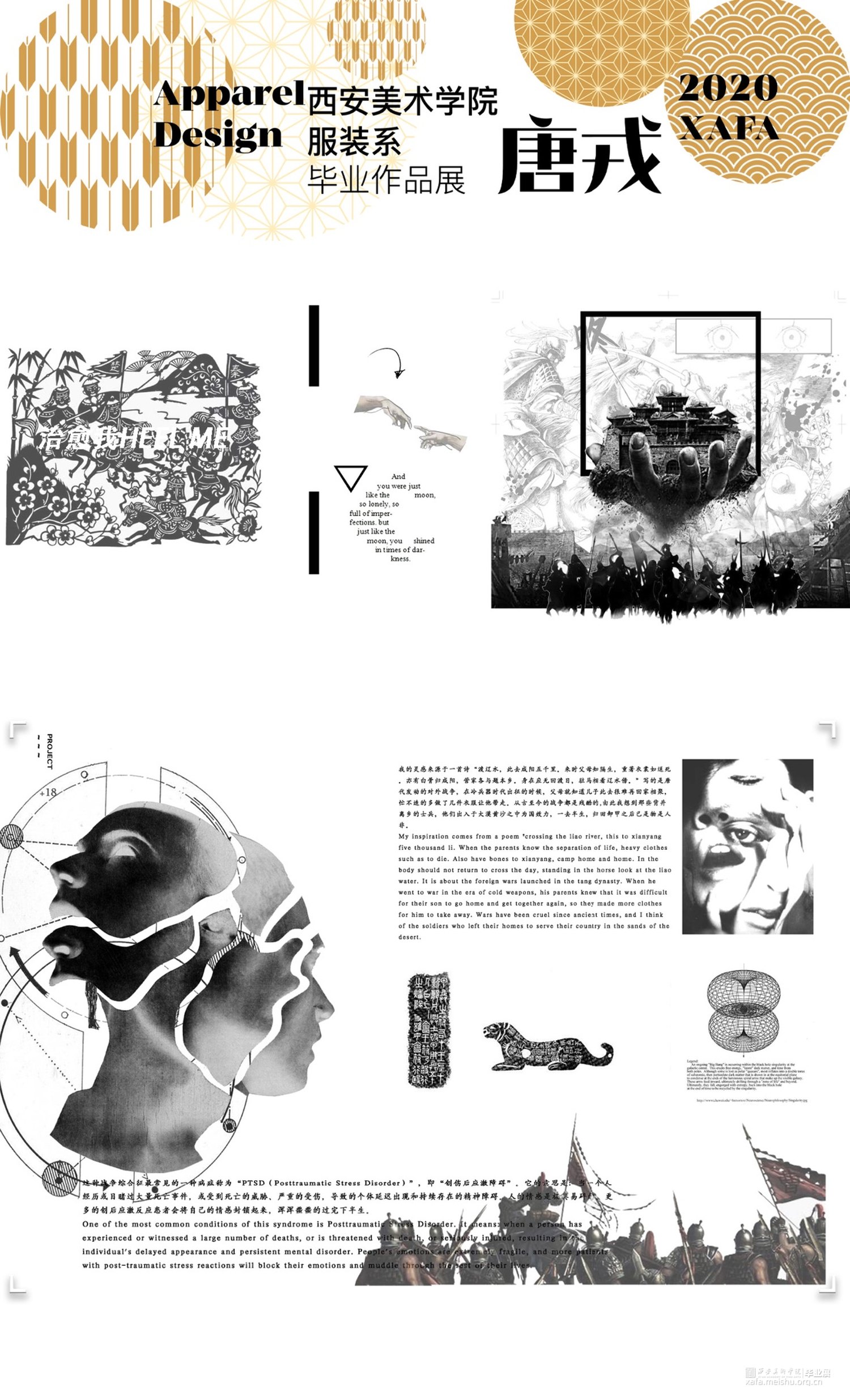 古代文献中,有大量描写战争残酷的文章,却鲜少有人关注冷兵器时代的战争带给人们的心理创伤即:Posttraumatic Stress Disorder。本设计意在提供衣服与人之间的互动体验,让着衣者产生情绪传递和对于之前互动行为的深入思考。