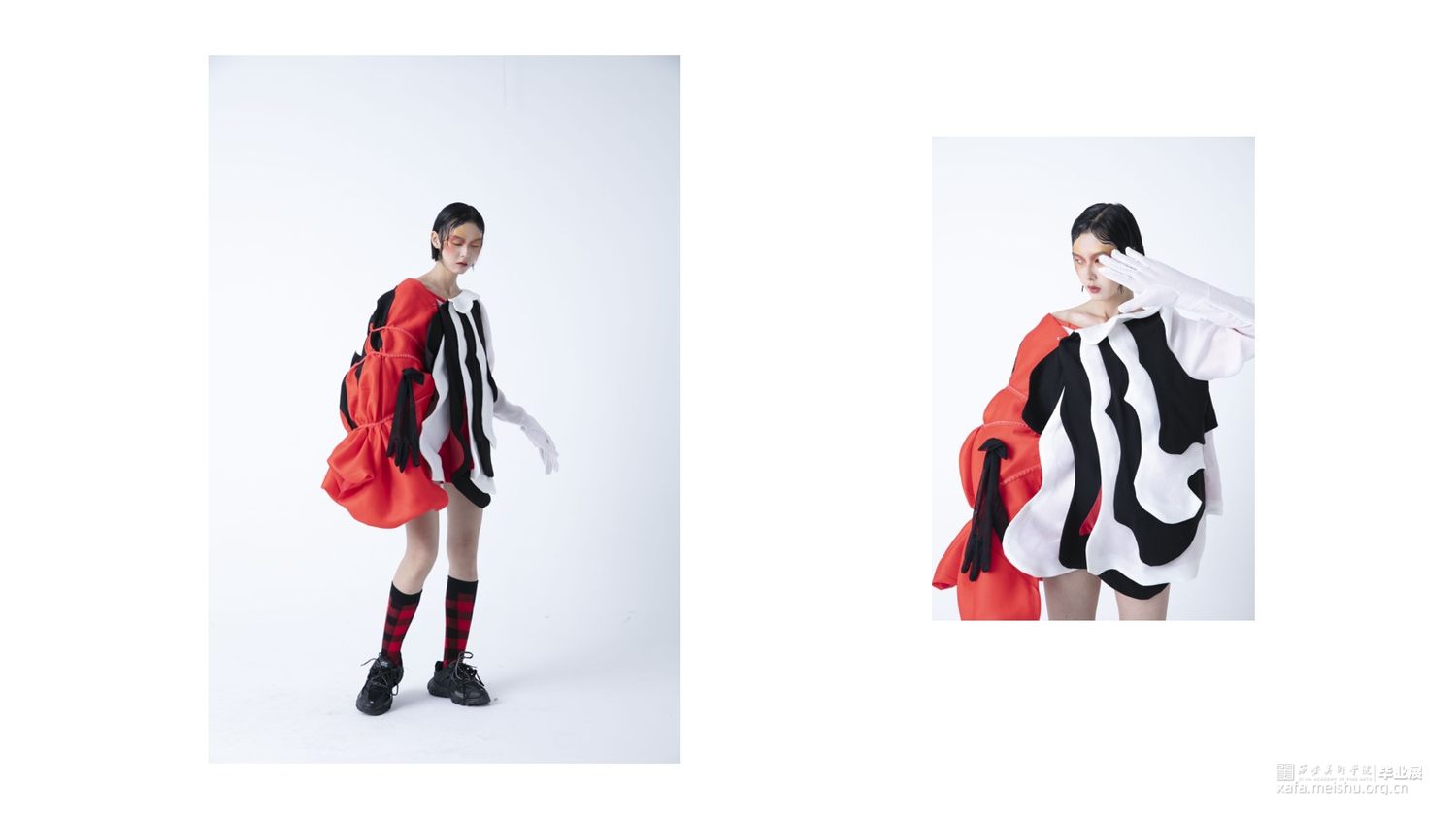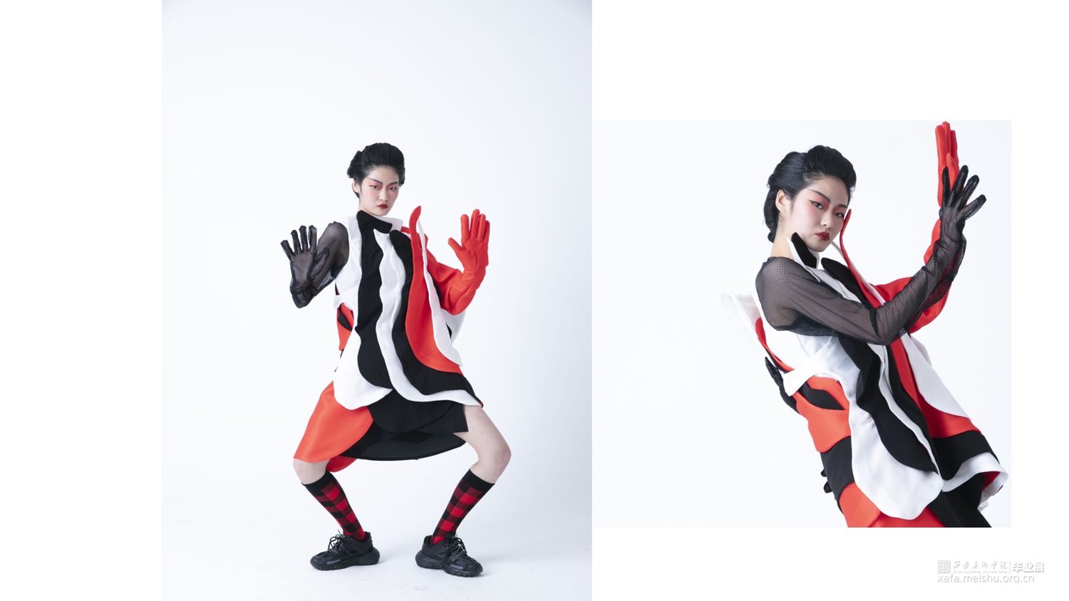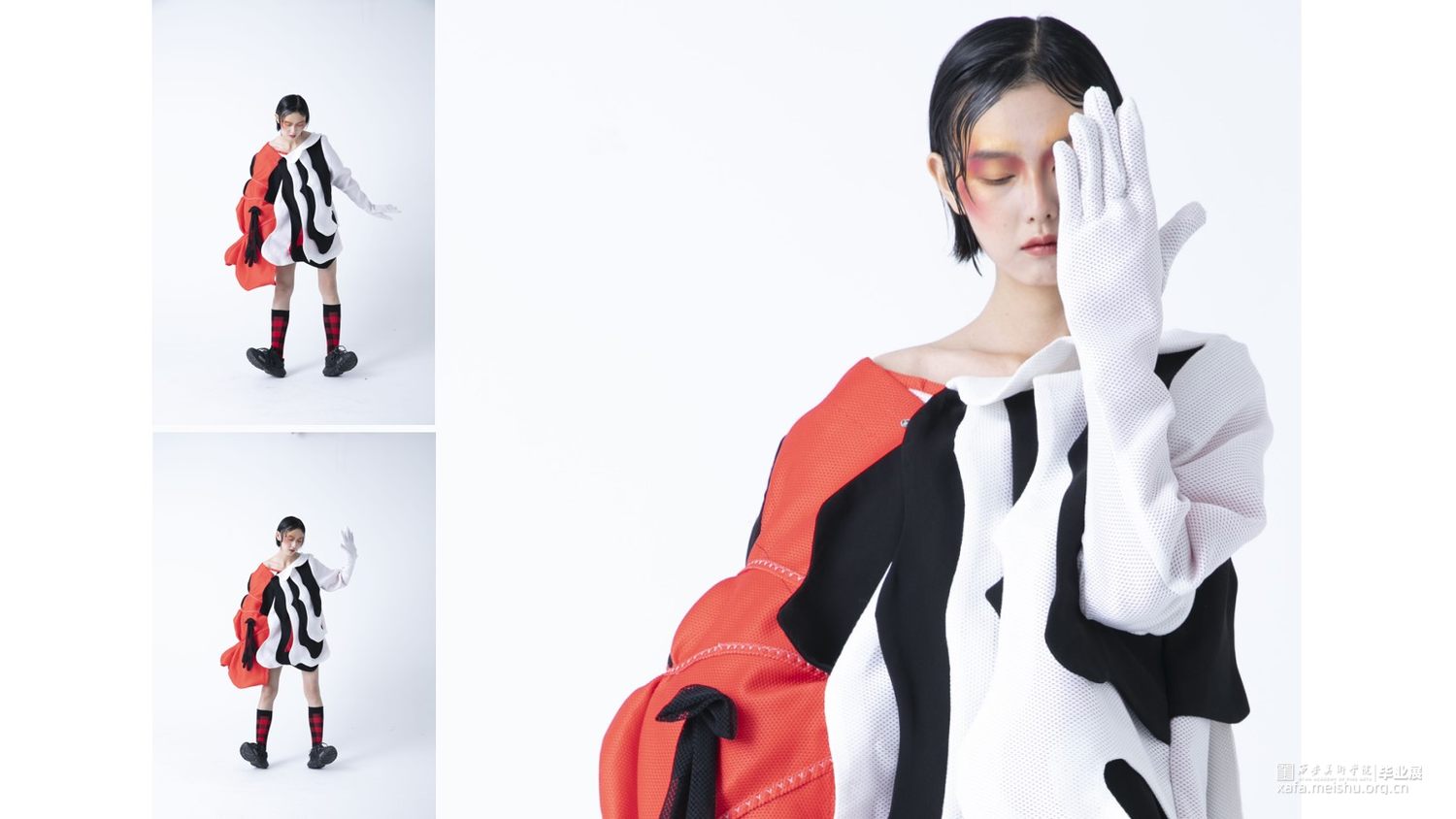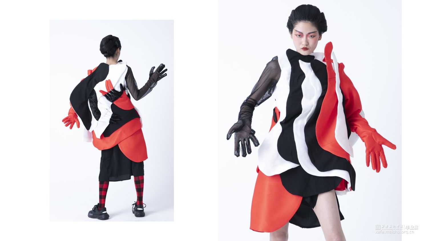 通过对唐代铜镜的纹样、分类、装饰手法等方面的探究,提取铜镜的艺术特点,捕捉女子手拿铜镜的优美姿态,获取设计思路。 作品以女子手拿铜镜的姿态为设计元素, 改变传统的穿着方式,忽略衣领,从手着装。在作品设计中采用不对称的表现形式,正背面都可互换穿戴。将唐代铜镜中女子手拿铜镜的姿态与现代手套转化后在现代服装设计中得到新的展示。
