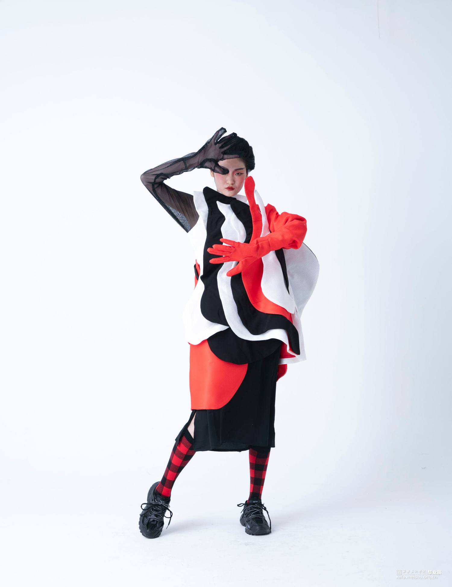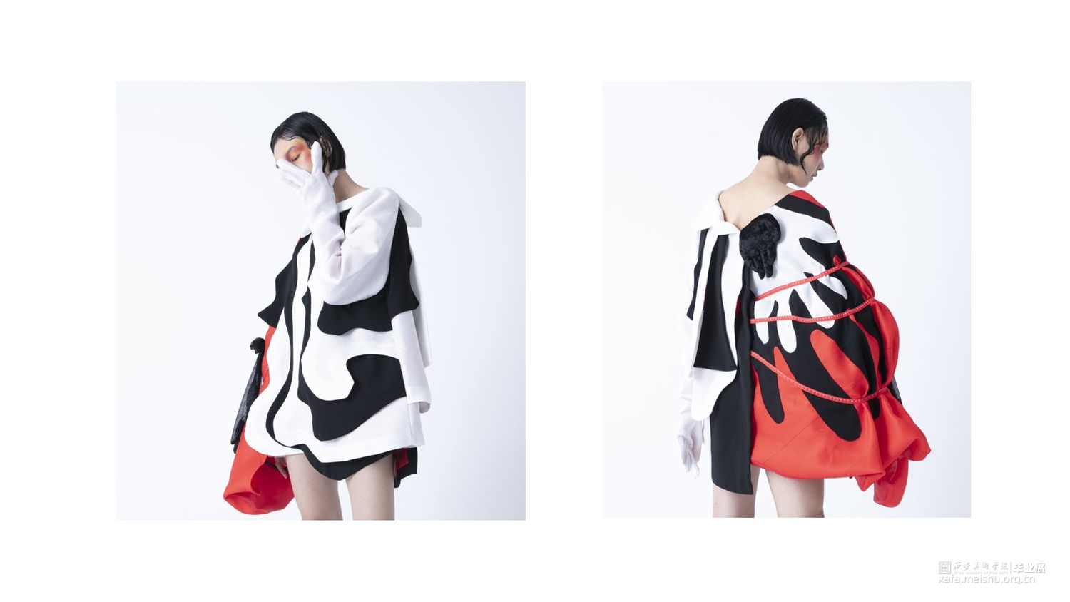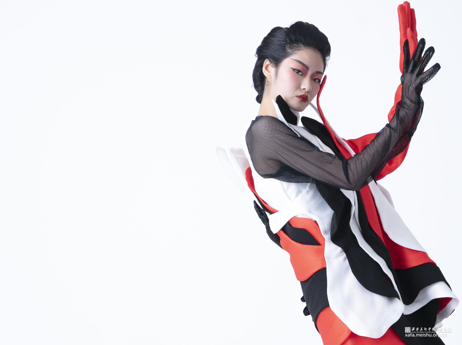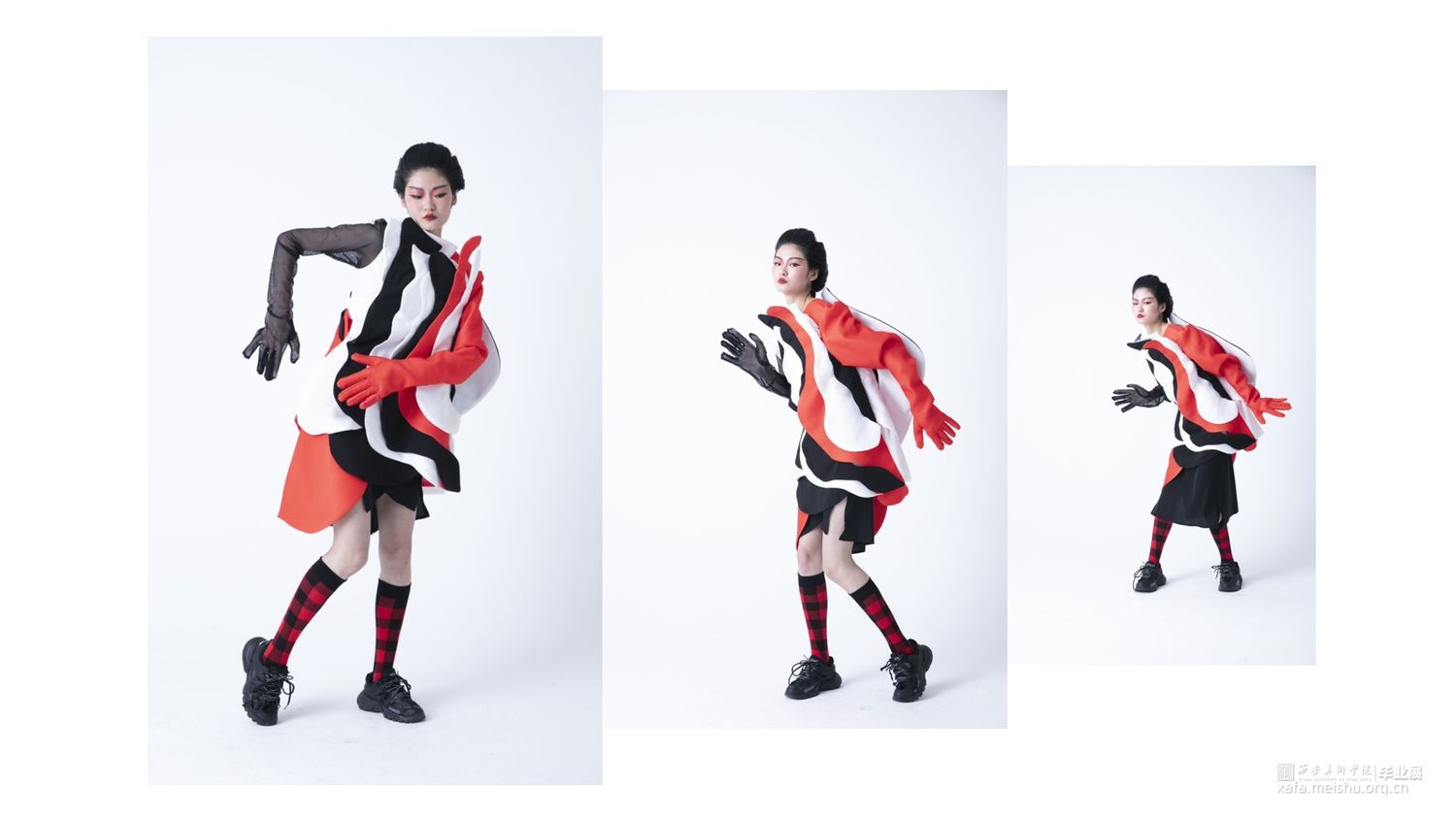 通过对唐代铜镜的纹样、分类、装饰手法等方面的探究,提取铜镜的艺术特点,捕捉女子手拿铜镜的优美姿态,获取设计思路。 作品以女子手拿铜镜的姿态为设计元素, 改变传统的穿着方式,忽略衣领,从手着装。在作品设计中采用不对称的表现形式,正背面都可互换穿戴。将唐代铜镜中女子手拿铜镜的姿态与现代手套转化后在现代服装设计中得到新的展示。