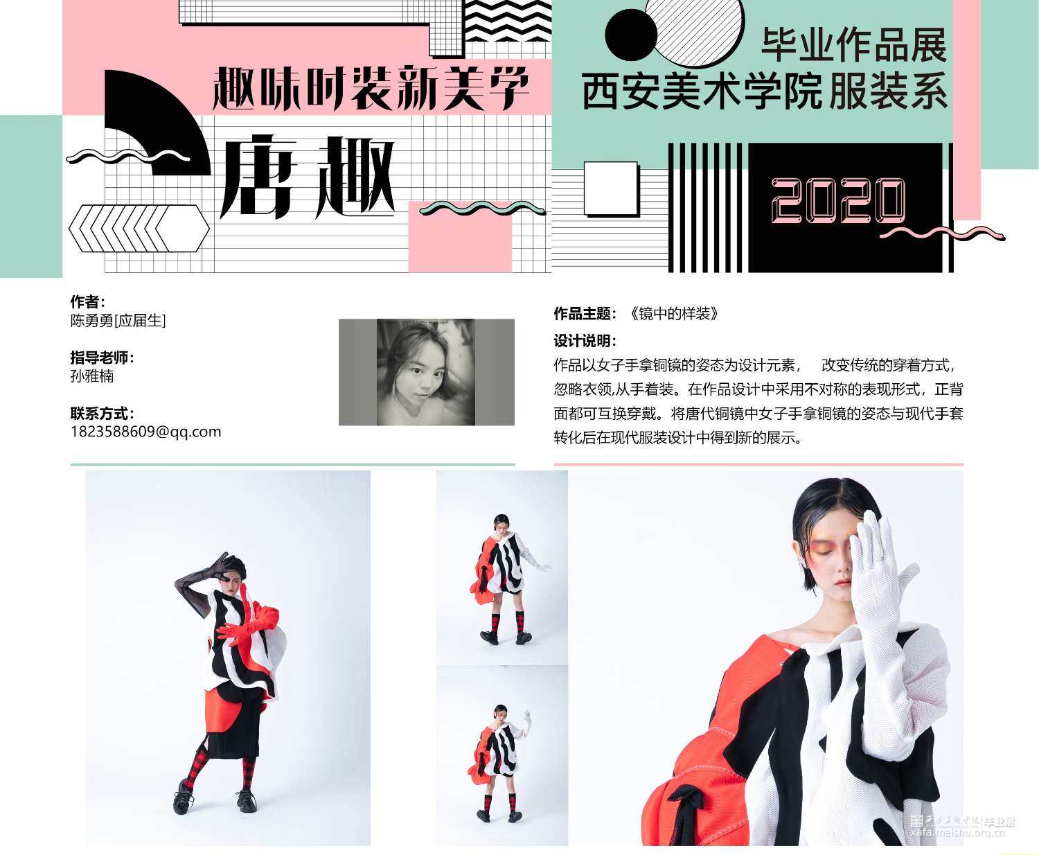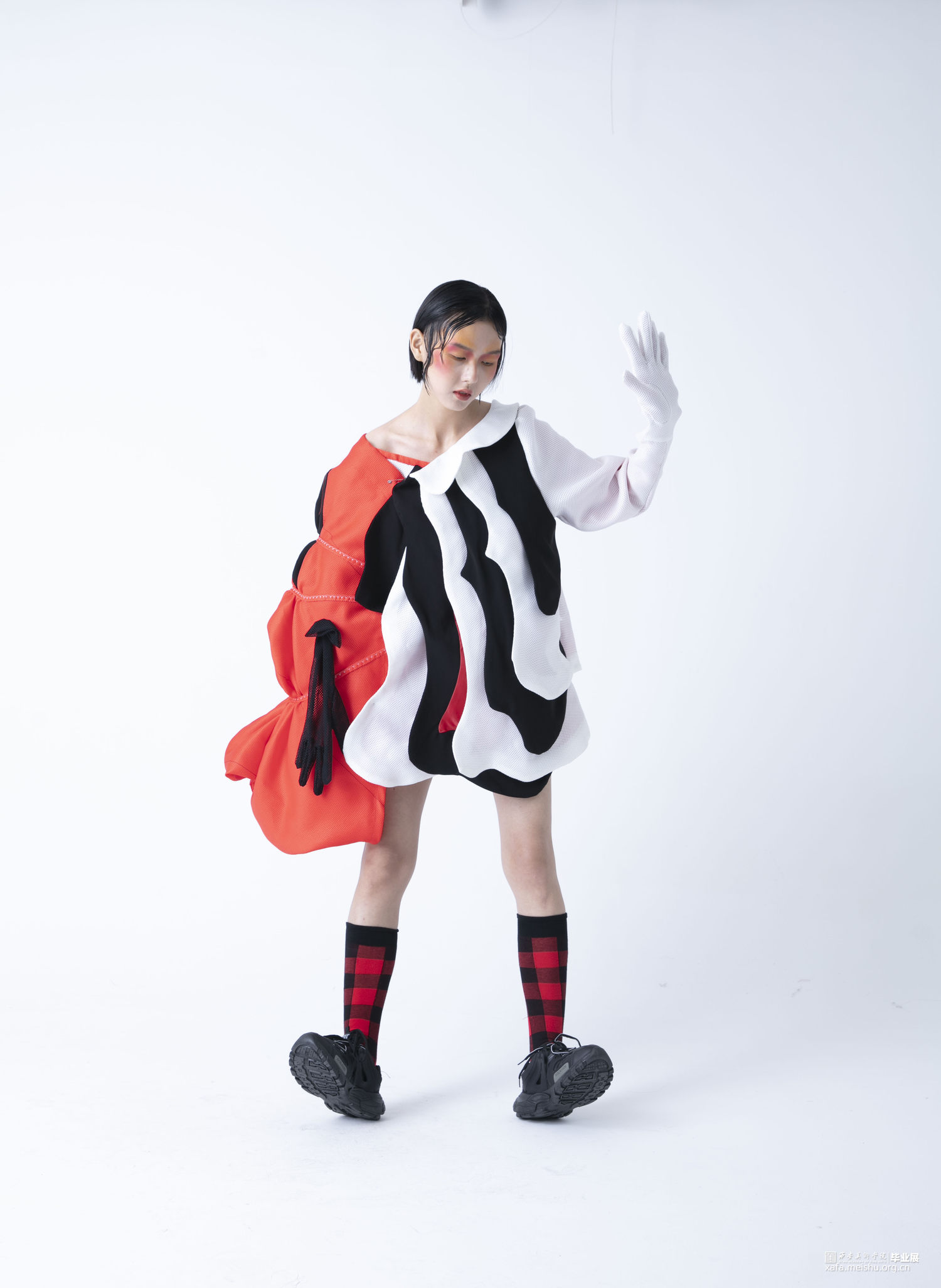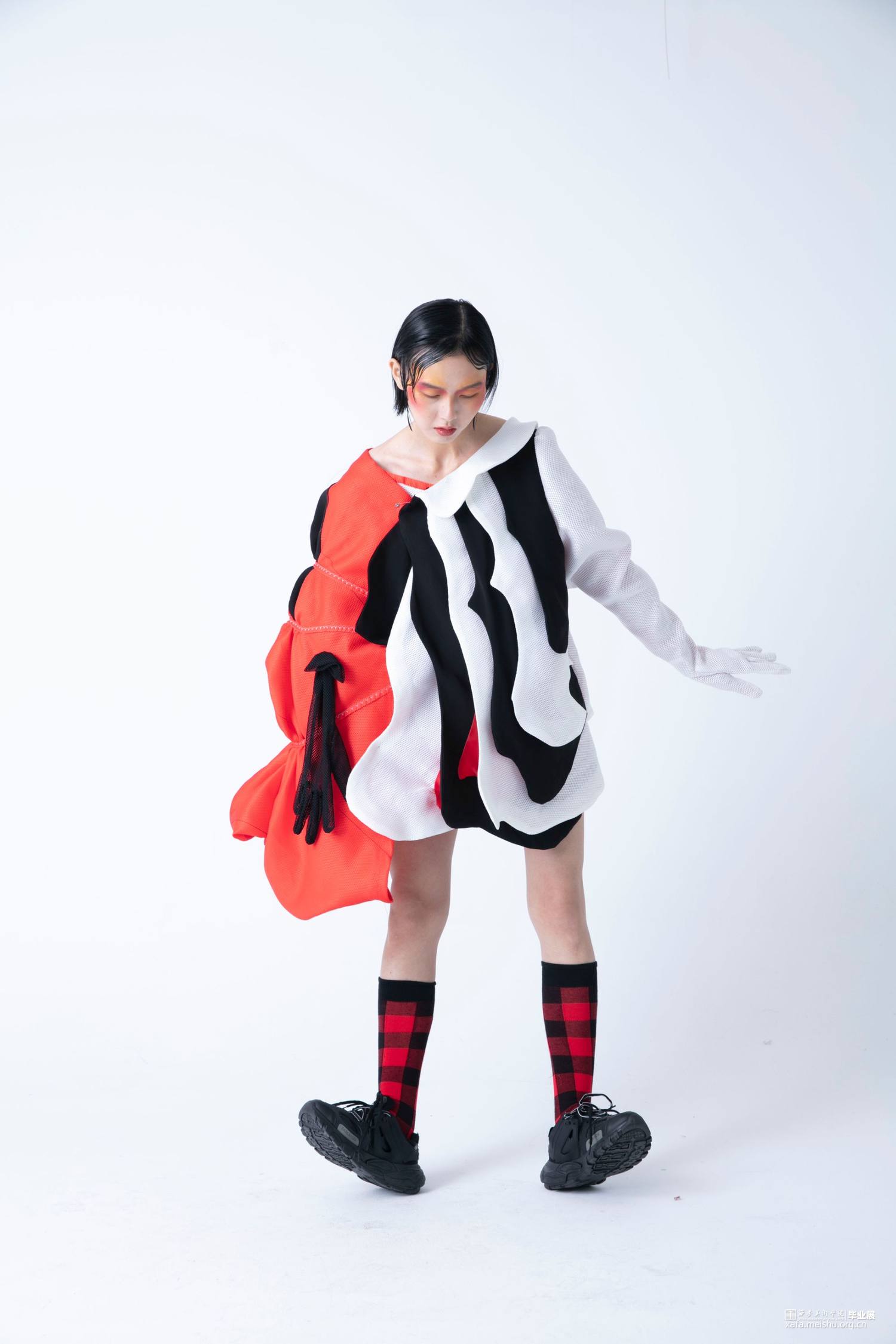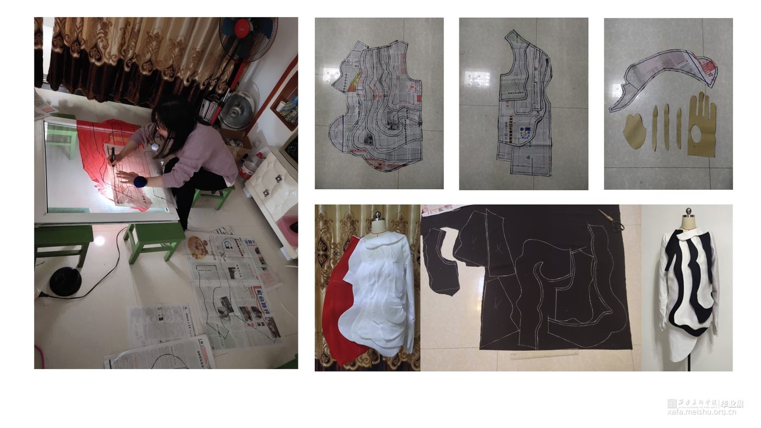通过对唐代铜镜的纹样、分类、装饰手法等方面的探究,提取铜镜的艺术特点,捕捉女子手拿铜镜的优美姿态,获取设计思路。 作品以女子手拿铜镜的姿态为设计元素, 改变传统的穿着方式,忽略衣领,从手着装。在作品设计中采用不对称的表现形式,正背面都可互换穿戴。将唐代铜镜中女子手拿铜镜的姿态与现代手套转化后在现代服装设计中得到新的展示。