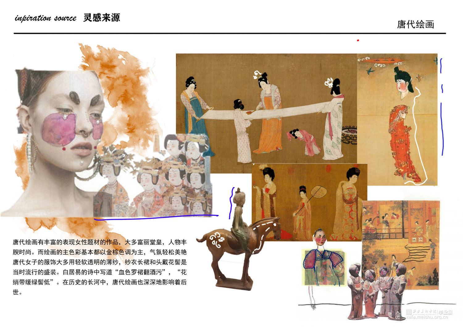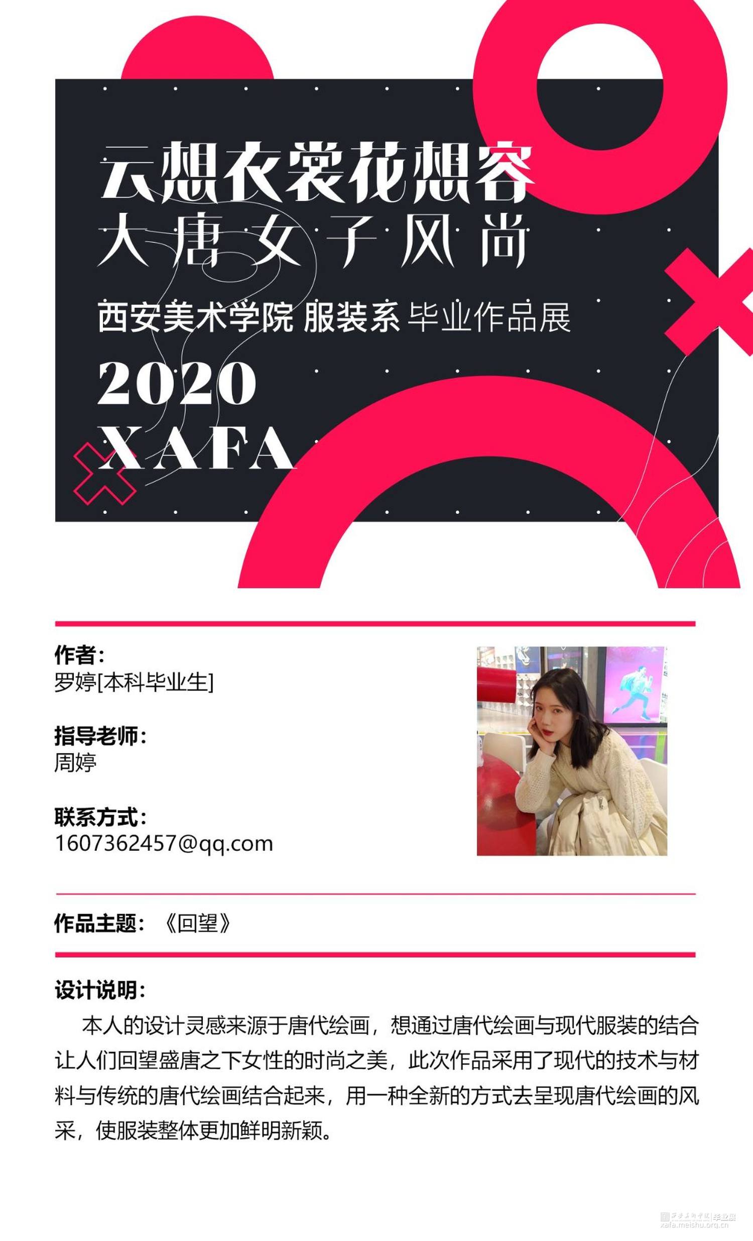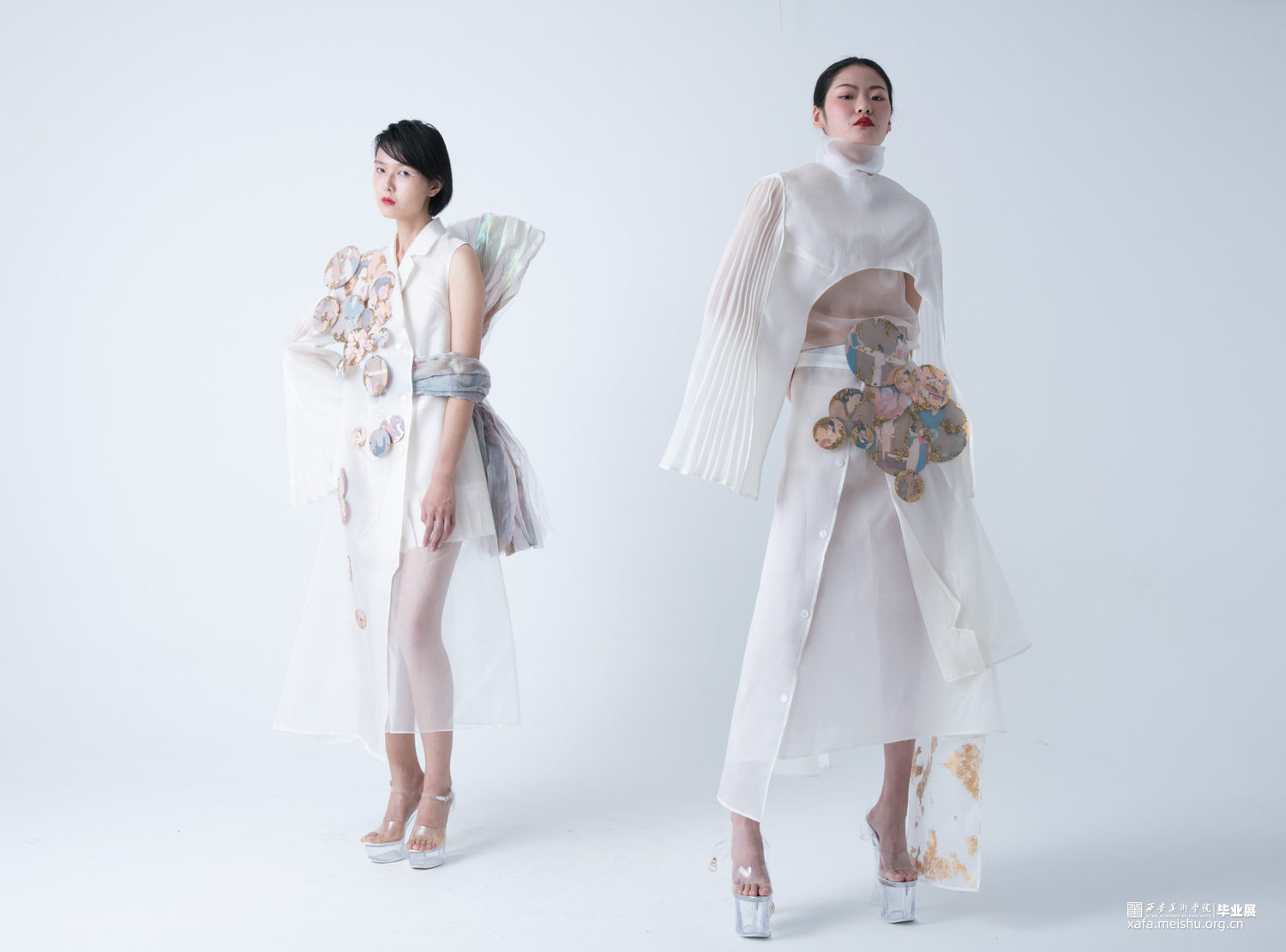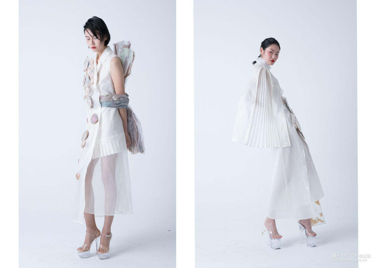 本作品灵感来源于唐代绘画,将唐代绘画与现代数码印花和PVC材料巧妙结合,想让人通过本作品回望唐代绘画的风采,展现唐代女性的时尚之美