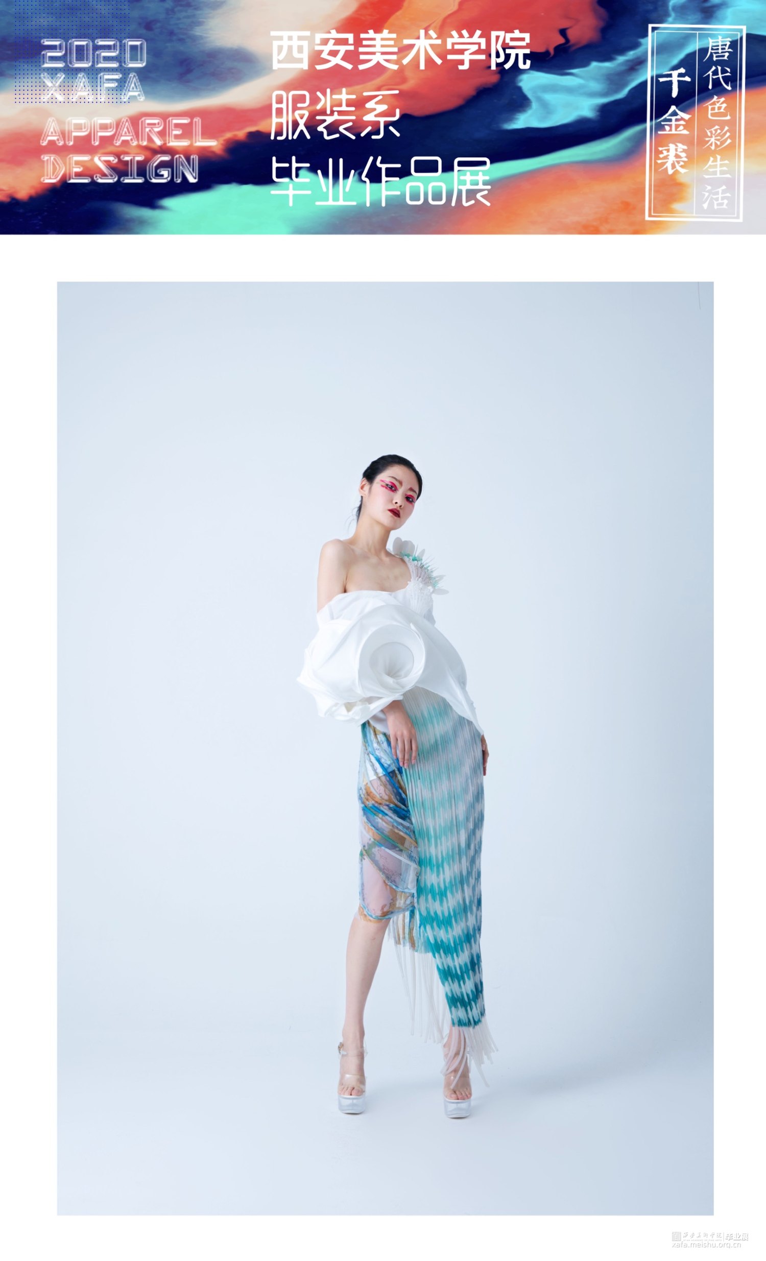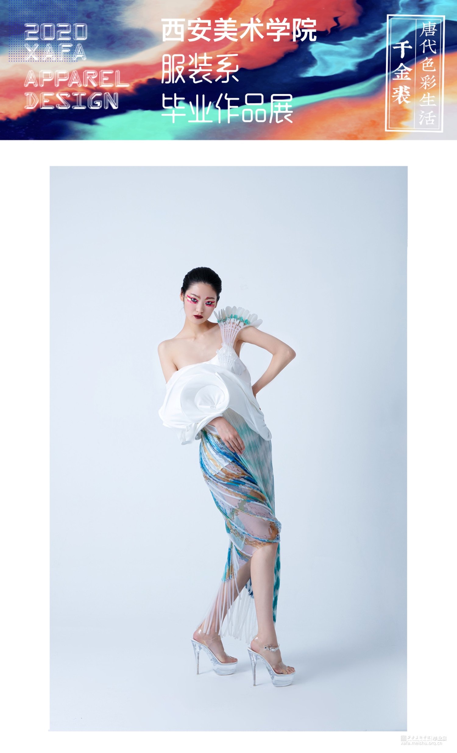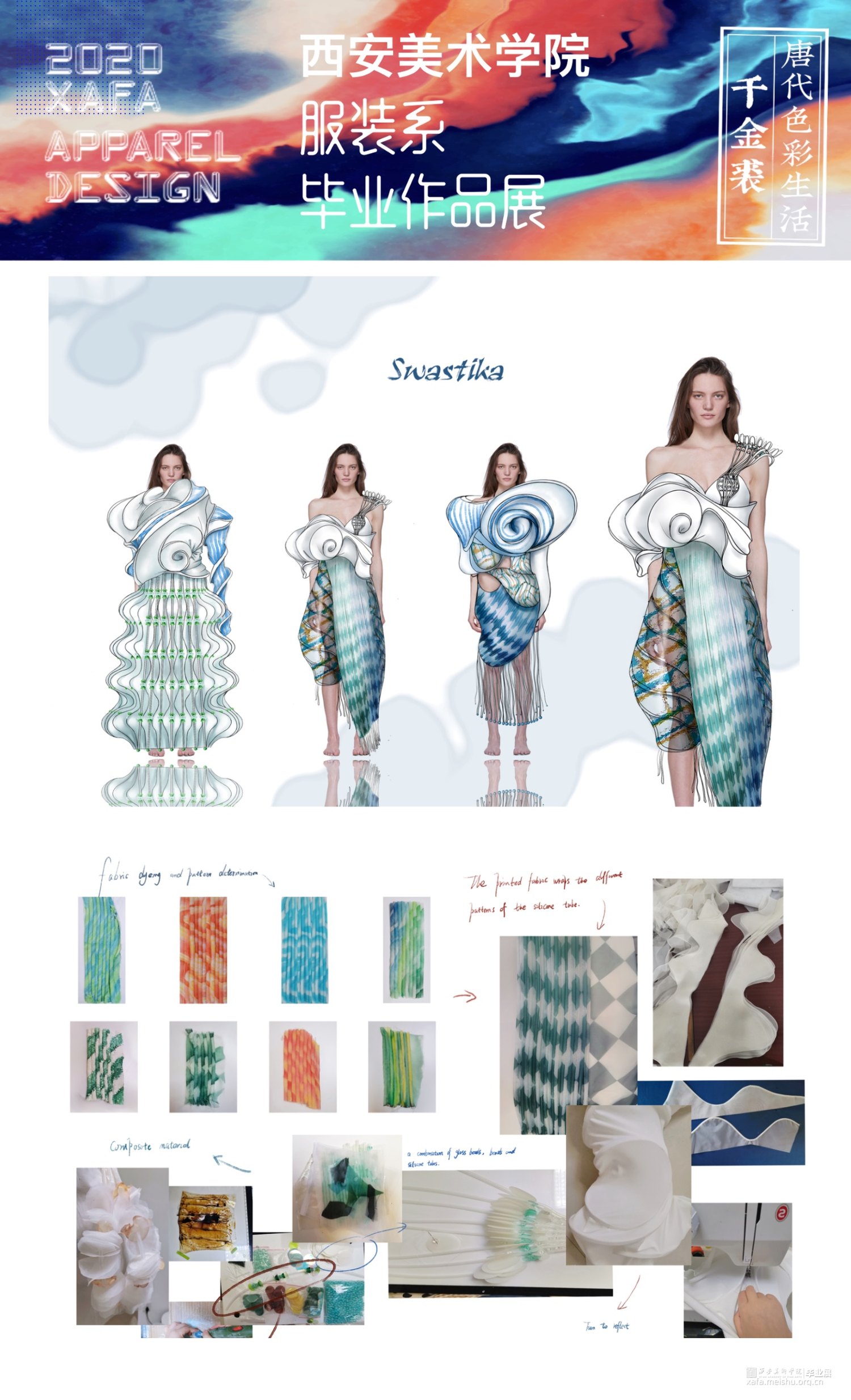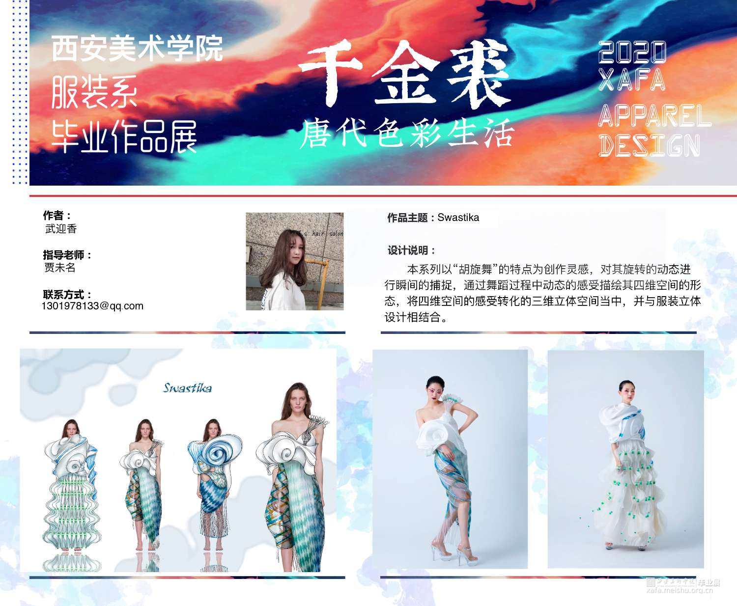 本次作品以唐代“胡旋舞”的特点作为创作灵感,对其旋转的动态进行瞬间的捕捉,通过舞蹈运动过程中动态的感受,描绘其四维空间的形态,将四维空间的感受转化到三维立体空间当中,并与服装立体设计相结合。
