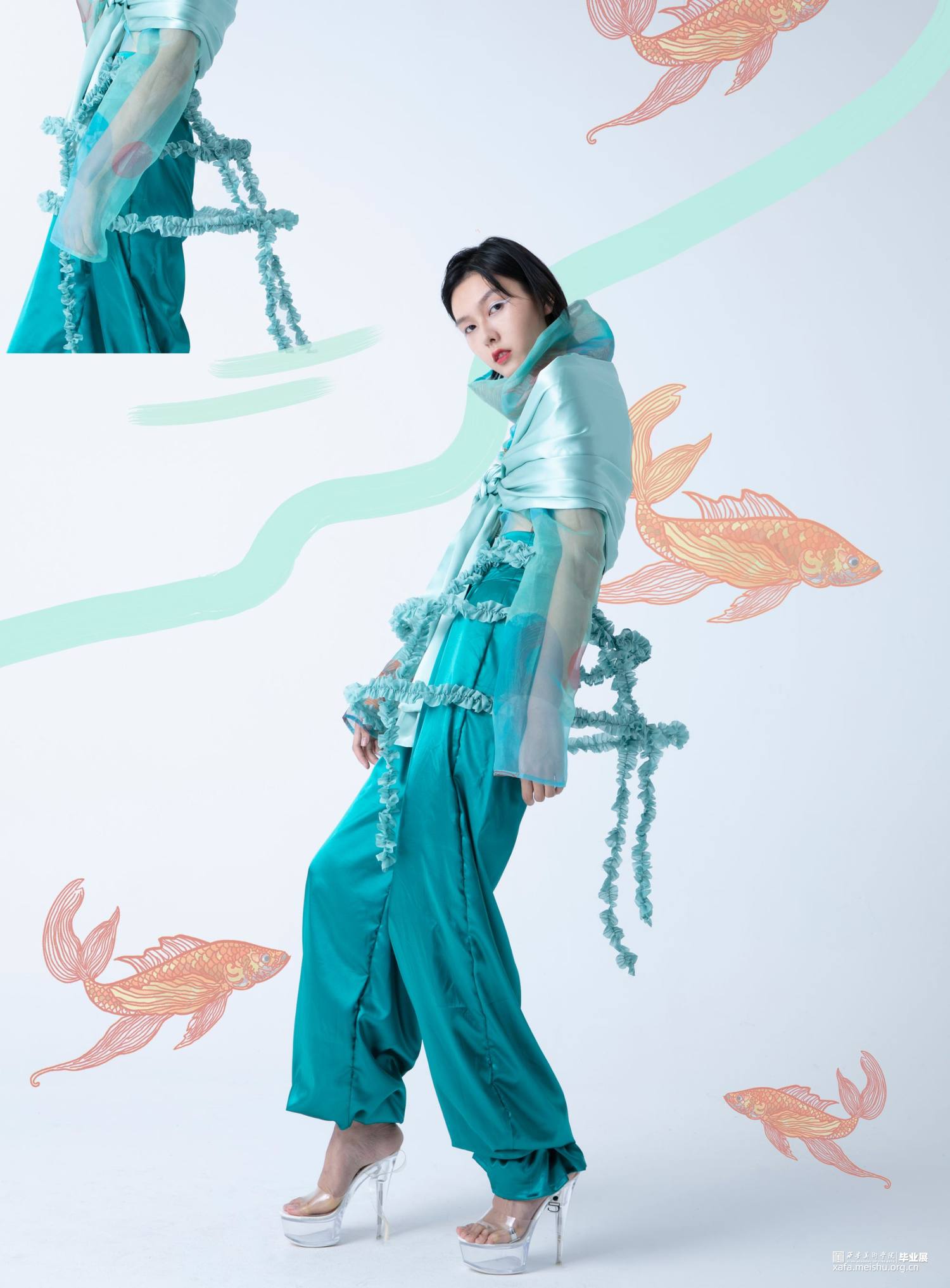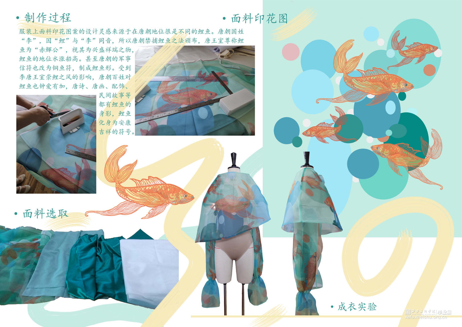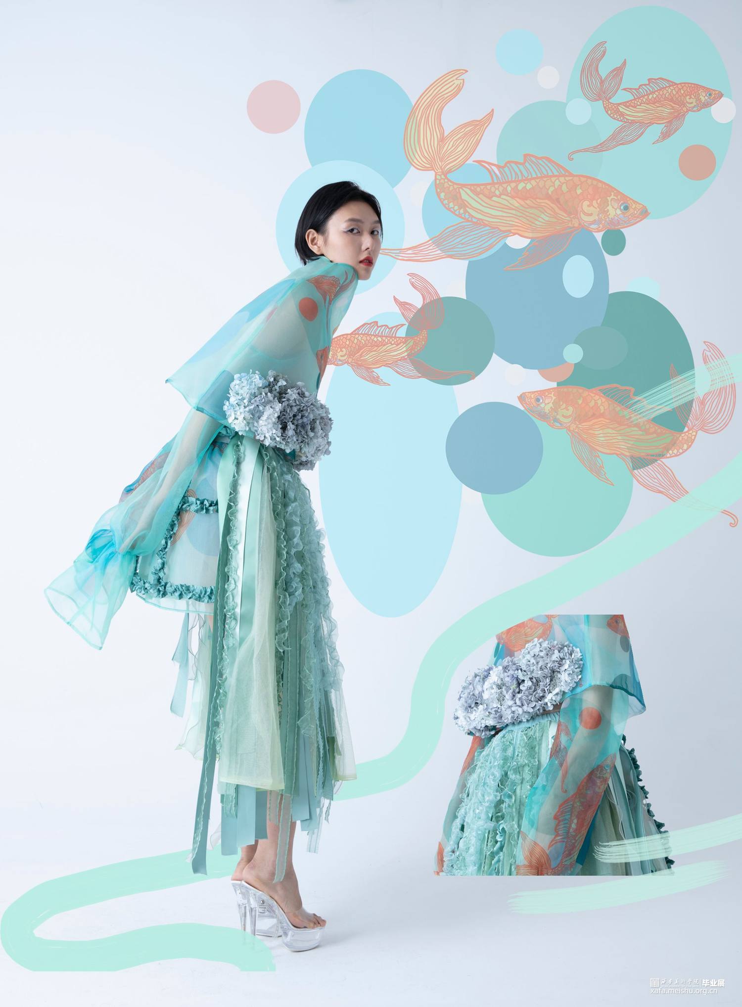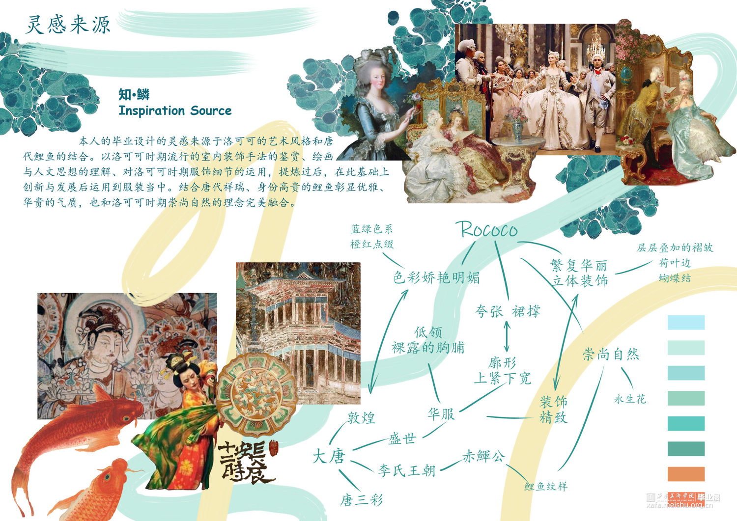以洛可可艺术和大唐盛世之间的异曲同工之处作为设计灵感来源。在不同层次的青色里揉进橙红充分的展现了大唐风采和洛可可时期人们崇尚自然的风格。作品做为时代的缩影,“赤鯶公”遨游其中,它身上的每一片鱼鳞都藏着一段历史。