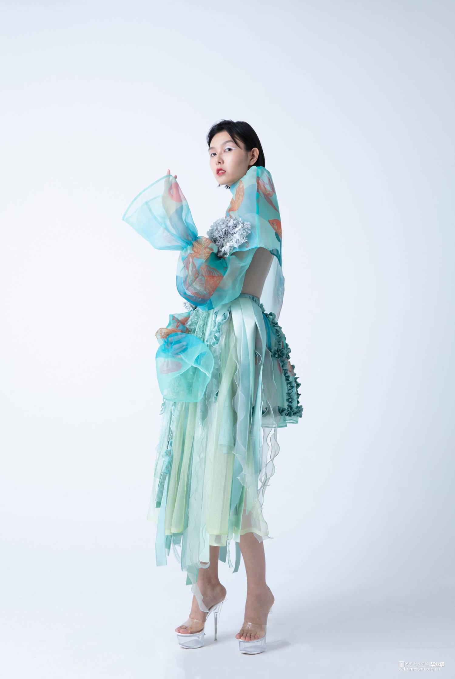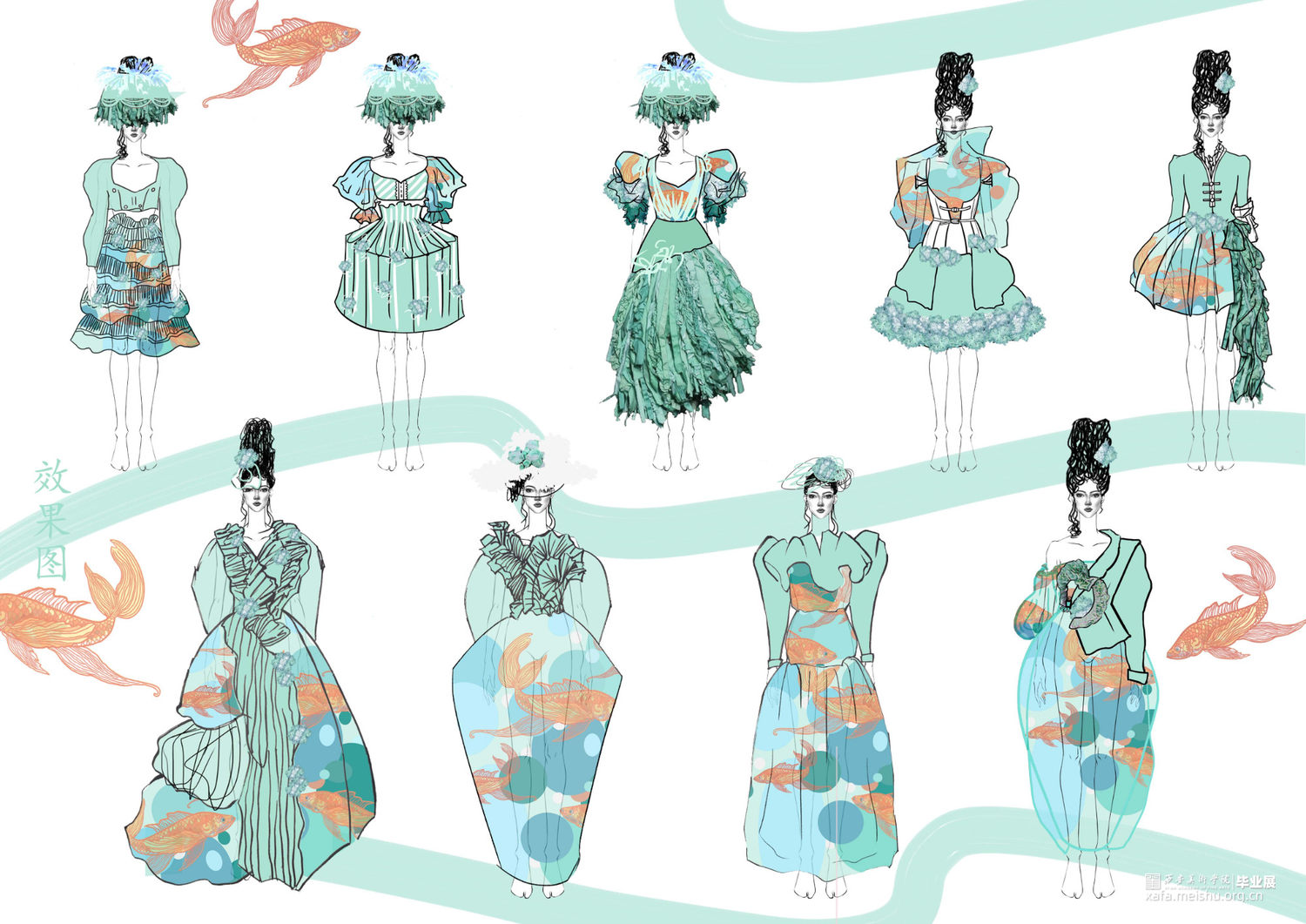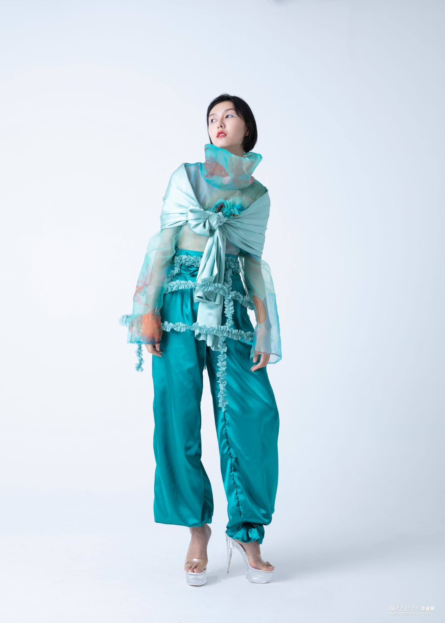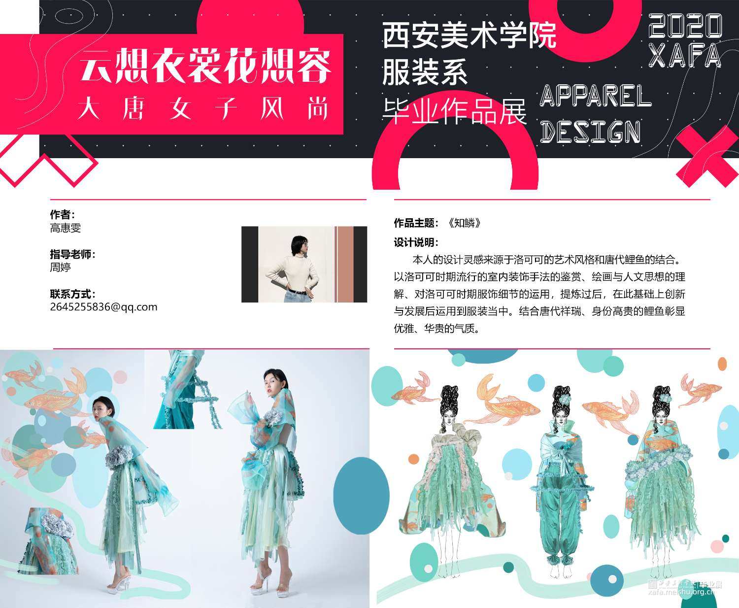 以洛可可艺术和大唐盛世之间的异曲同工之处作为设计灵感来源。在不同层次的青色里揉进橙红充分的展现了大唐风采和洛可可时期人们崇尚自然的风格。作品做为时代的缩影,“赤鯶公”遨游其中,它身上的每一片鱼鳞都藏着一段历史。