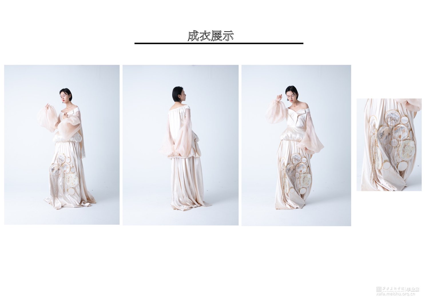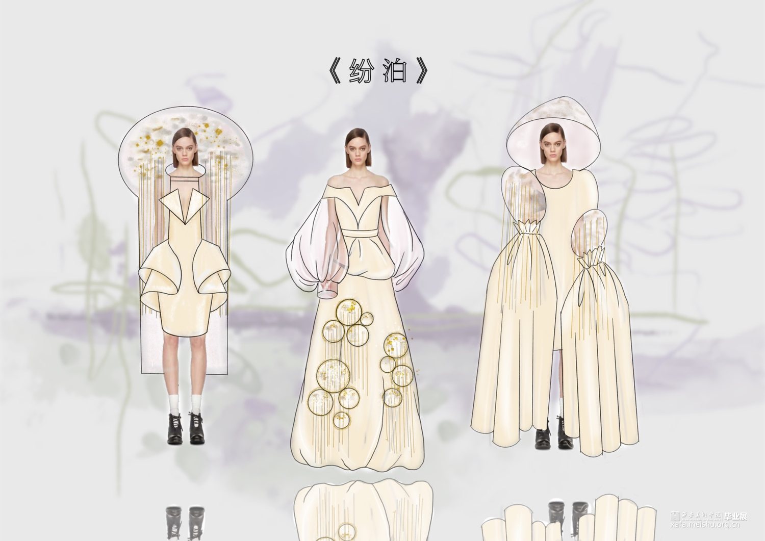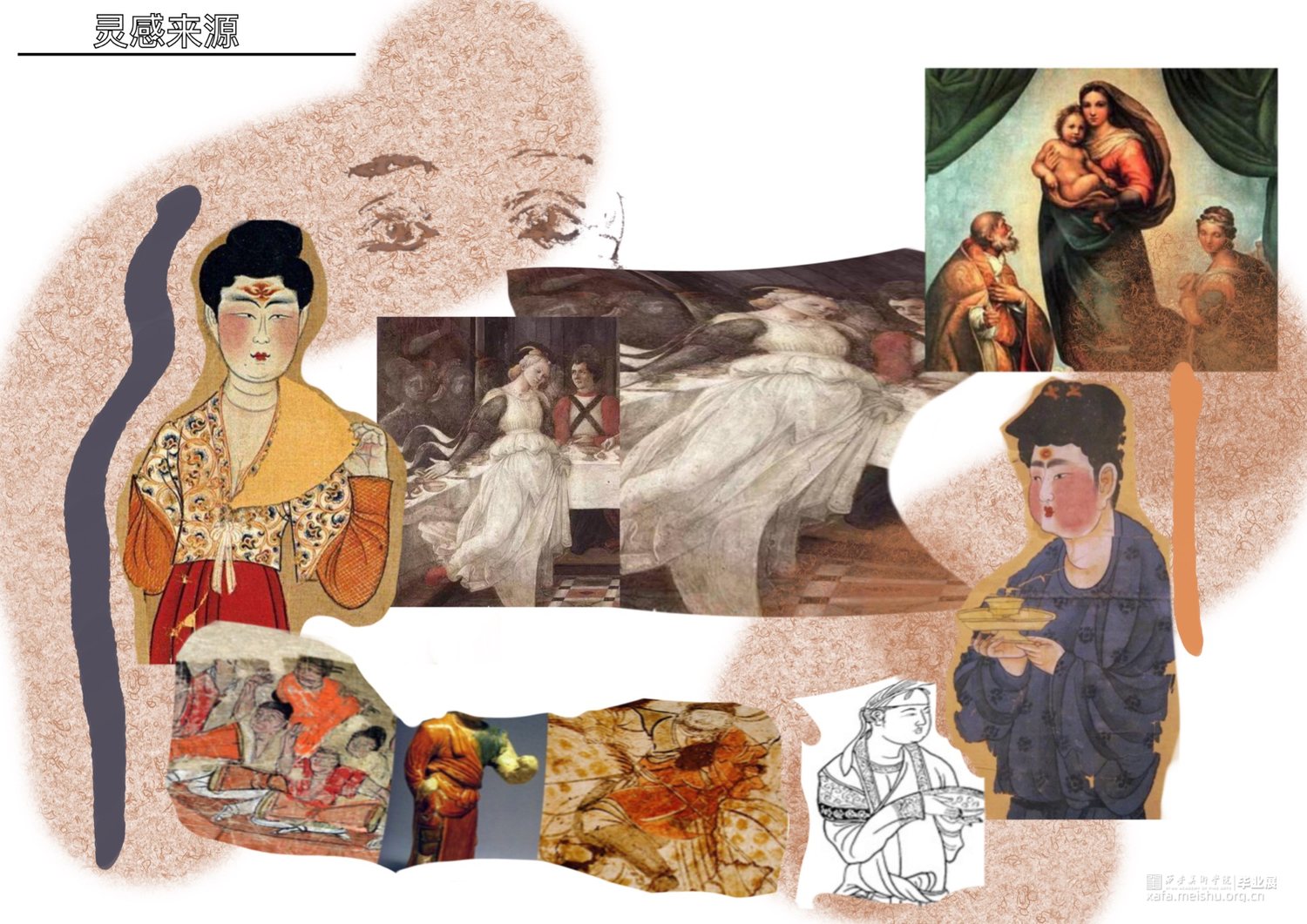 灵感来源于唐代与文艺复兴时期女性的服饰变化,盛唐和文艺复兴都是比较典型的繁荣时期。受新航路开辟对政治经济对影响,二者在女性服饰形态上有很多相似之处,中西文化的结合作为灵感来源。