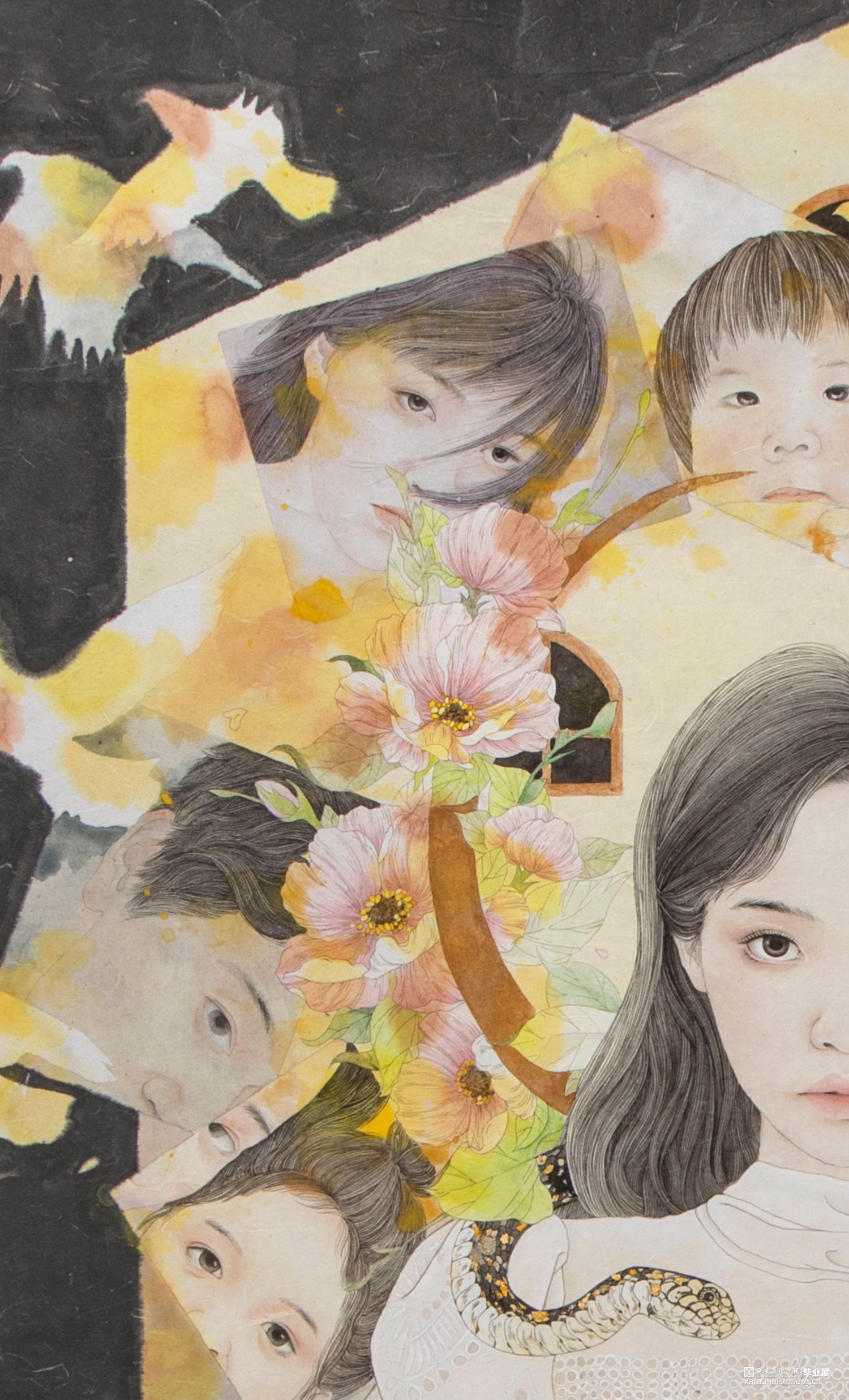整幅画希望分成两层空间:一个是前面的人物真实空间;一个是作为后背景碎片化展示的幻象空间,营造一种镜面感,既是我对过往记忆中对我产生影响的人或物也是笼罩着我与妹妹的跟高一层的关系。