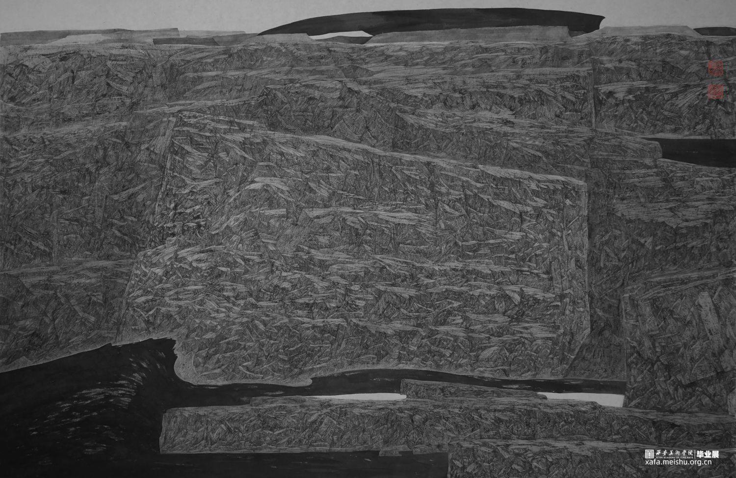 这幅作品是我在近期创作的毕业作品。作品为横构图、纸本水墨。作品采用了新颖的语言形式,在应用传统技法的基础上加入了当代元素,兼工带写地表现了高大冷峻的礁石山崖和奔涌的重色海浪。