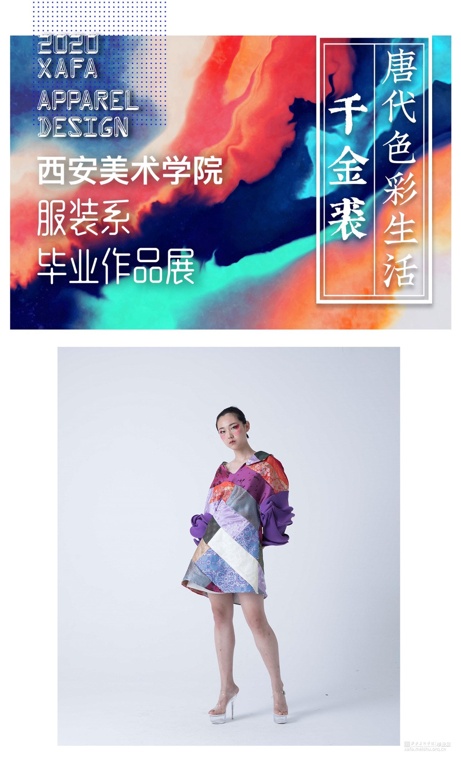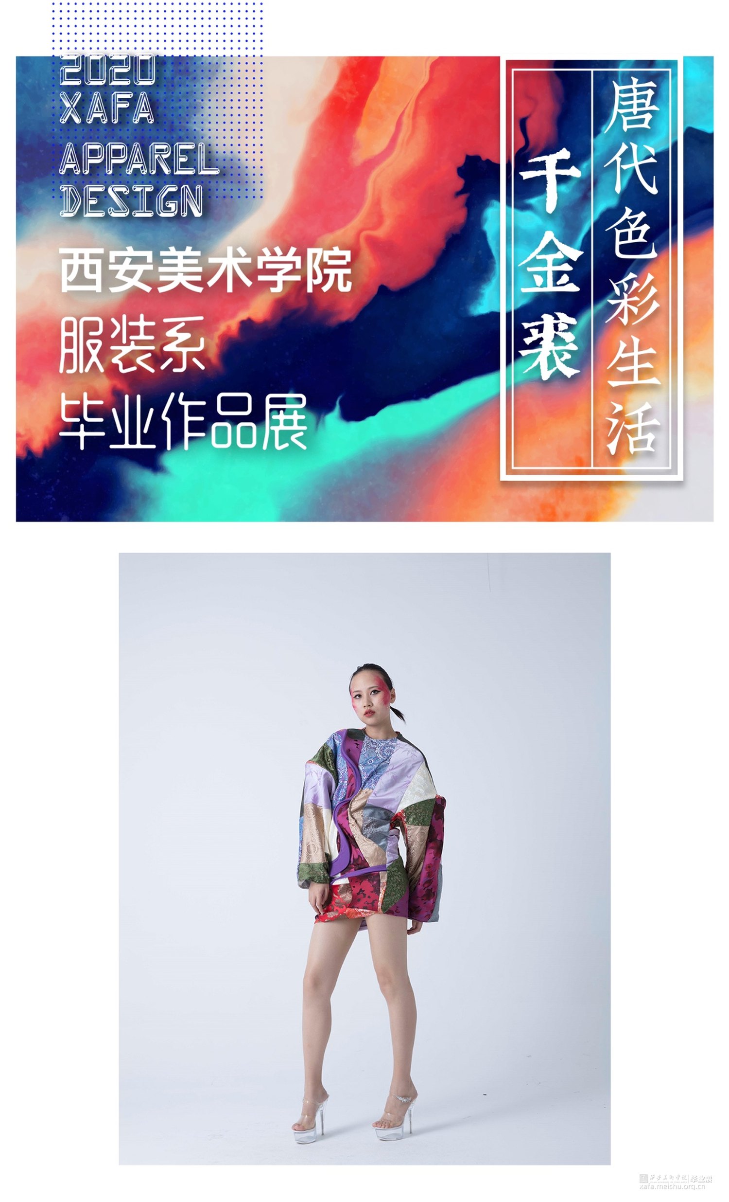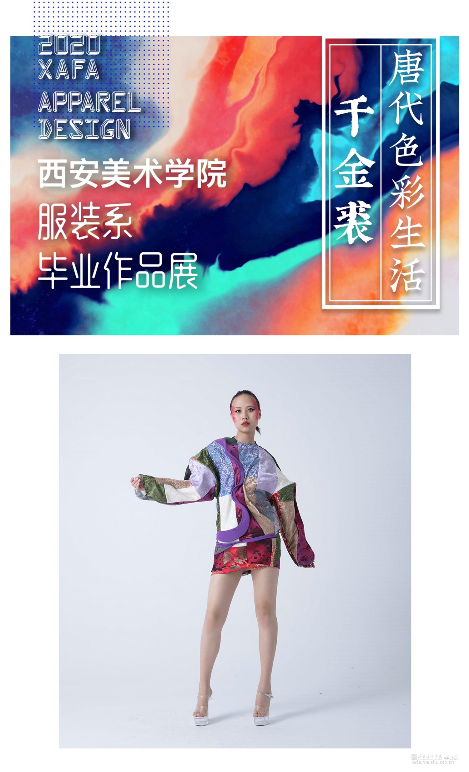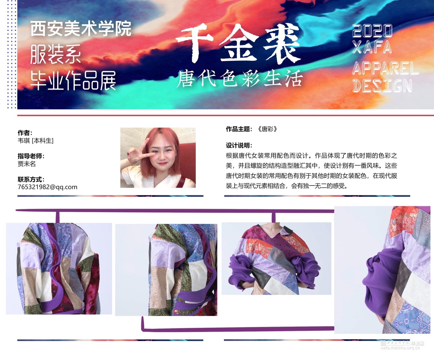根据唐代女装常用配色而设计。作品体现了唐代时期的色彩之美,并且螺旋结构造型融汇其中,别有一番风味。