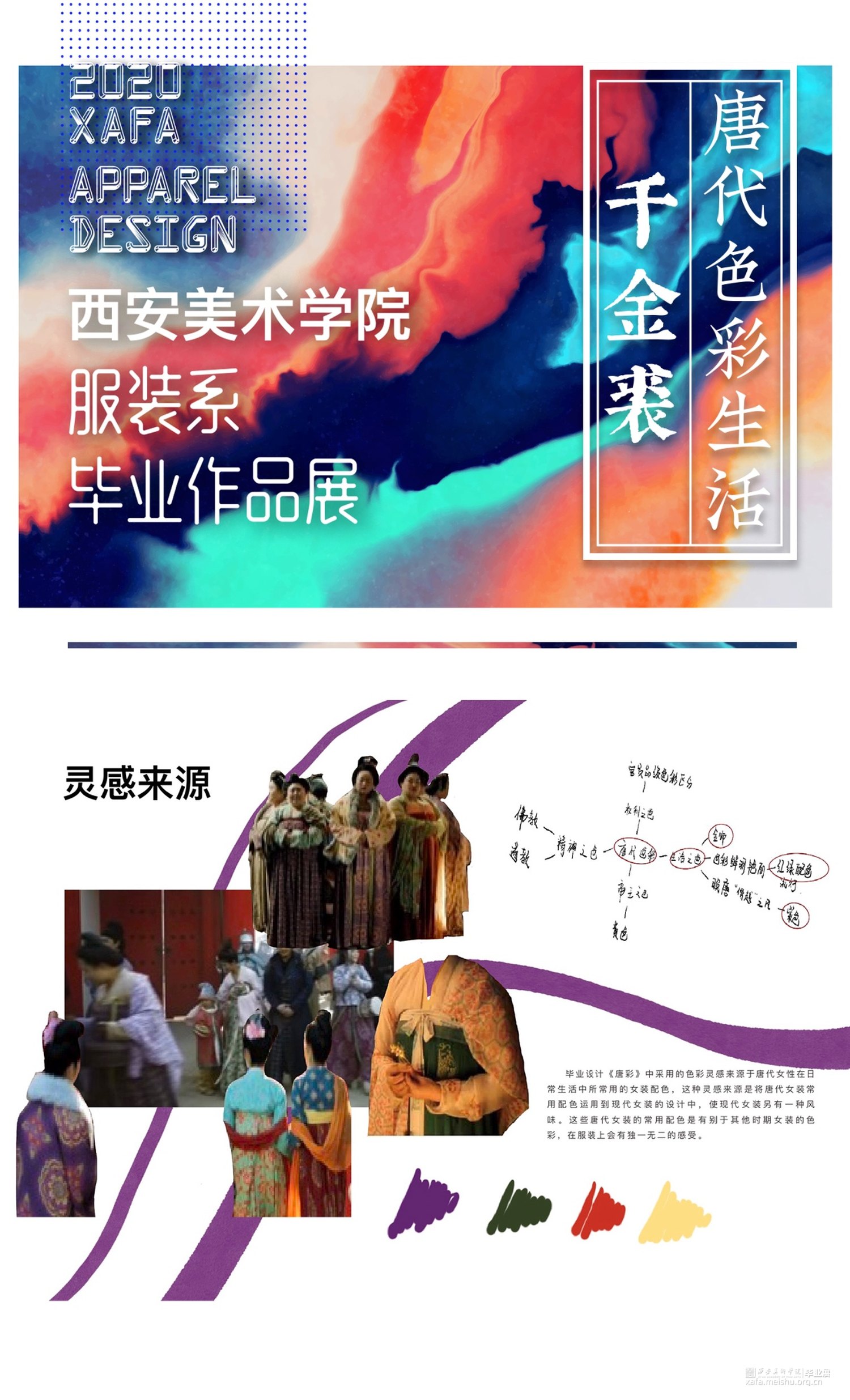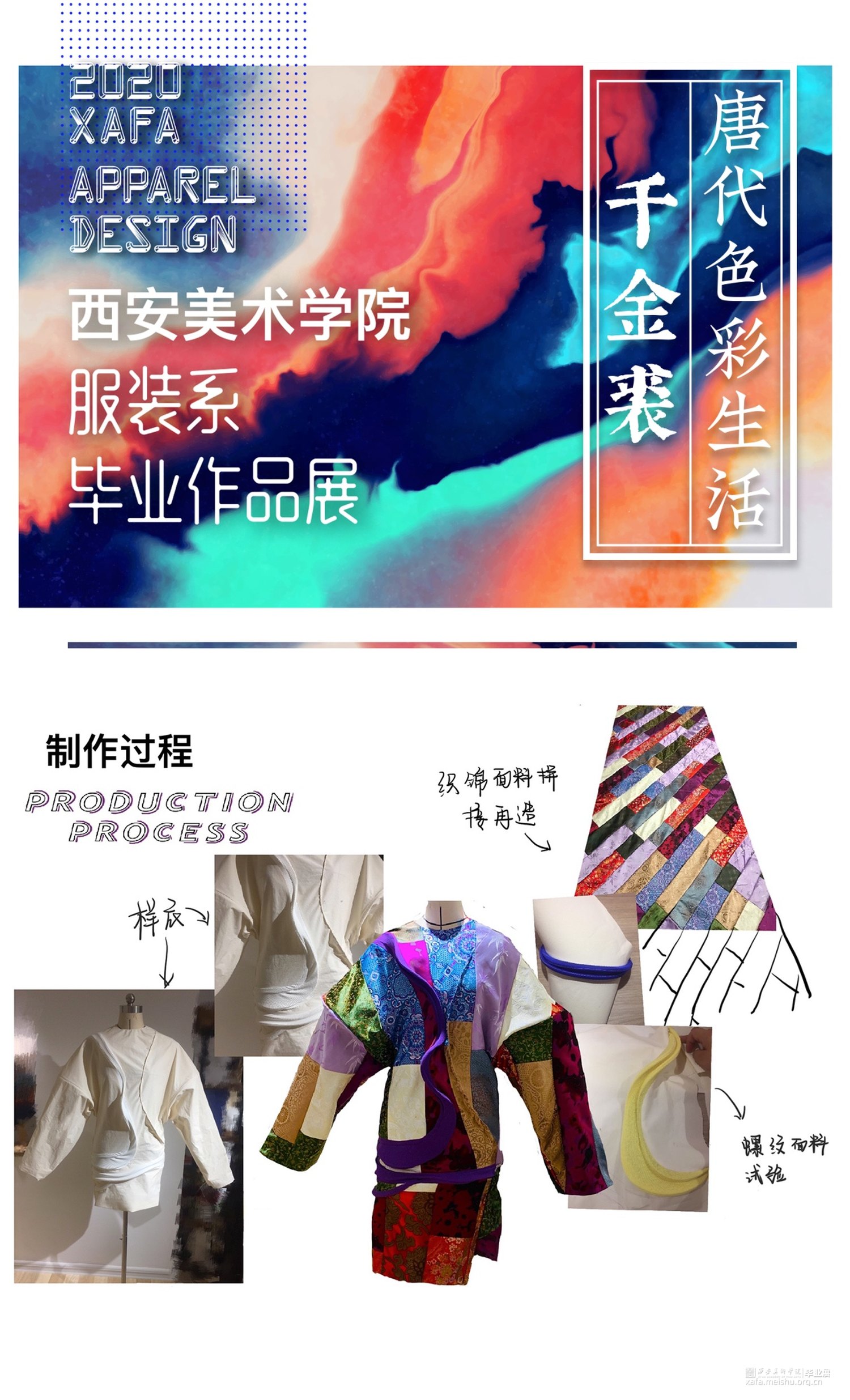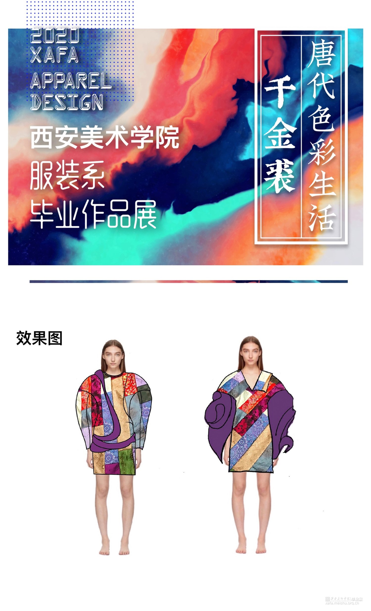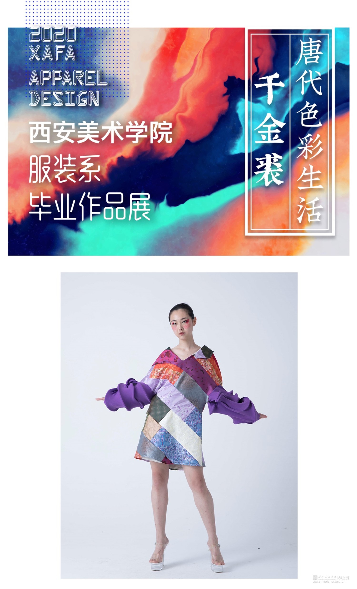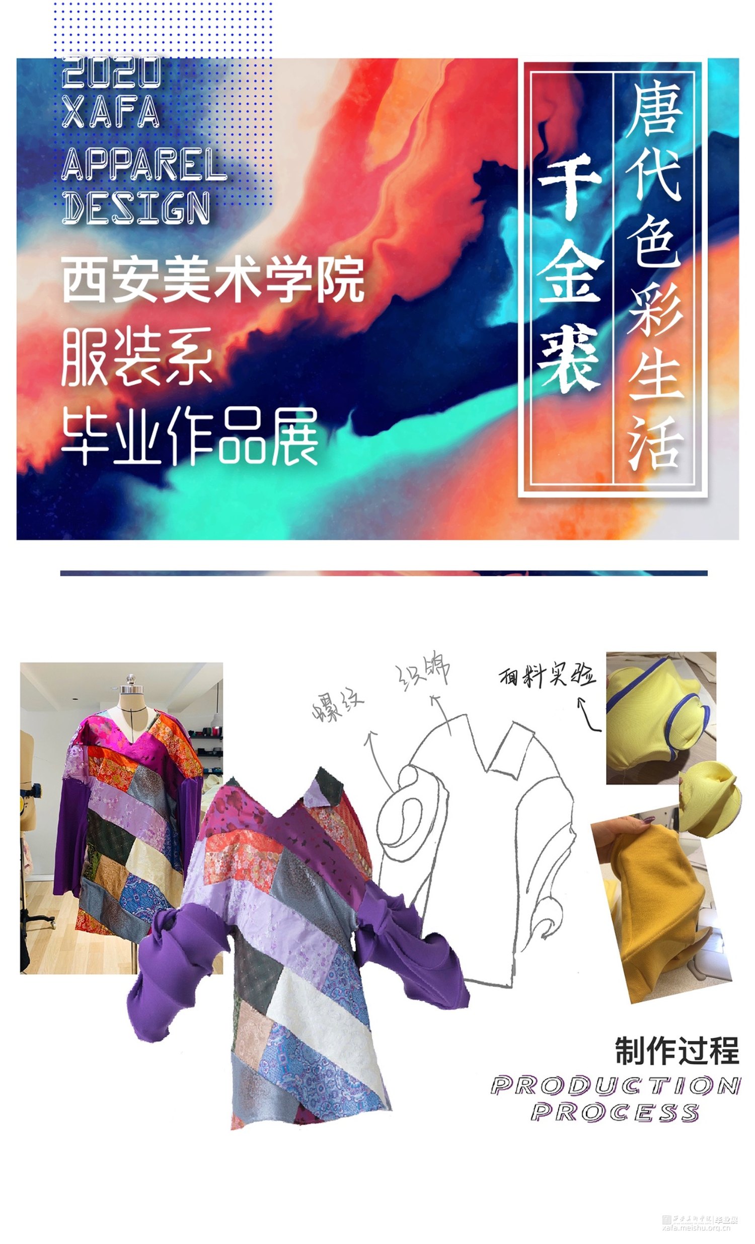 根据唐代女装常用配色而设计。作品体现了唐代时期的色彩之美,并且螺旋结构造型融汇其中,别有一番风味。