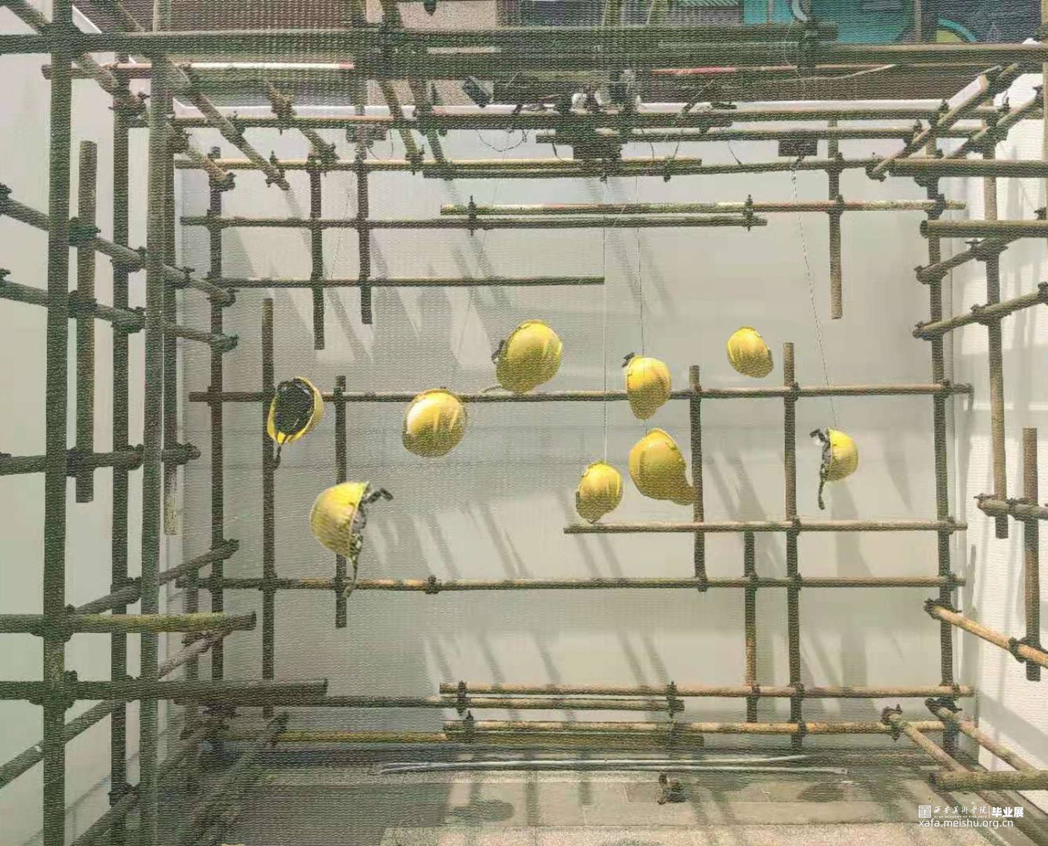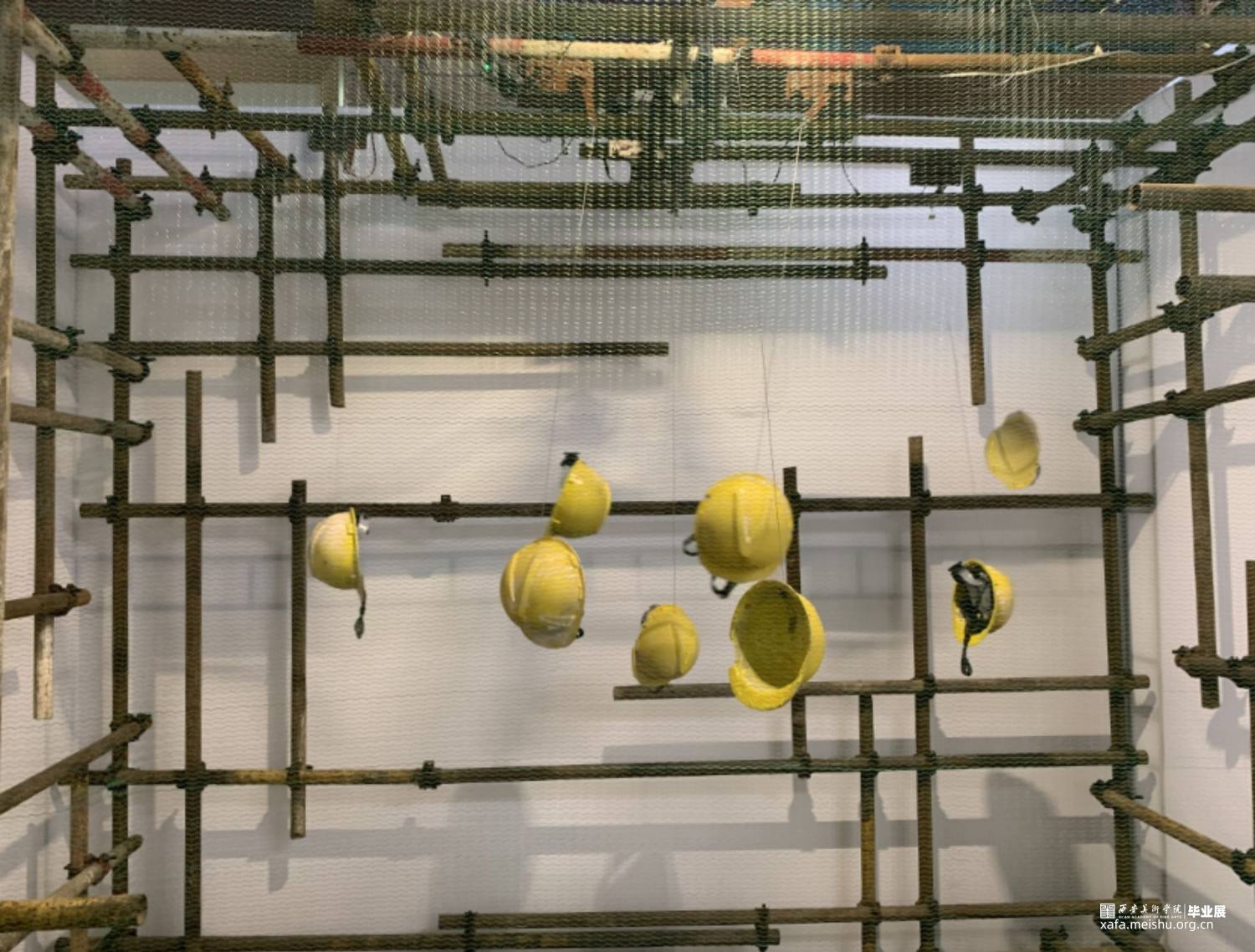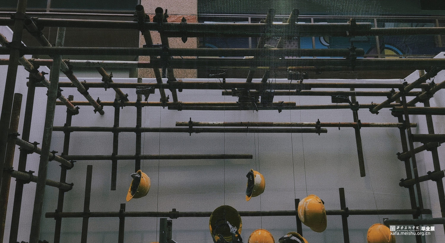 作品框架由工地架子管搭成,加入解构元素设计。 这些架子管被搭建在需要的地方,存在感低、不受关注,之后又被拆走。以为临时的姿态成为永恒建筑的一部分,其中作业的工人也是这城市里隐形的人群。安全帽原本起到一个保护,醒目的作用,但在社会中,不仅没有得到应有的尊重反而连最本质的保障安全作用也没有达到。作品中的安全帽由玻璃钢翻模制成,通过电机牵引不断摇晃撞击发出“砰砰”声,在长时间的碰撞下会渐渐破裂,散落碎片。