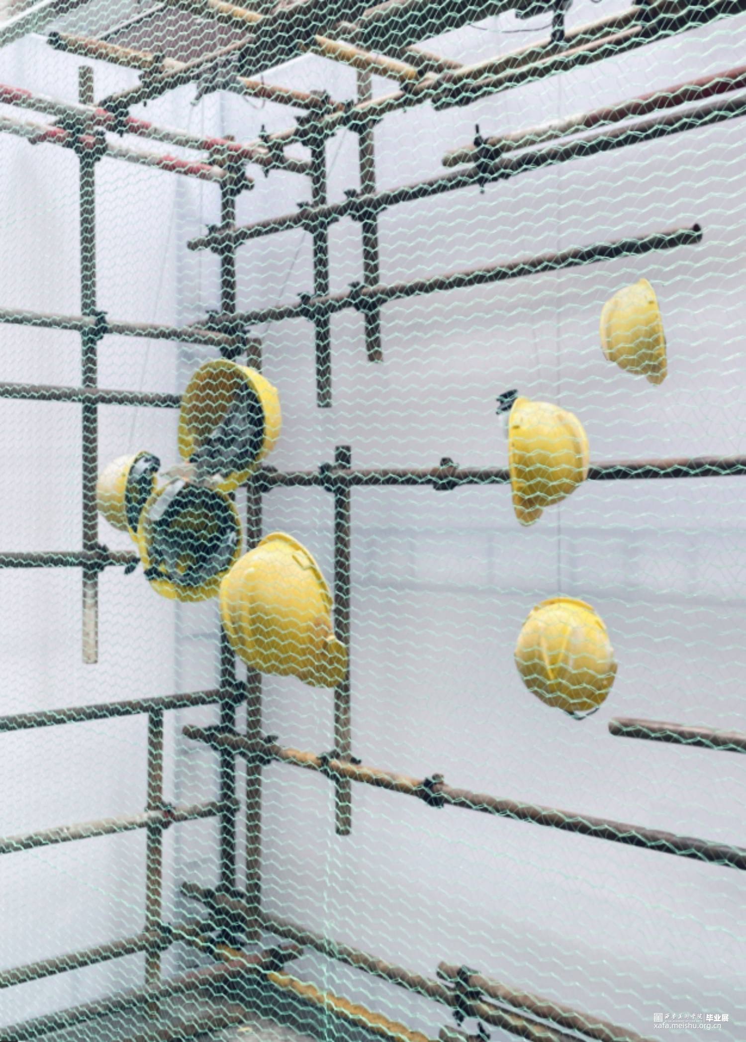 作品框架由工地架子管搭成,加入解构元素设计。 这些架子管被搭建在需要的地方,存在感低、不受关注,之后又被拆走。以为临时的姿态成为永恒建筑的一部分,其中作业的工人也是这城市里隐形的人群。安全帽原本起到一个保护,醒目的作用,但在社会中,不仅没有得到应有的尊重反而连最本质的保障安全作用也没有达到。作品中的安全帽由玻璃钢翻模制成,通过电机牵引不