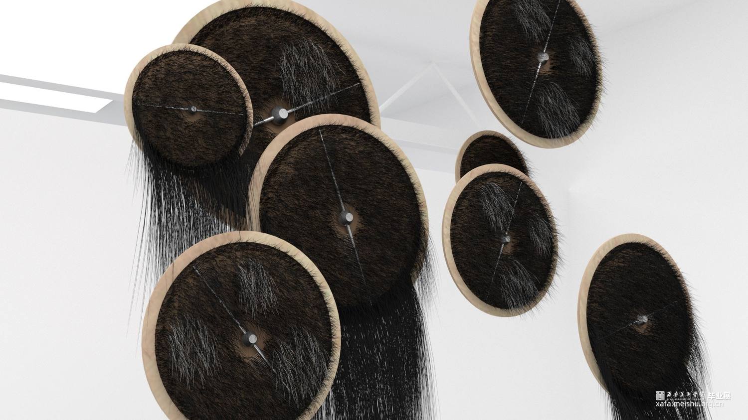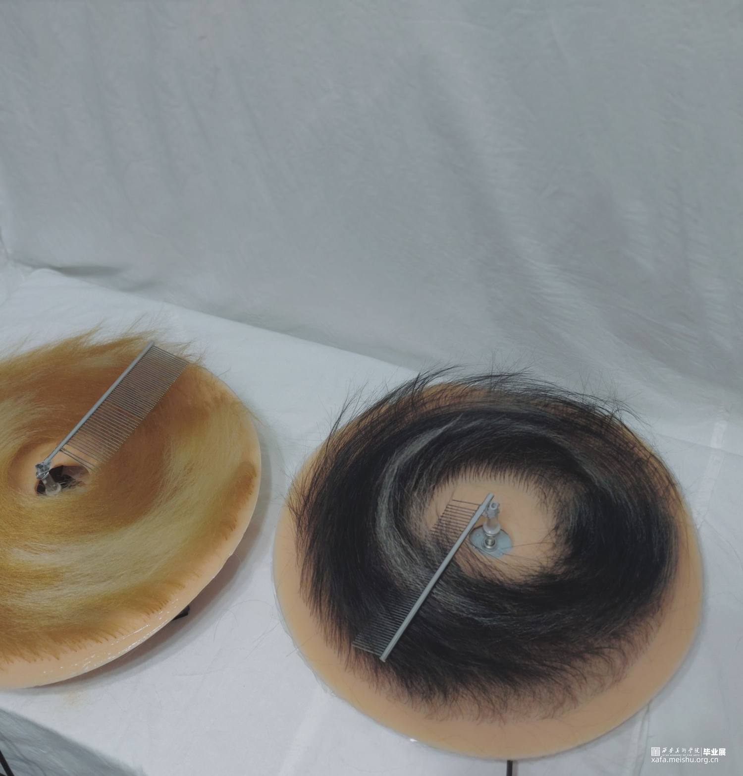 我作为创作者的同时也是第一位观众,在创作过程中,对于每一组头发的发量,一组与另一组的间距,从内圈到外圈排列的变化,头发的长度、颜色,都进行了仔细考量,将开始感性的理解通过严谨理性的制作来表现,在最后作品展现的同时,仍然能保持感性的、不容易描述的视觉感。