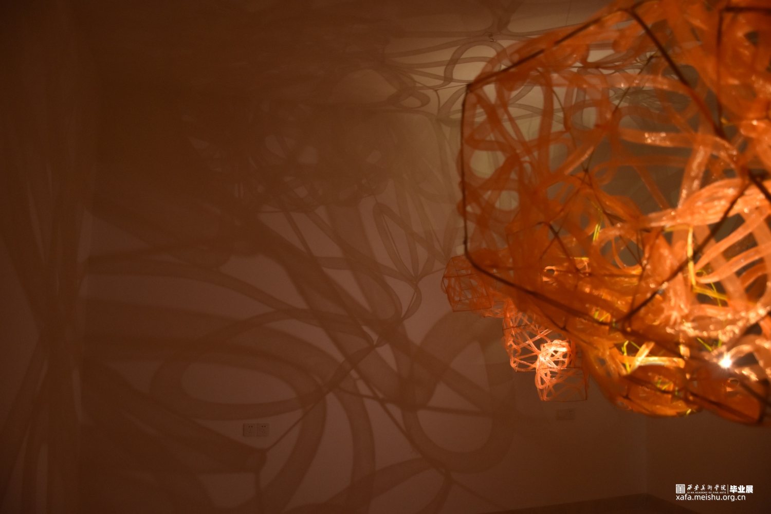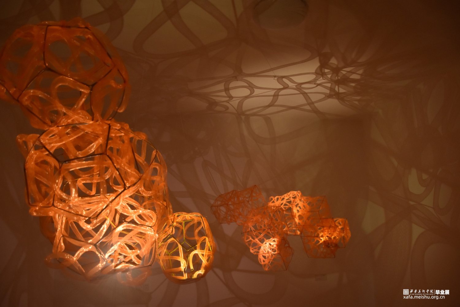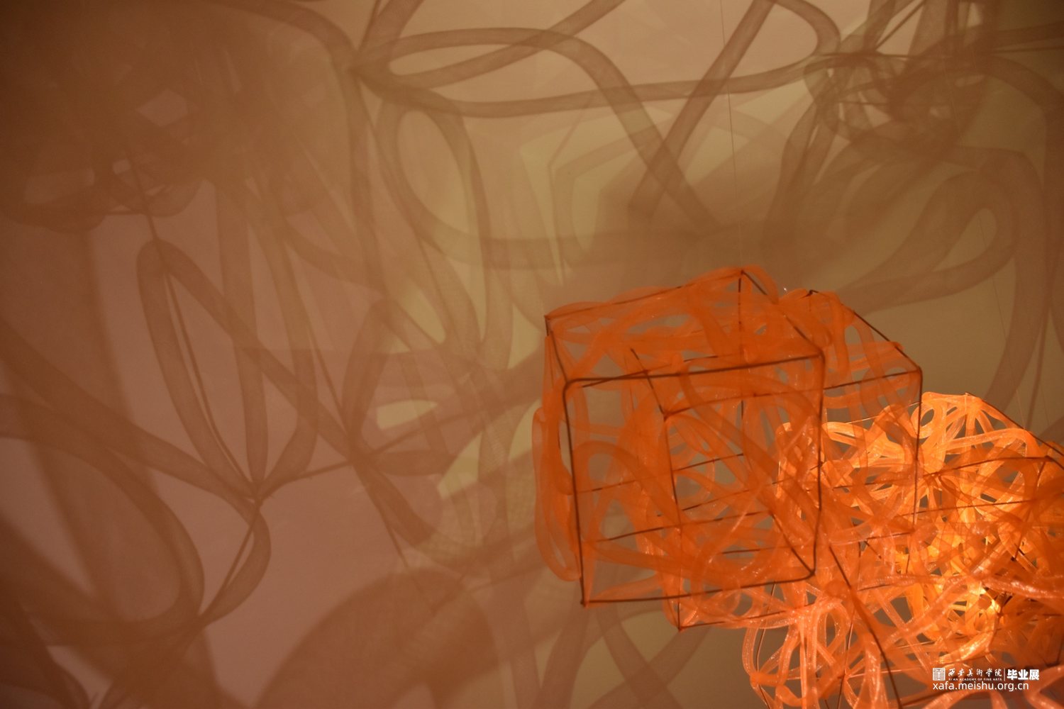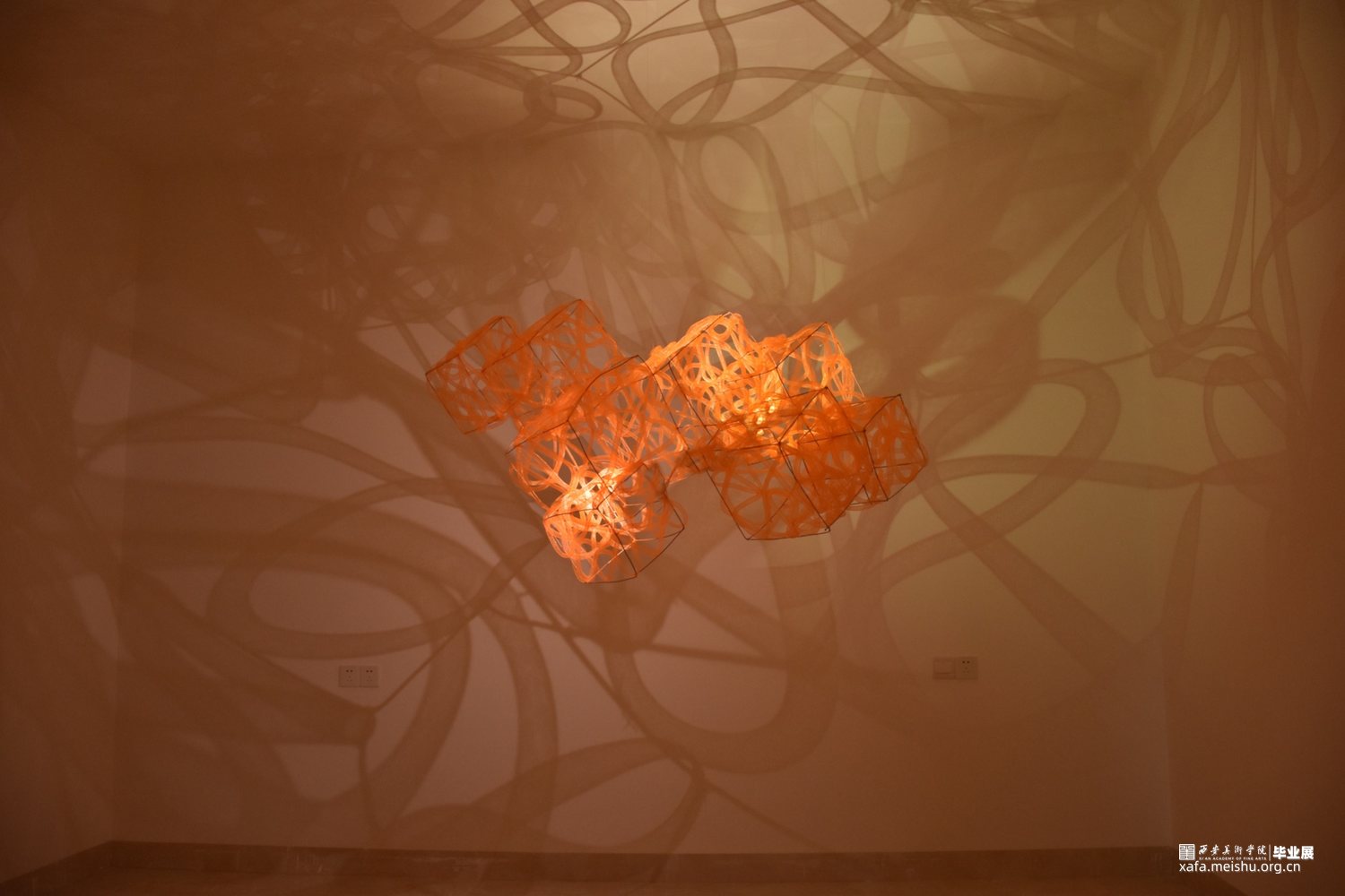 然而到最后还是选用了最初的方案,简单的几何形的组合重构与丝网管在空间中的交错缠绕,装置以投影的方式融入环境中,形成了虚与实的对比。在无序的缠绕交错中,建立一种新的秩序。毕业创作是个艰难前进的过程,是个培养人学习和工作方法的过程。有了创意和念头,有了创作的冲动,下一步就应该去放在整个空间里来考虑,然后去锤炼,去打磨,直到它确实能对观者生效,虽然十分痛苦但也有收获。