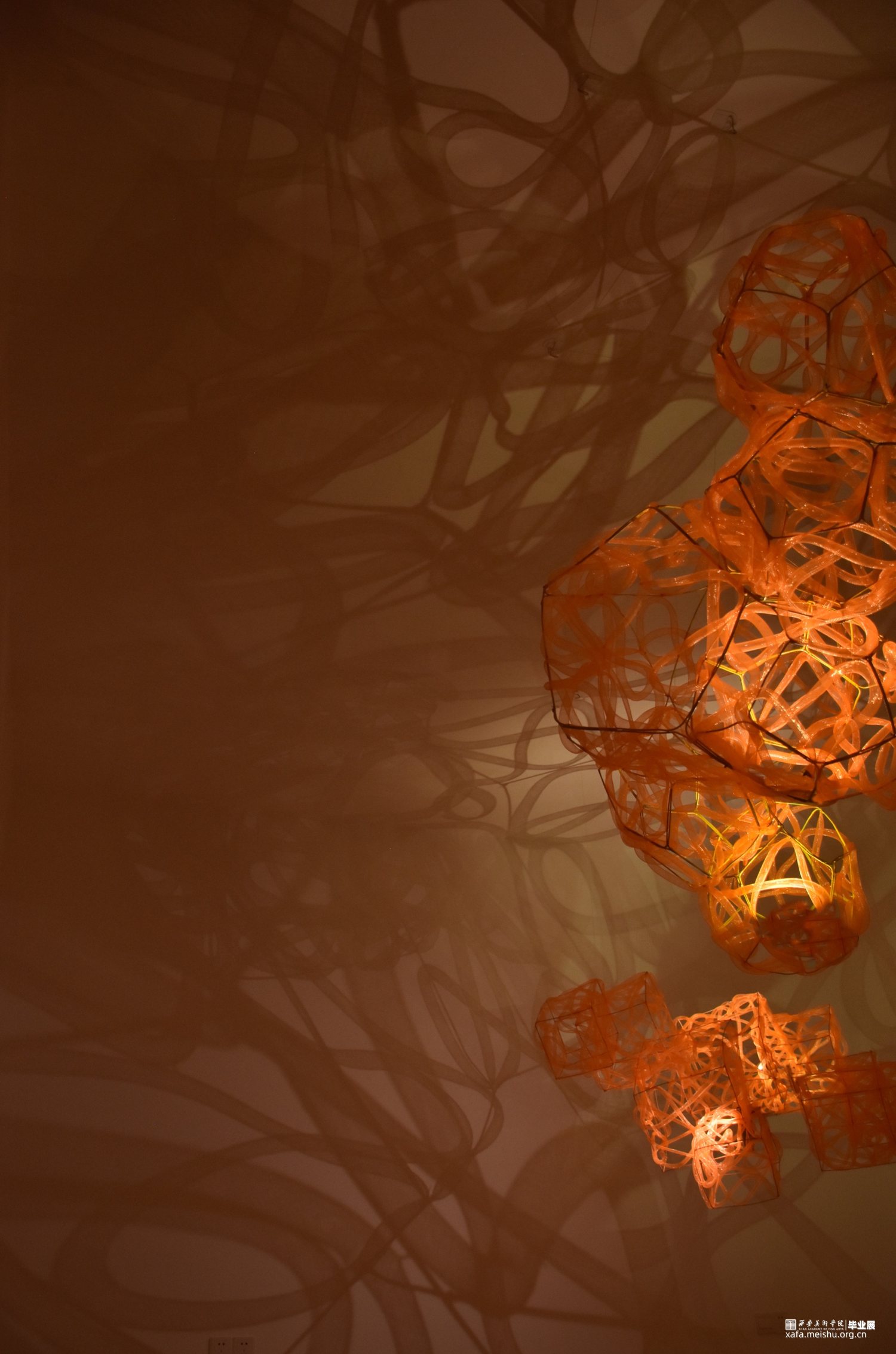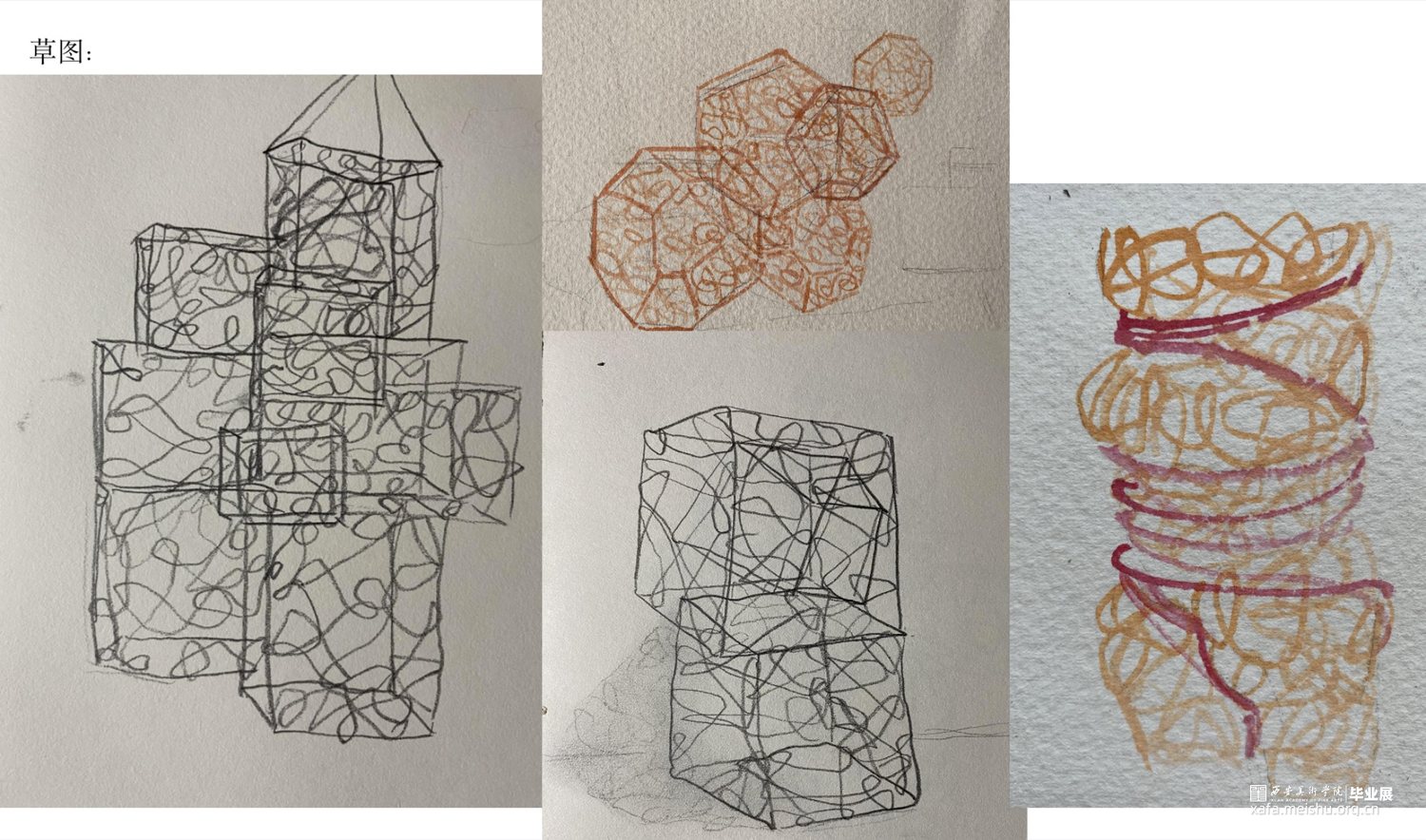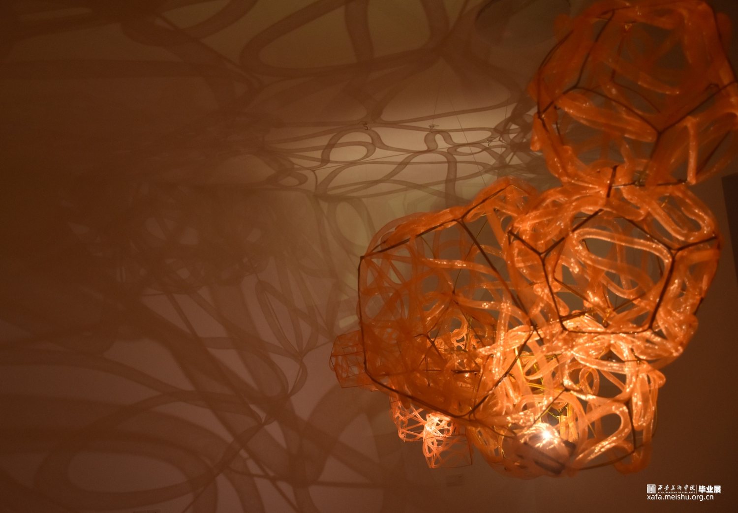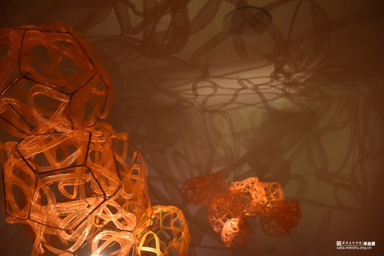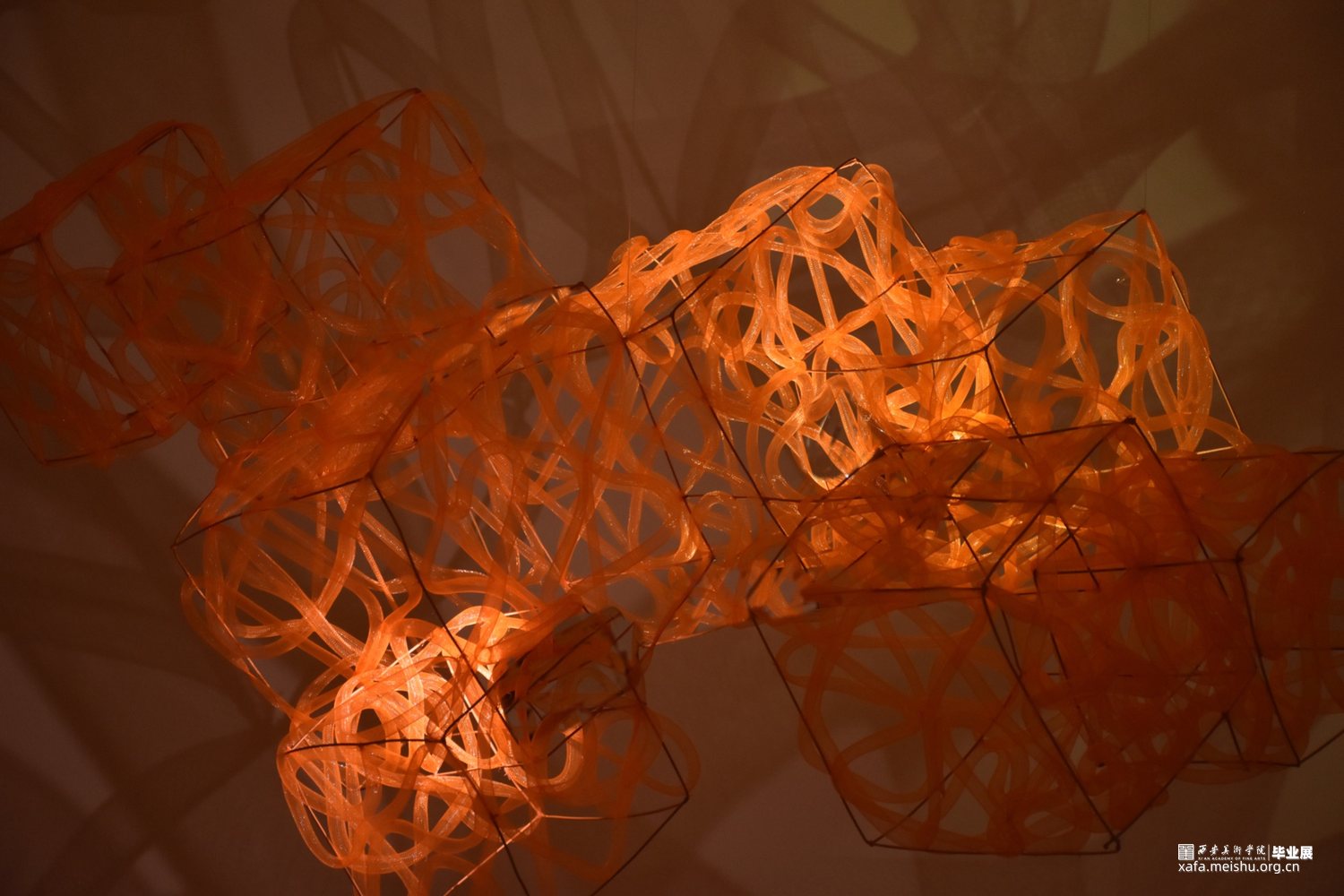 然而到最后还是选用了最初的方案,简单的几何形的组合重构与丝网管在空间中的交错缠绕,装置以投影的方式融入环境中,形成了虚与实的对比。在无序的缠绕交错中,建立一种新的秩序。毕业创作是个艰难前进的过程,是个培养人学习和工作方法的过程。有了创意和念头,有了创作的冲动,下一步就应该去放在整个空间里来考虑,然后去锤炼,去打磨,直到它确实能对观者生效,虽然十分痛苦但也有收获。