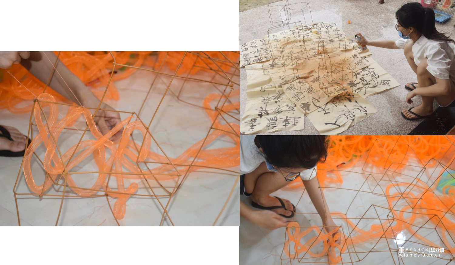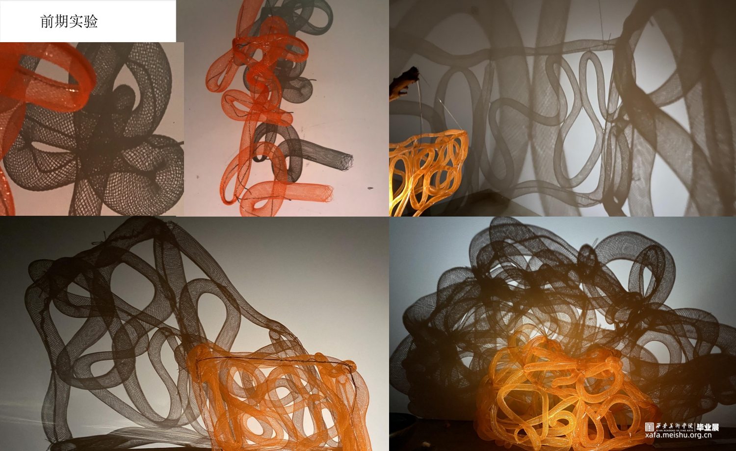 在毕业创作刚开始的时候,选中了丝网管这个材料,易变形、通透,一般运用在服装上,在装置作品中的运用较少。在创作的过程,经过了许多次的材料试验,然而每一次也都不一定是向前走的,有时甚至是失败了退回起点。但是我觉得这个是一个十分痛苦却又必要的过程,是一个在说服我自己的过程,与作品磨合的过程。